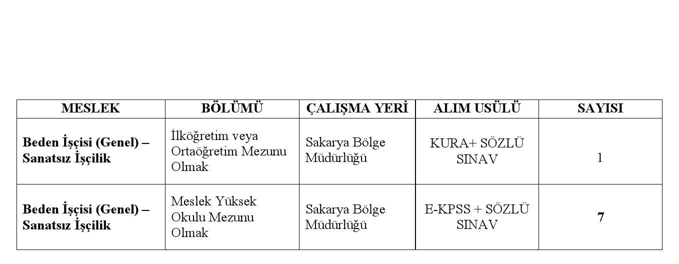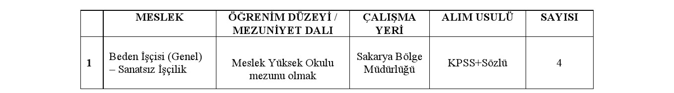 Genel Müdürlüğümüze bağlı Sakarya Bölge Müdürlüğümüzde istihdam edilmek üzere, Kamu Kurum ve Kuruluşlarına Eski Hükümlü veya Terörle Mücadele Malul Sayılmayacak Şekilde Yararlananların İşçi Olarak Alınmasında Uygulanacak Usul ve Esaslar Hakkında Yönetmelik kapsamında Türkiye İş Kurumu (İŞKUR) üzerinden 4857 sayılı İş Kanununa tabi belirsiz süreli iş sözleşmesi ile çalıştırılmak üzere daimi Eski Hükümlü/TMY işçi alımı yapılacaktır.