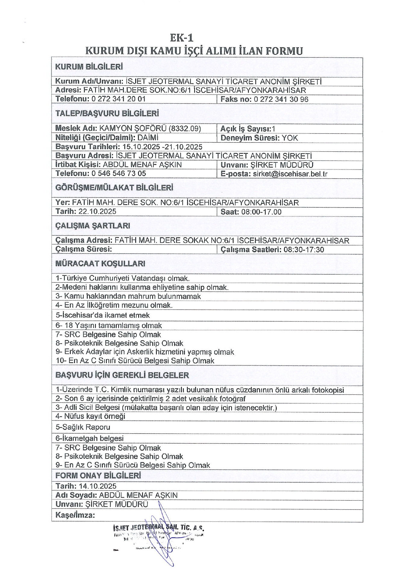 Ana sayfaDaimi İşçi İlanları Afyonkarahisar İSJET 1 İşçi Alacak Afyonkarahisar İSJET 1 İşçi Alacak. Son başvuru tarihi 21 Ekim 2025 Kaynak : İşkur İlan Giriş : 15 Ekim 2025 00:15, Son Güncelleme : 15 Ekim 2025 01:17 Yazdır Yorumlar (0) Abone Ol
