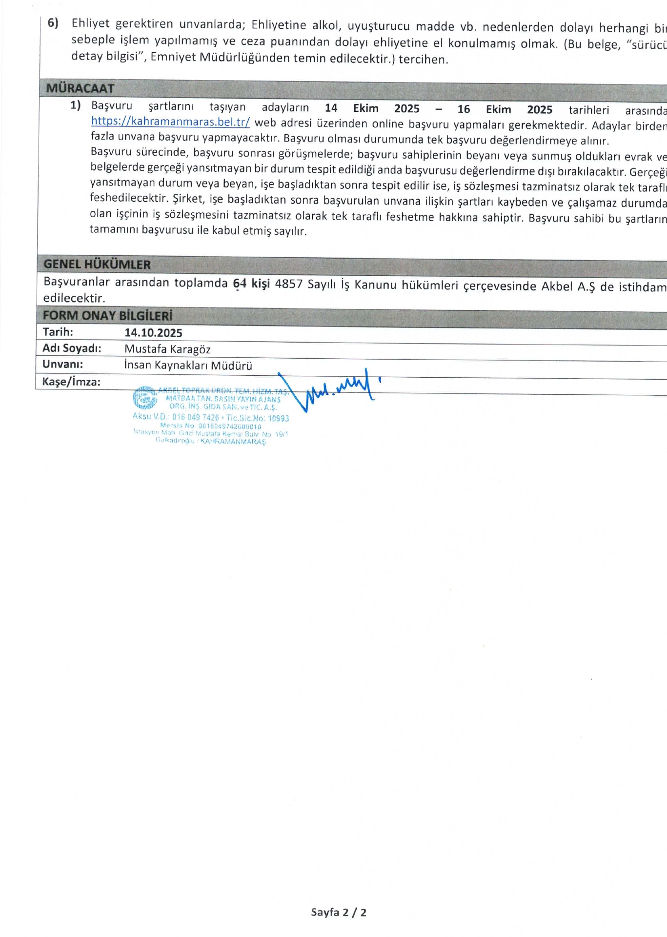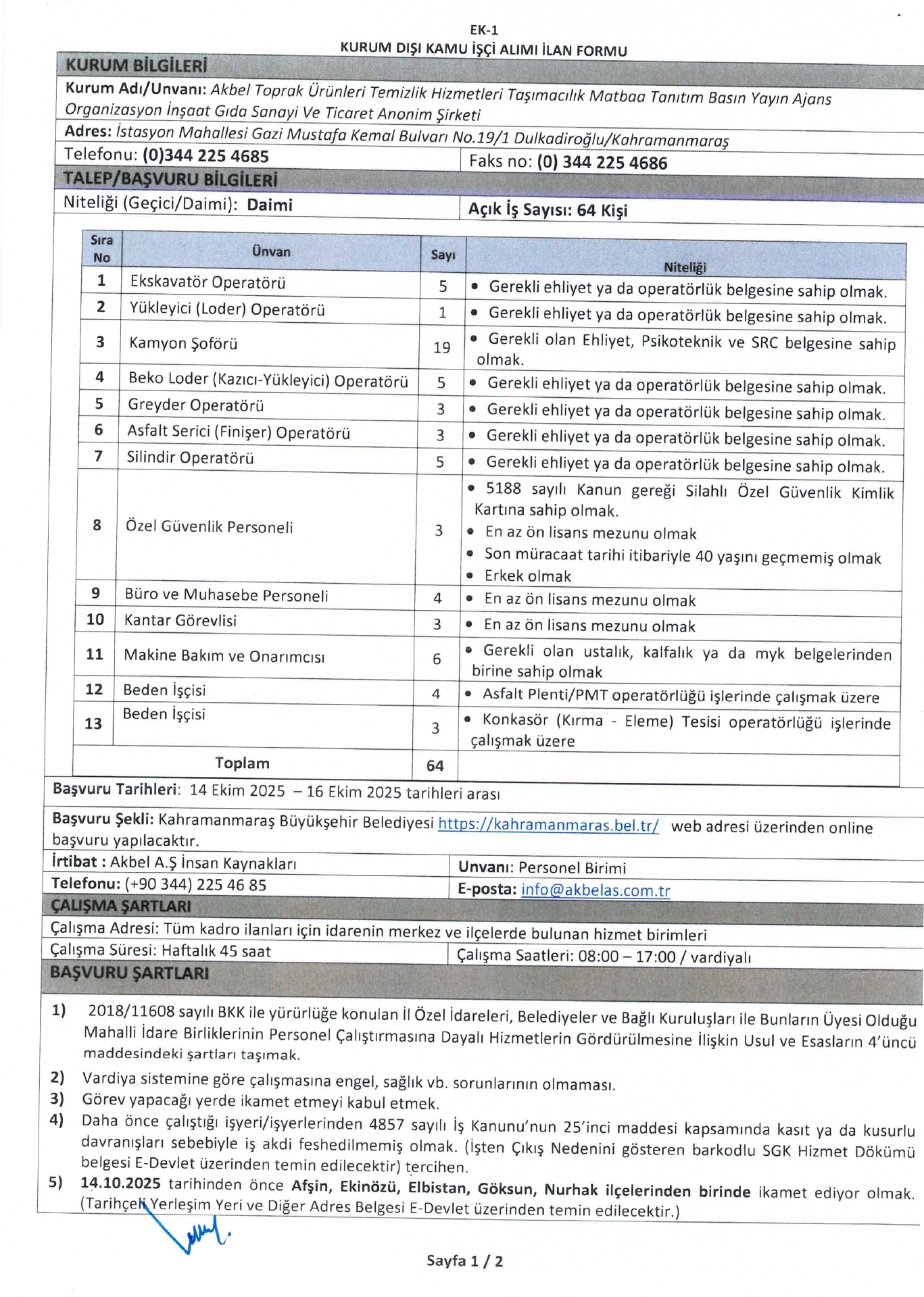 Ana sayfaDaimi İşçi İlanları Kahramanmaraş Akbel 64 İşçi Alacak Kahramanmaraş Akbel 64 İşçi Alacak. Son başvuru tarihi 16 Ekim 2025 Kaynak : İşkur İlan Giriş : 15 Ekim 2025 00:18, Son Güncelleme : 15 Ekim 2025 01:16 Yazdır Yorumlar (0) Abone Ol