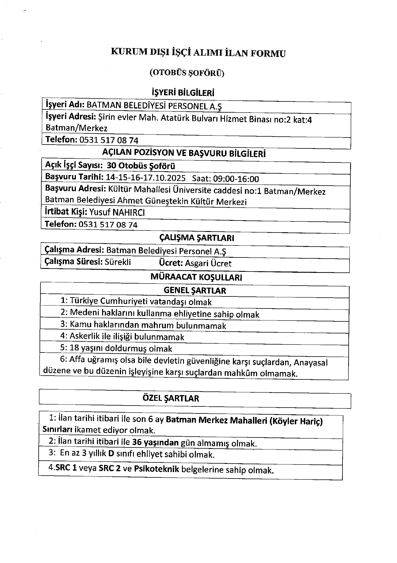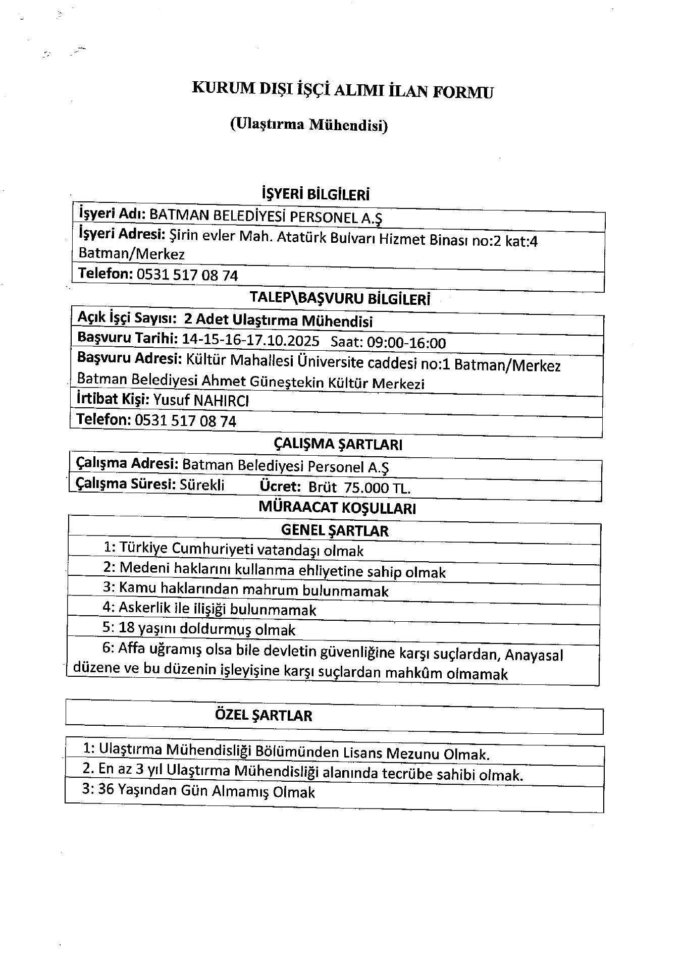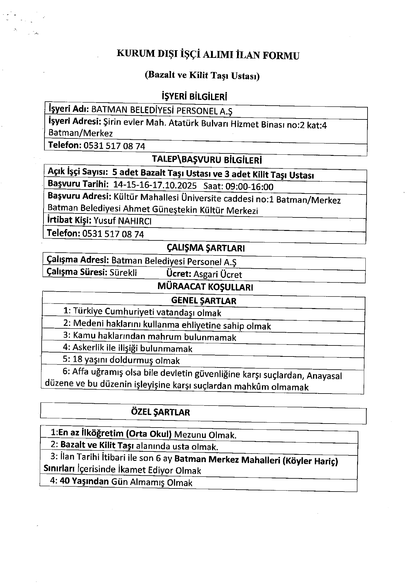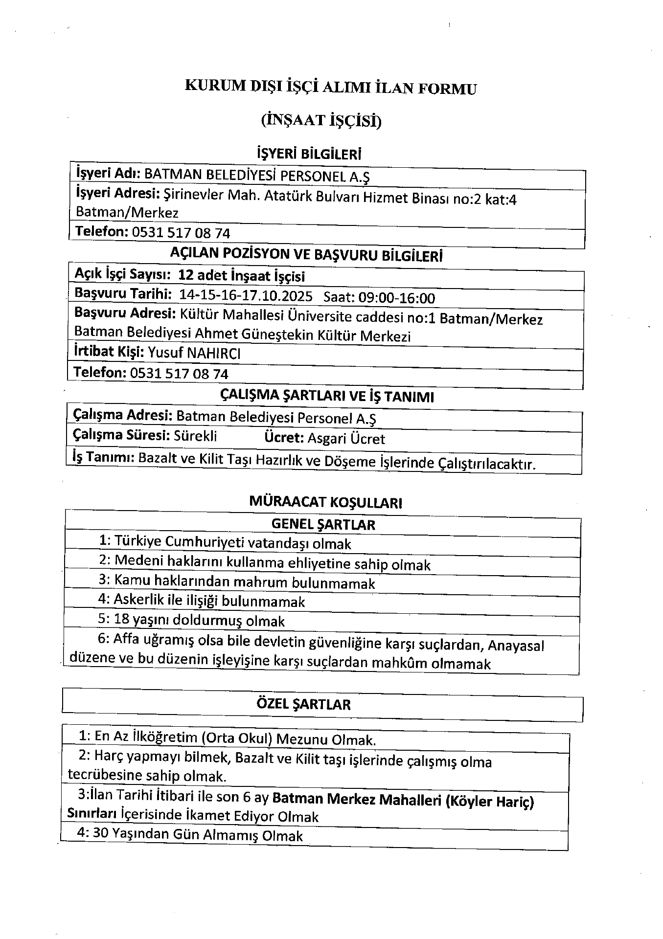 Batman Belediyesi 57 İşçi Alacak. Son başvuru tarihi 17 Ekim 2025