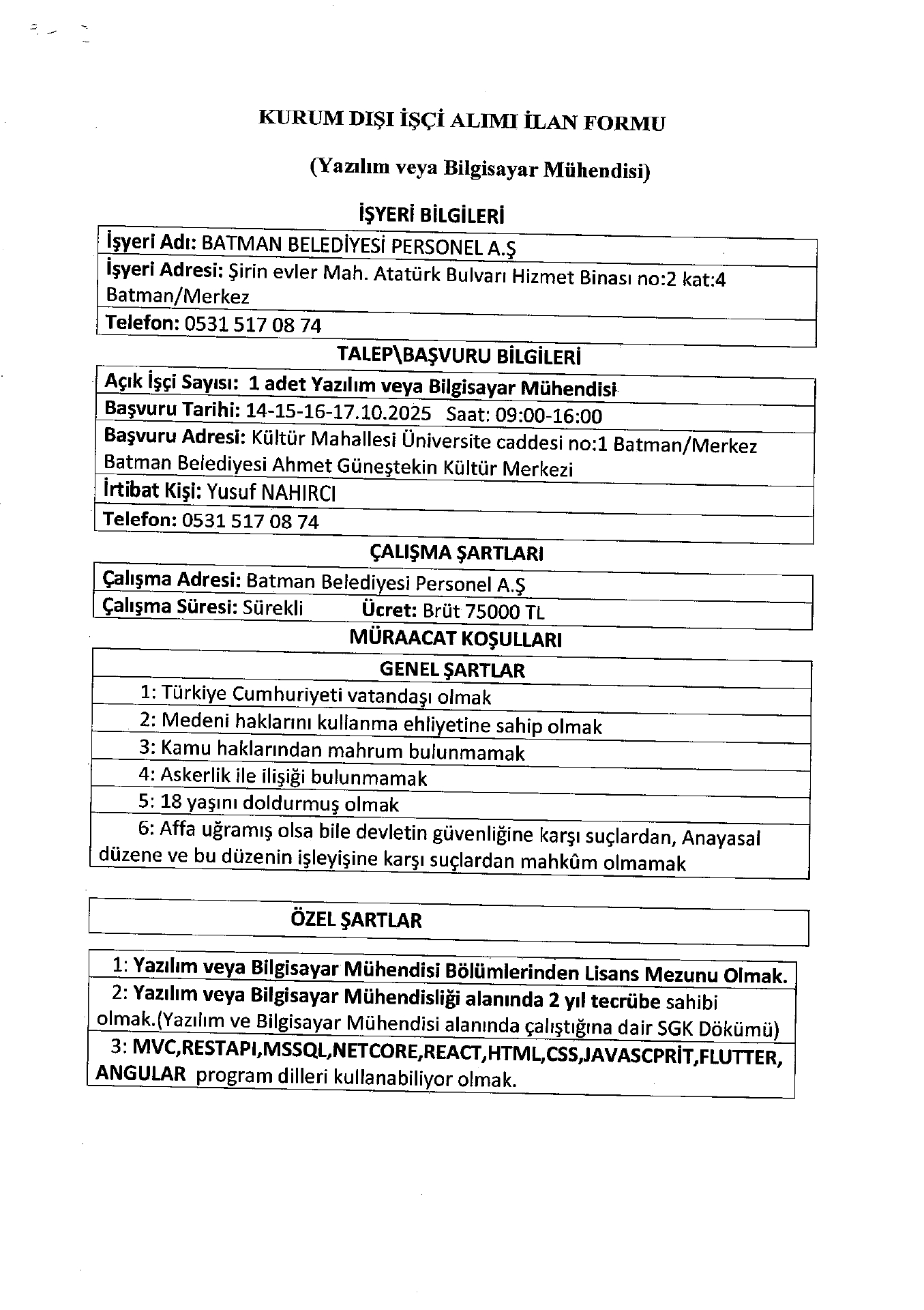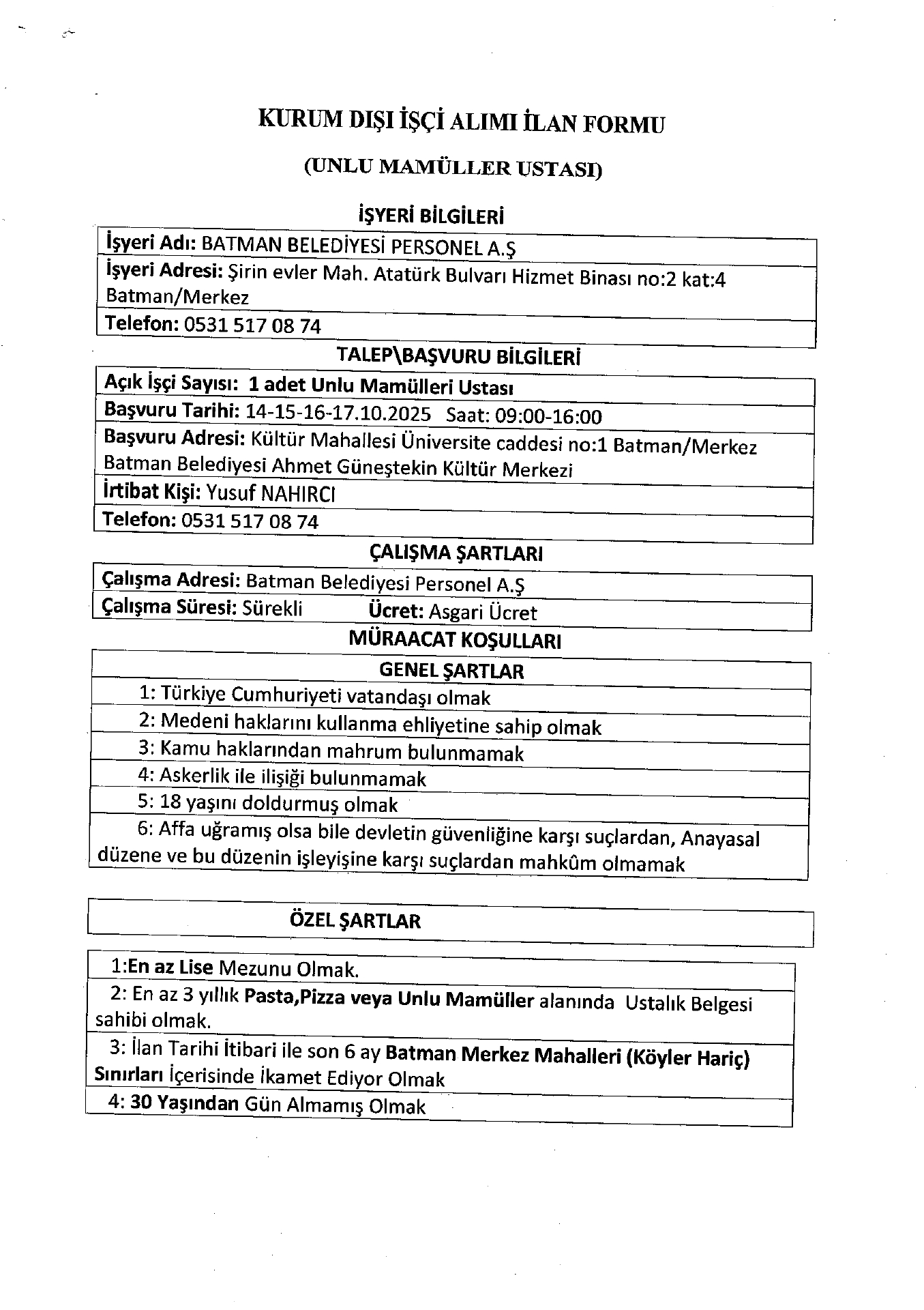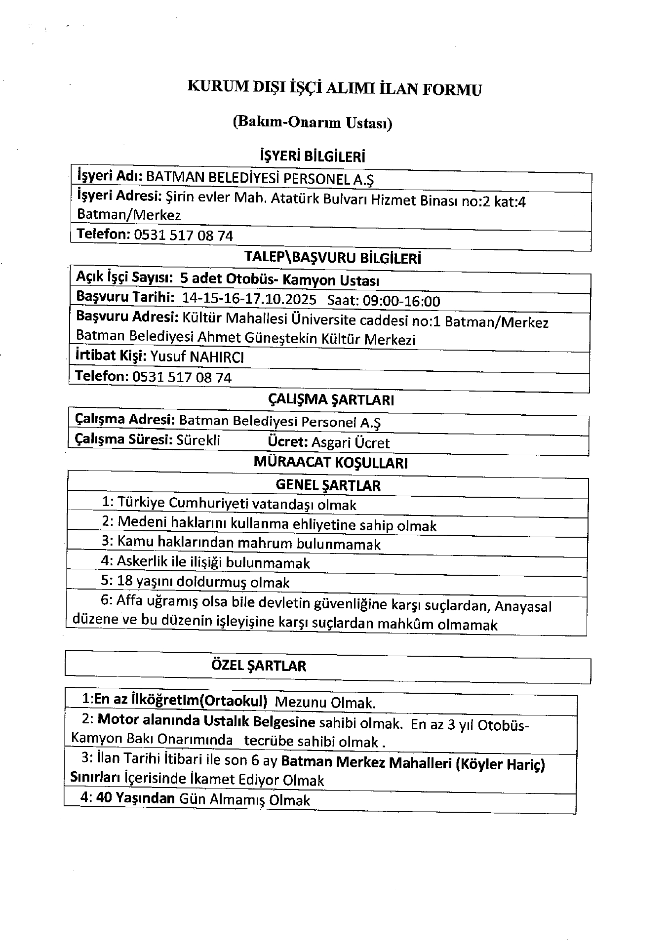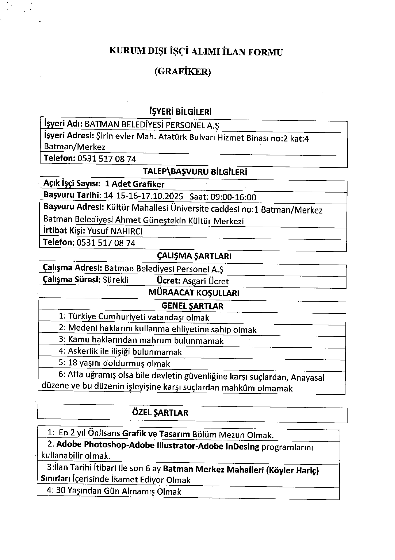 Batman Belediyesi 57 İşçi Alacak. Son başvuru tarihi 17 Ekim 2025