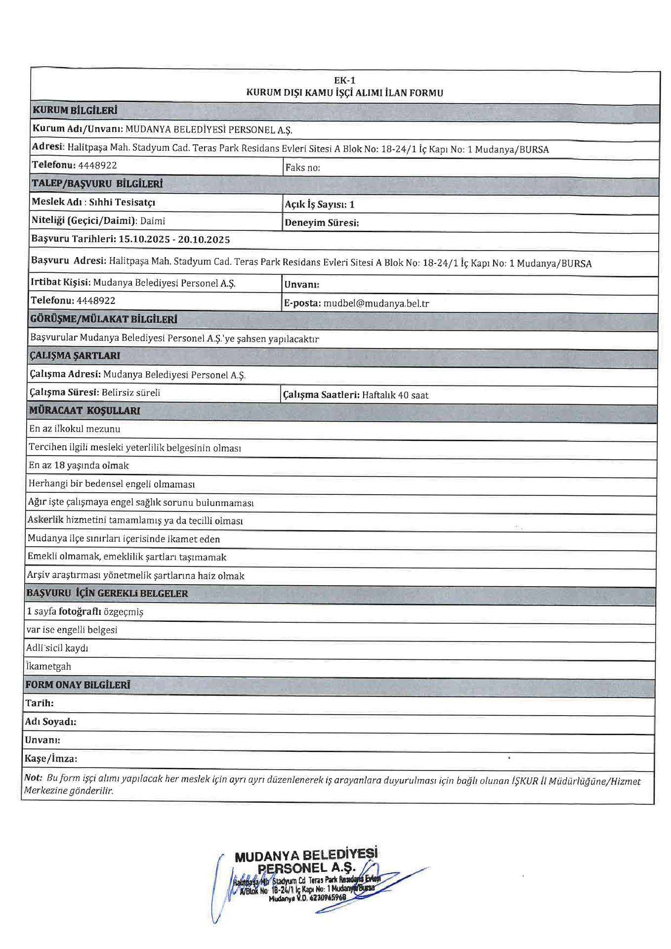 Ana sayfaDaimi İşçi İlanları Bursa Mudanya Belediyesi 1 İşçi Alacak Bursa Mudanya Belediyesi 1 İşçi Alacak. Son başvuru tarihi 20 Ekim 2025 Kaynak : İşkur İlan Giriş : 15 Ekim 2025 00:33, Son Güncelleme : 15 Ekim 2025 01:11 Yazdır Yorumlar (0) Abone Ol