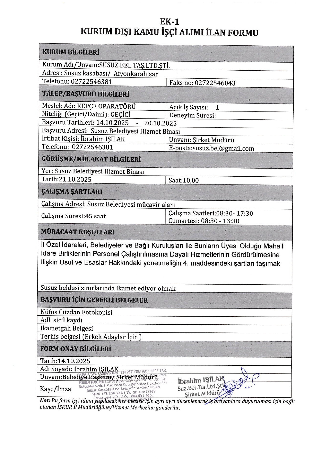Ana sayfaGeçici İşçi İlanları Afyonkarahisar Susuz Belediyesi Geçici 1 İşçi Alacak Afyonkarahisar Susuz Belediyesi Geçici 1 İşçi Alacak. Son başvuru tarihi 20 Ekim 2025 Kaynak : İşkur İlan Giriş : 15 Ekim 2025 00:36, Son Güncelleme : 15 Ekim 2025 01:10 Yazdır Yorumlar (0) Abone Ol
