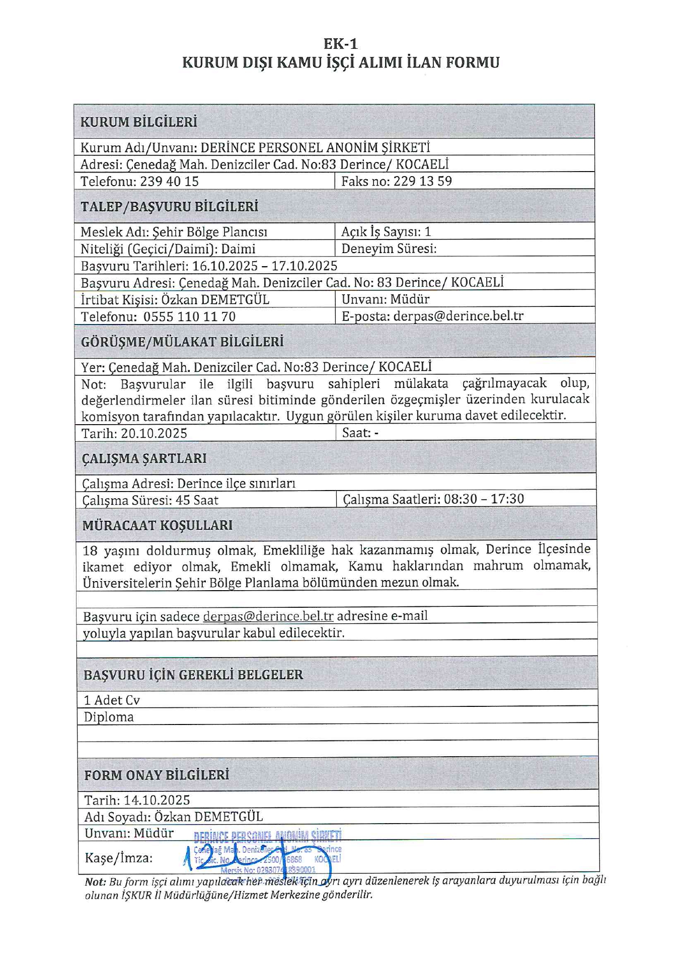 Ana sayfaDaimi İşçi İlanları Kocaeli Derince Personel Anonim 1 İşçi Alacak Kocaeli Derince Personel Anonim 1 İşçi Alacak. Son başvuru tarihi 17 Ekim 2025 Kaynak : İşkur İlan Giriş : 15 Ekim 2025 22:54, Son Güncelleme : 15 Ekim 2025 23:28 Yazdır Yorumlar (0) Abone Ol