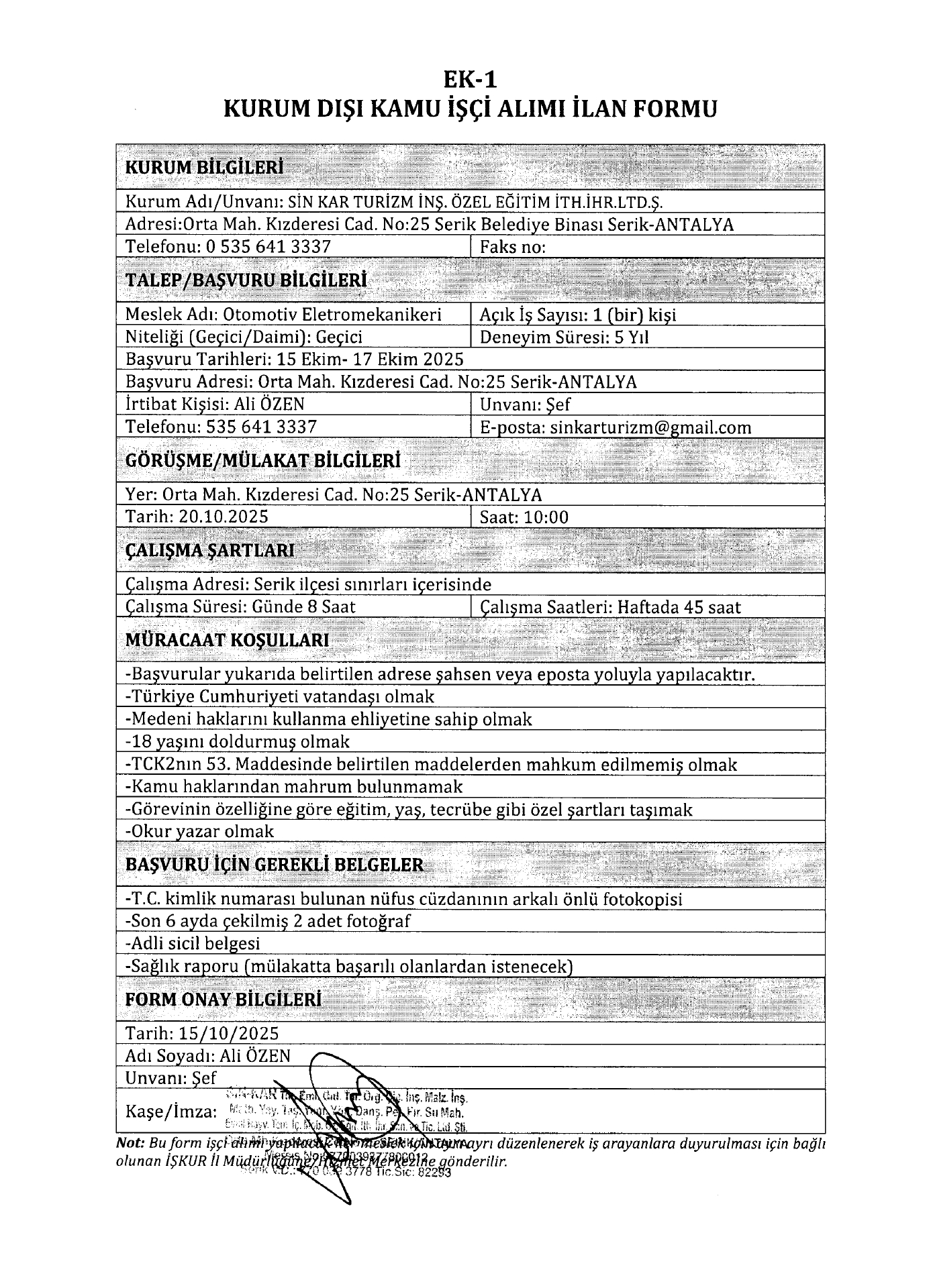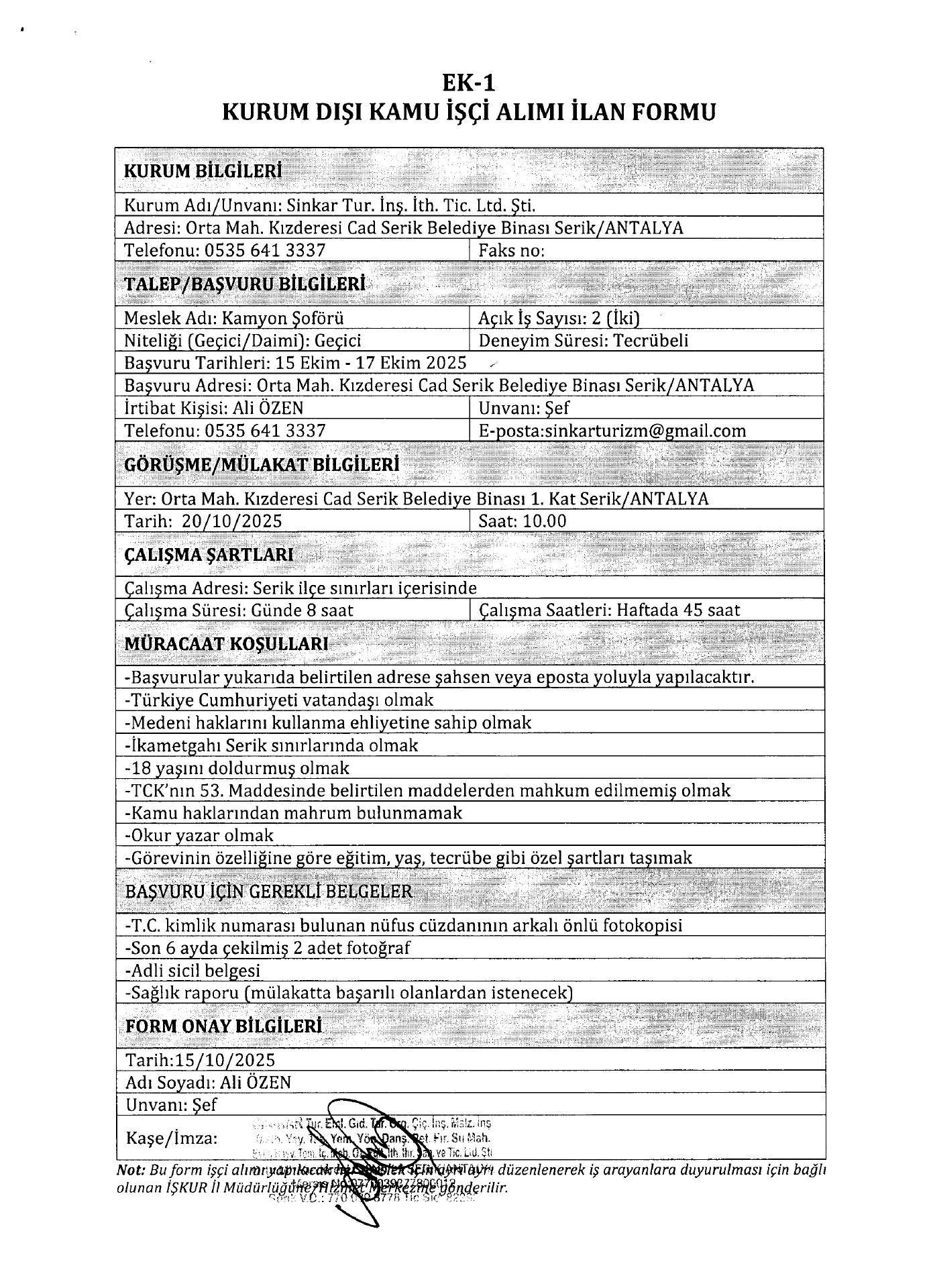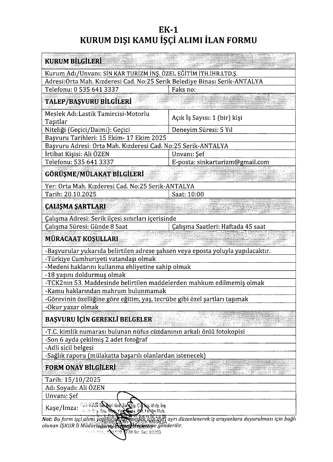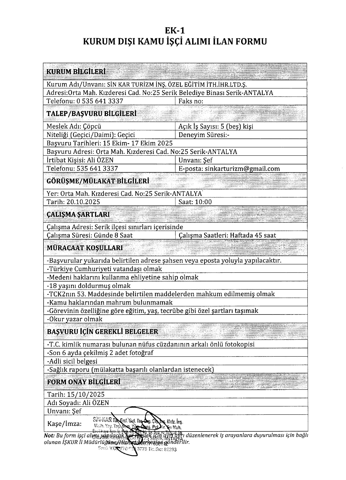 Antalya Sinkar Turizm Geçici 9 İşçi Alacak. Son başvuru tarihi 17 Ekim 2025