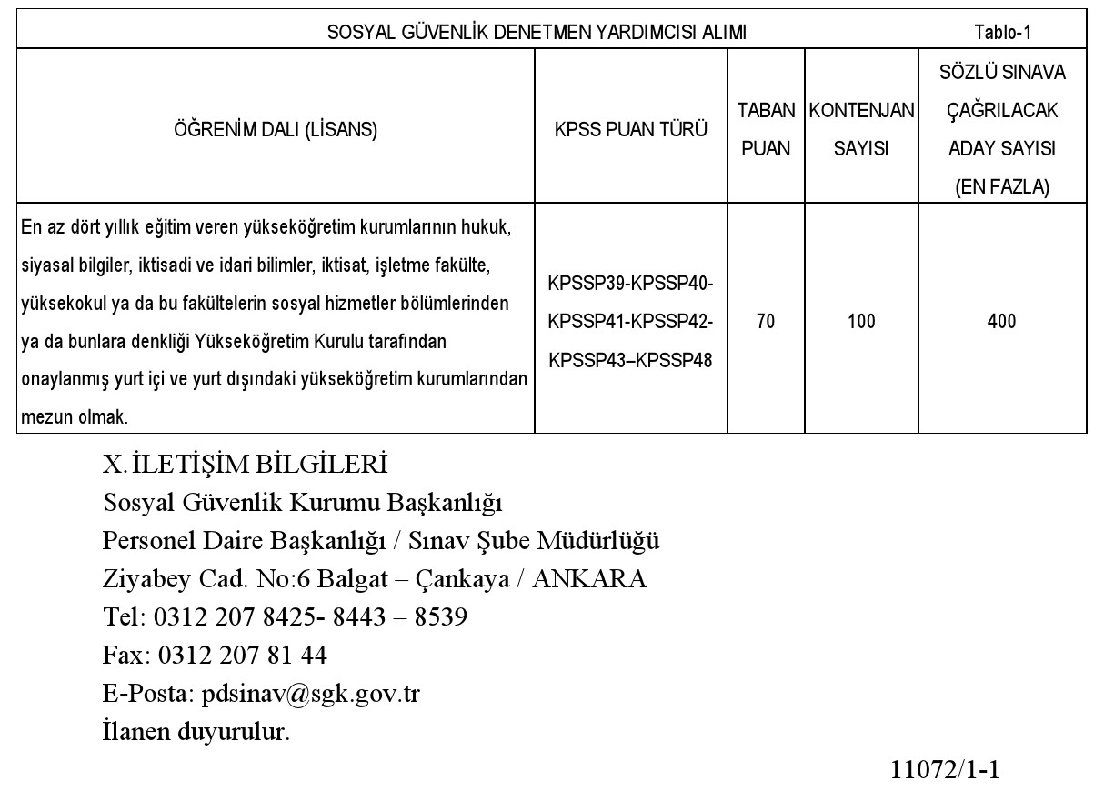 Kurumumuz taşra teşkilatı kadrolarında Genel İdari Hizmetler sınıfında istihdam edilmek üzere Sosyal Güvenlik Denetmenliği Yönetmeliği hükümleri çerçevesinde sözlü sınav yapılmak suretiyle 100 (yüz) Sosyal Güvenlik Denetmen Yardımcısı alınacaktır.