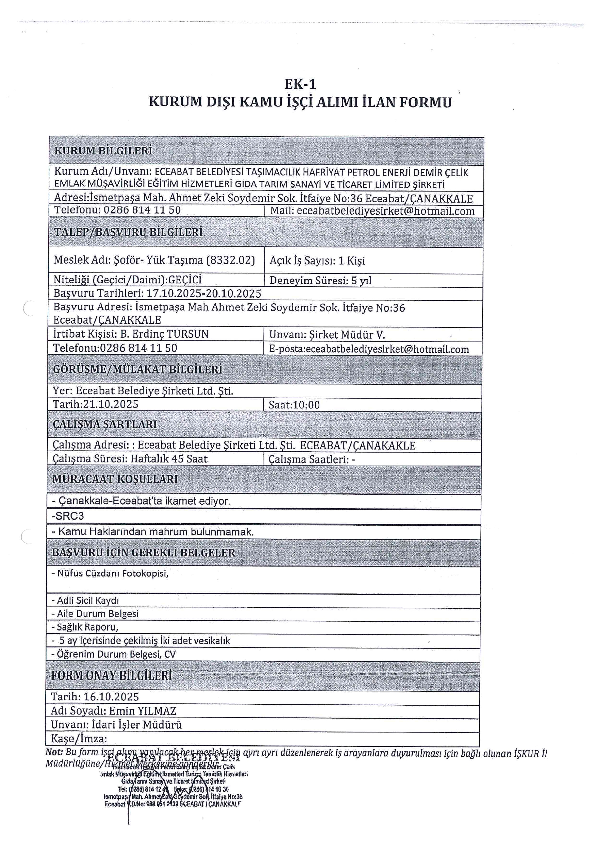 Çanakkale Eceabat Belediyesi Geçici 1 İşçi Alacak. Son başvuru tarihi 20 Ekim 2025