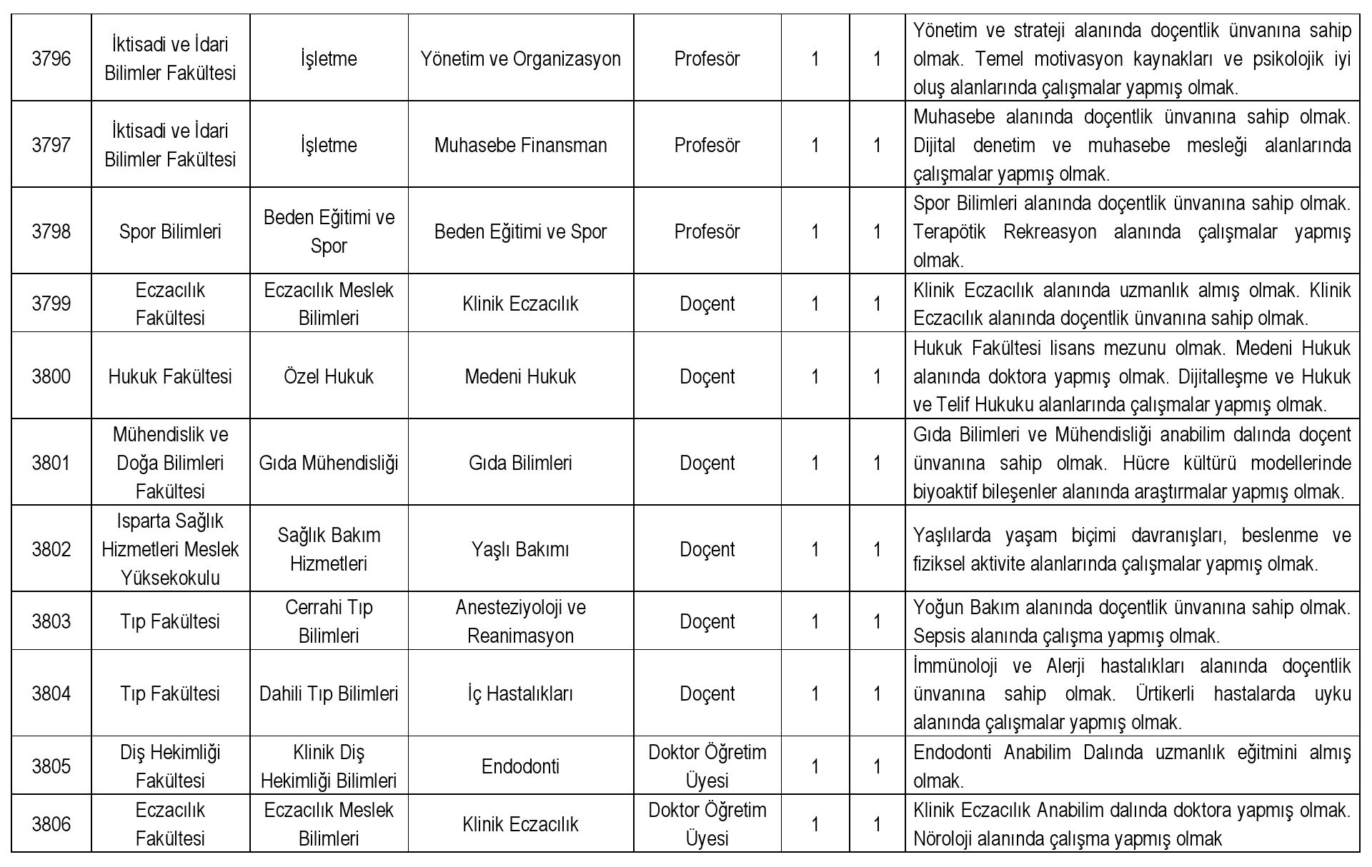 2 Kasım 2018 tarihli ve 30583 sayılı Resmi Gazete'de yayımlanan "Devlet Yükseköğretim Kurumlarında Öğretim Elemanı Norm Kadrolarının Belirlenmesine ve Kullanılmasına İlişkin Yönetmelik" kapsamında Üniversitemizin çeşitli birimlerine 657 sayılı Devlet Memurları Kanunu'nun 48 inci maddesi, 2547 sayılı Yükseköğretim Kanunu, Öğretim Üyeliğine Yükseltilme ve Atanma Yönetmeliği ve Süleyman Demirel Üniversitesi Öğretim Üyeliği Kadrolarına Başvurma, Atanma ve Yükseltilme Kriterlerine İlişkin Yönerge hükümlerine göre aşağıda belirtilen kadrolara öğretim üyesi alınacaktır.
