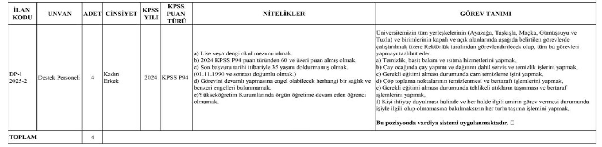 657 sayılı Devlet Memurları Kanununun 4 uncu maddesinin (B) fıkrası ile 06.06 1978 tanh ve 7/15754 sayılı Bakanlar Kurulu Karan ile yürürlüğe konulan Sözleşmeli Personel Çalıştın İmasına İlişkin Esaslar'ın Ek 2 nci maddesinin (e) bendi çerçevesinde; Üniversitemiz birimlerinde 2024 KPSS (B) grubundan istihdam edilmek üzere aşağıdaki tabloda belirtilen pozisyona ilan şartlarına uyan kişiler arasından KPSS puan sırasına göre toplam 4 adet sözleşmeli personel alınacaktır.