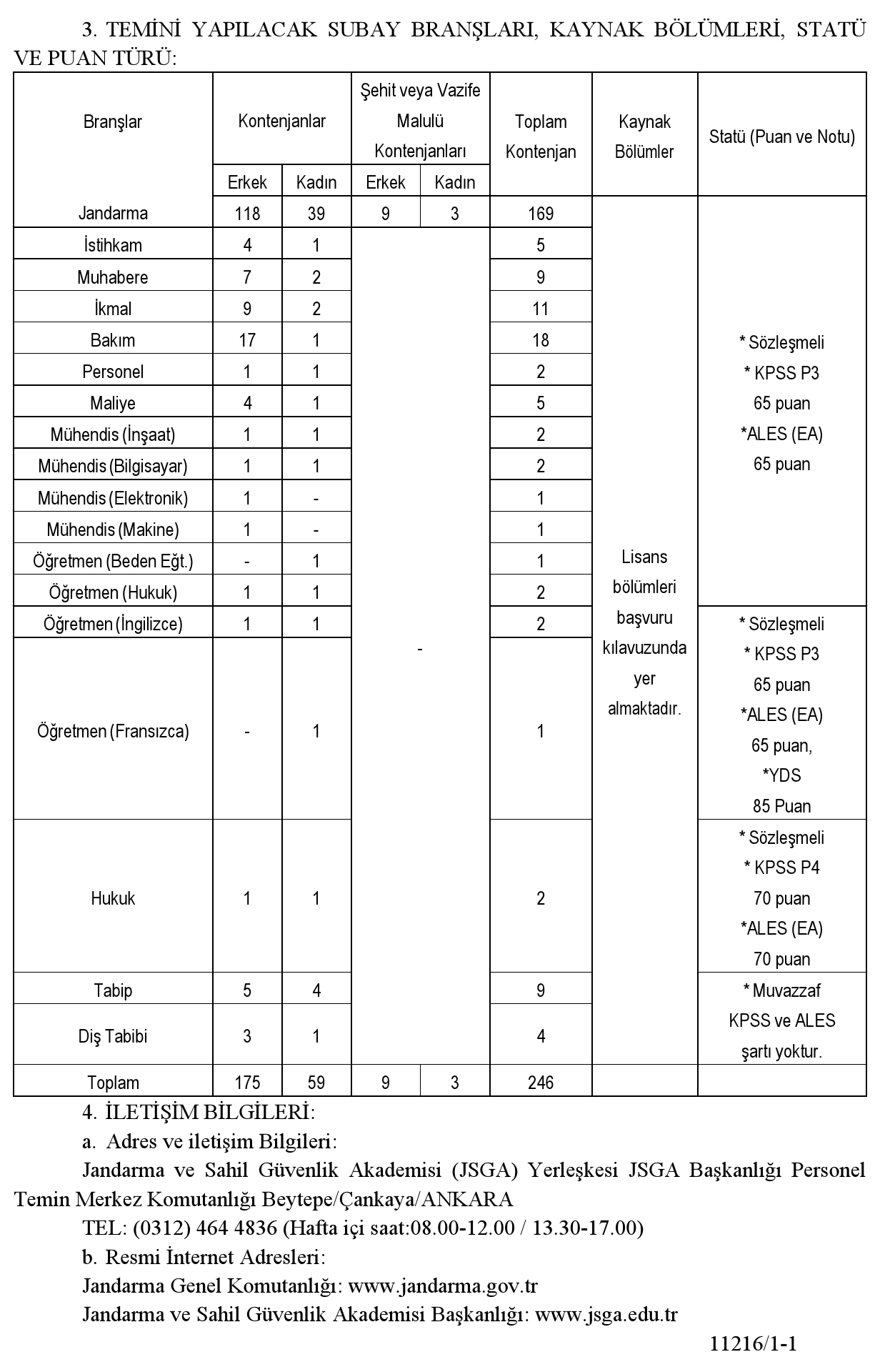 Jandarma Genel Komutanlığı karargahı ile bağlısı birlik ve kurumlarında istihdam edilmek üzere, Jandarma ve Sahil Güvenlik Akademisi Başkanlığında eğitim-öğretim görecek; 246 (13 muvazzaf, 233 sözleşmeli) subay temin edilecektir.