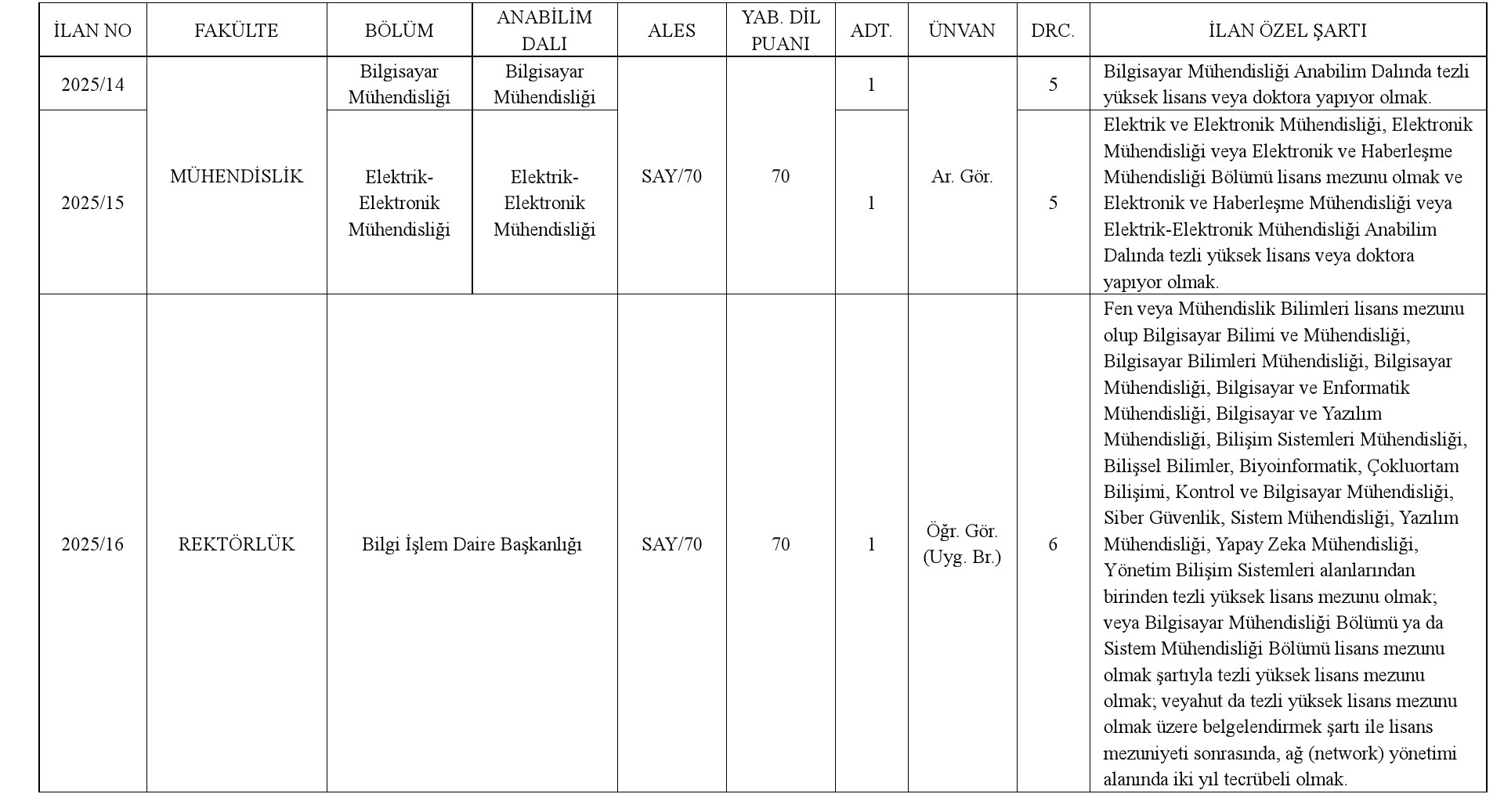 -Araştırma görevlisi kadrosuna başvurabilmek için tezli yüksek lisans veya doktora öğrencisi olması, giriş sınavının yapılacağı 2025 yılı ocak ayının birinci günü itibarıyla otuz beş yaşını doldurmamış (02.01.1990 tarihi ve sonrasında doğanlar) olması gerekir.