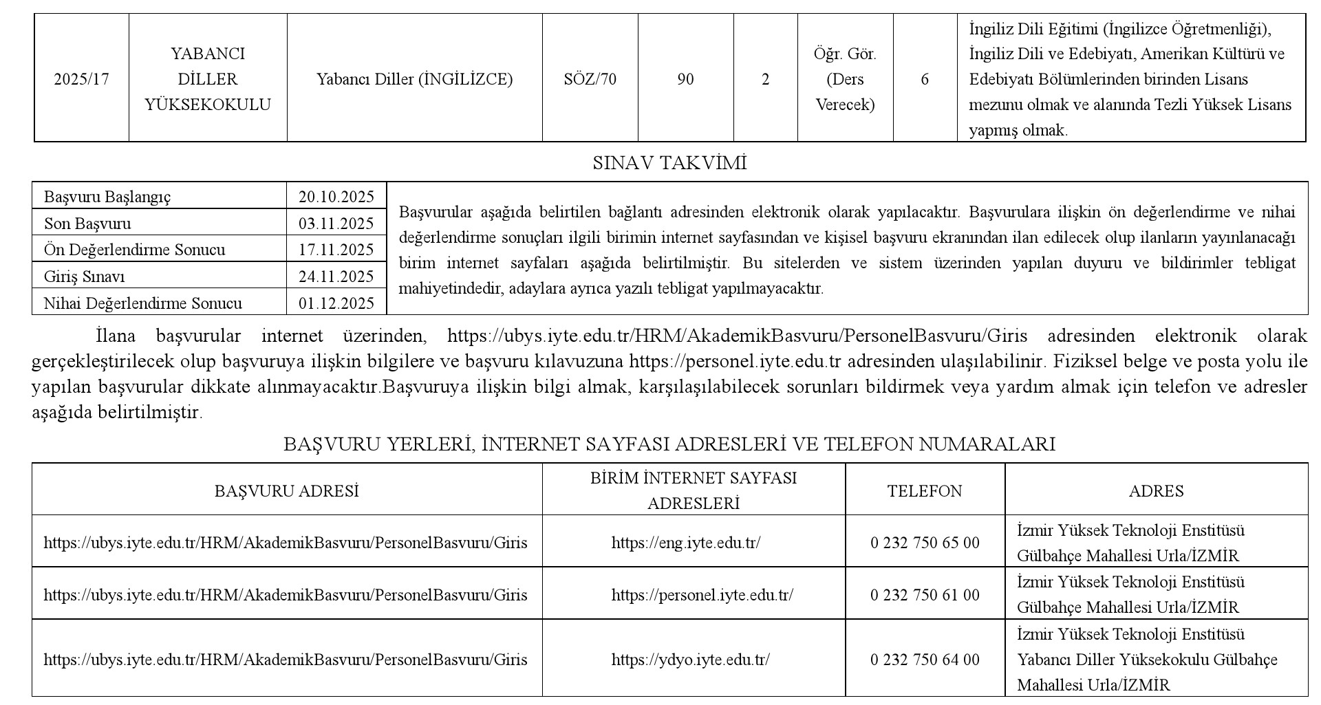 İzmir Yüksek Teknoloji Enstitüsü Öğretim Üyesi ve Elemanı Alım İlanı. Son başvuru tarihi 3 Kasım 2025