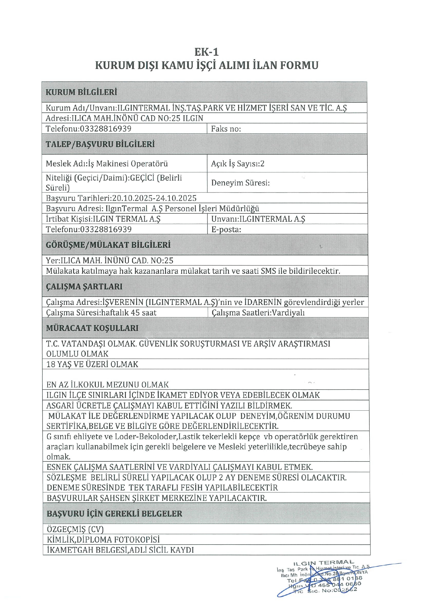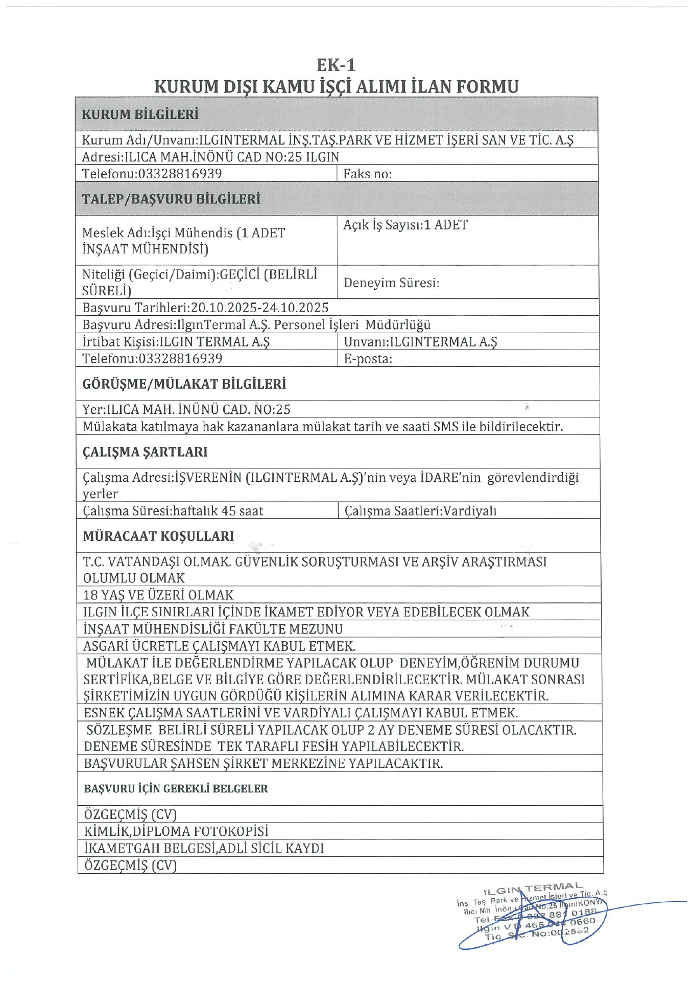 Ana sayfaGeçici İşçi İlanları Ilgın Termal İnşaat Geçici 3 İşçi Alacak Ilgın Termal İnşaat Geçici 3 İşçi Alacak. Son başvuru tarihi 24 Ekim 2025 Kaynak : İşkur İlan Giriş : 21 Ekim 2025 01:18, Son Güncelleme : 21 Ekim 2025 02:10 Yazdır Yorumlar (0) Abone Ol