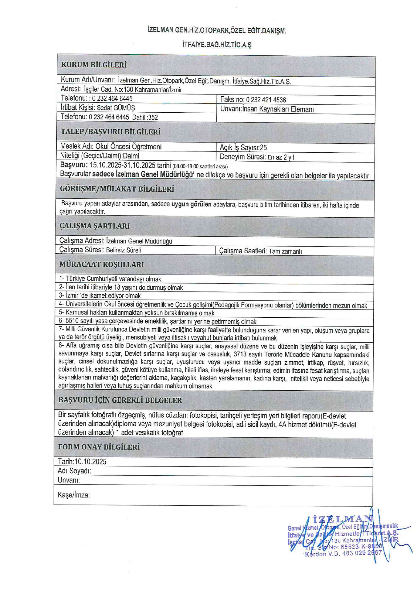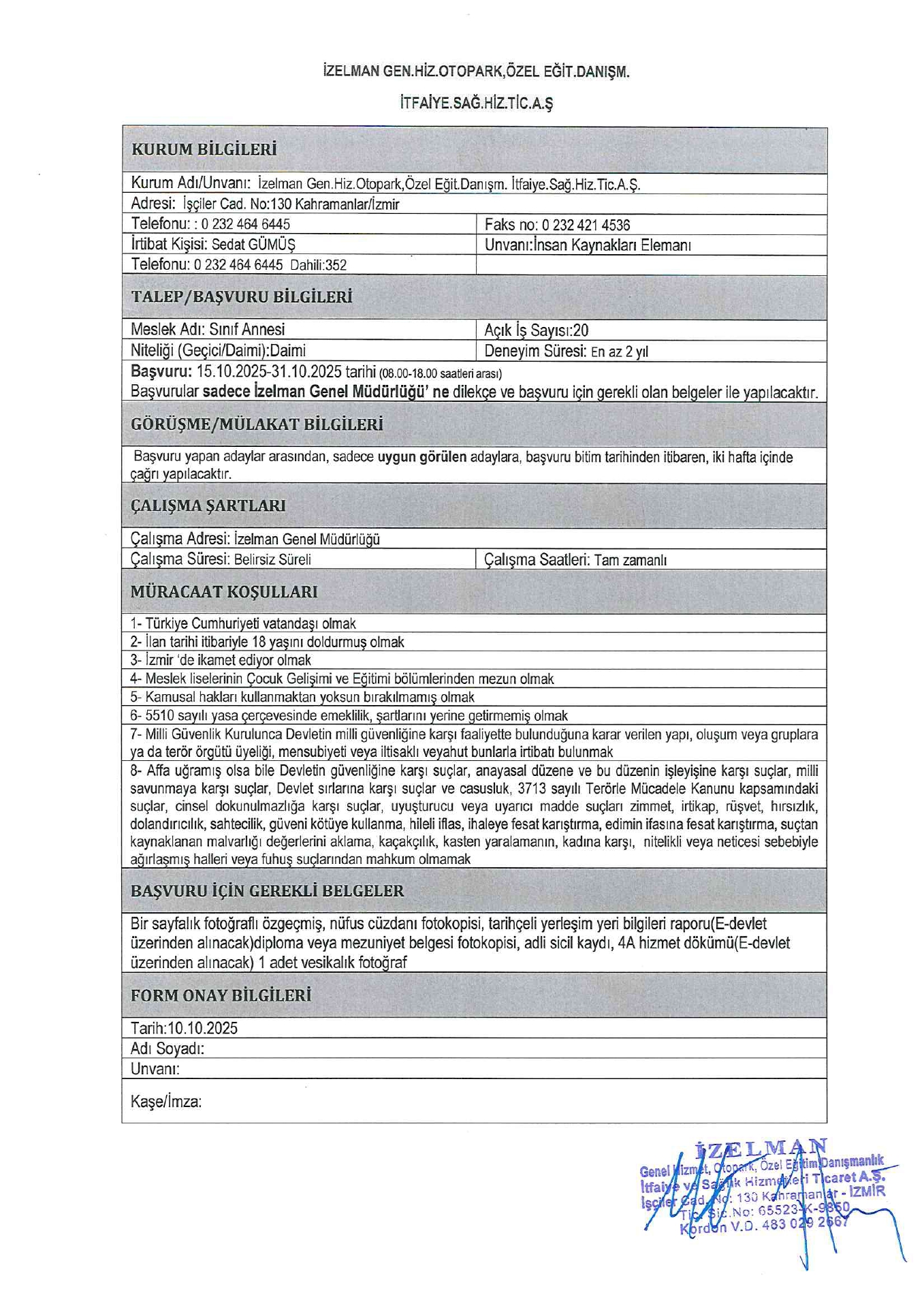 Ana sayfaDaimi İşçi İlanları İzmir İzelman 45 İşçi Alacak İzmir İzelman 45 İşçi Alacak. Son başvuru tarihi 31 Ekim 2025 Kaynak : İşkur İlan Giriş : 21 Ekim 2025 01:25, Son Güncelleme : 21 Ekim 2025 02:08 Yazdır Yorumlar (0) Abone Ol