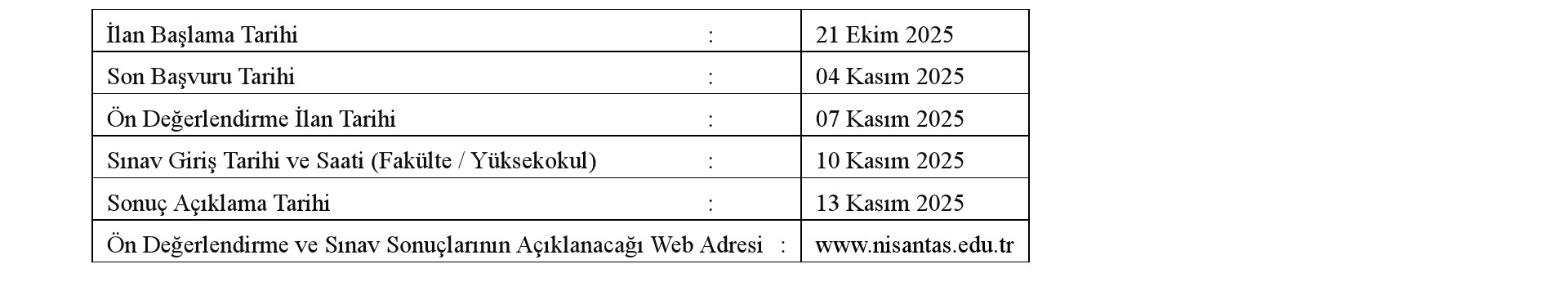 Son başvuru tarihi ilanın yayın tarihinden itibaren 15 gündür. Müracaatlar https://insankaynaklari.nisantasi.edu.tr/akademisyen-ilanlari linkinden ve başvuru adresine yapılacaktır. Süresi içinde yapılmayan ve eksik evrakla yapılan başvurular kabul edilmeyecektir.