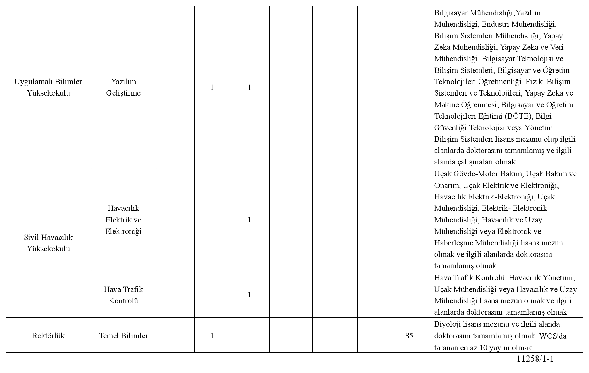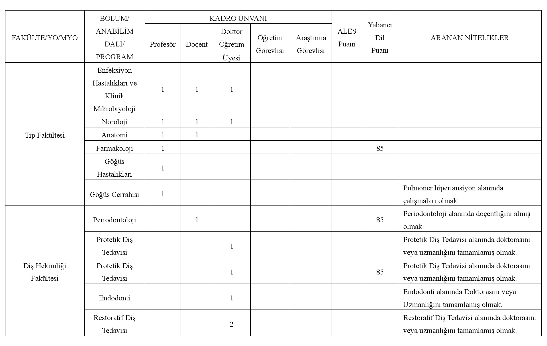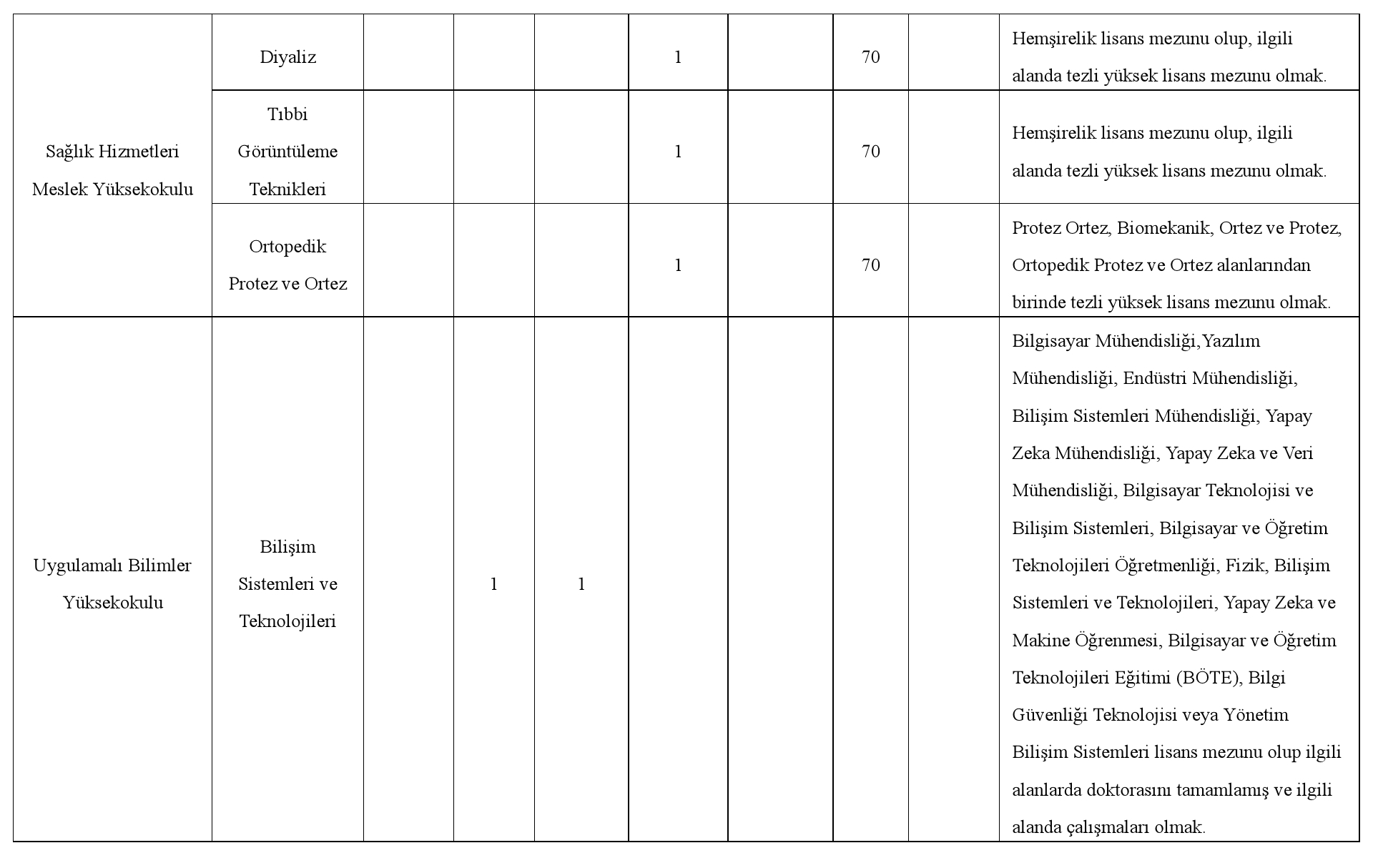 Öğretim Görevlisi ve Araştırma Görevlisi Başvurularında İstenen Belgeler; Özgeçmiş, (YÖK Formatında) ALES belgesi, yabancı dil sınav belgesi, onaylı lisans, yüksek lisans diplomaları ve varsa doktora öğrenci belgeleri, (e-Devlet çıktısı olabilir) (Yurt Dışından alınan diplomaların YÖK tarafından onaylandığını gösterir belge.), onaylı lisans transkripti, nüfus cüzdanı fotokopisi, 3 Adet vesikalık fotoğraf, adli sicil belgesi, nüfus kayıt örneği, ikametgah, askerlik terhis belgesi, e-Devletten SGK Tescil ve Hizmet Dökümü belgesi, varsa ilgili alanda bilimsel çalışmalarını kapsayan dosya.