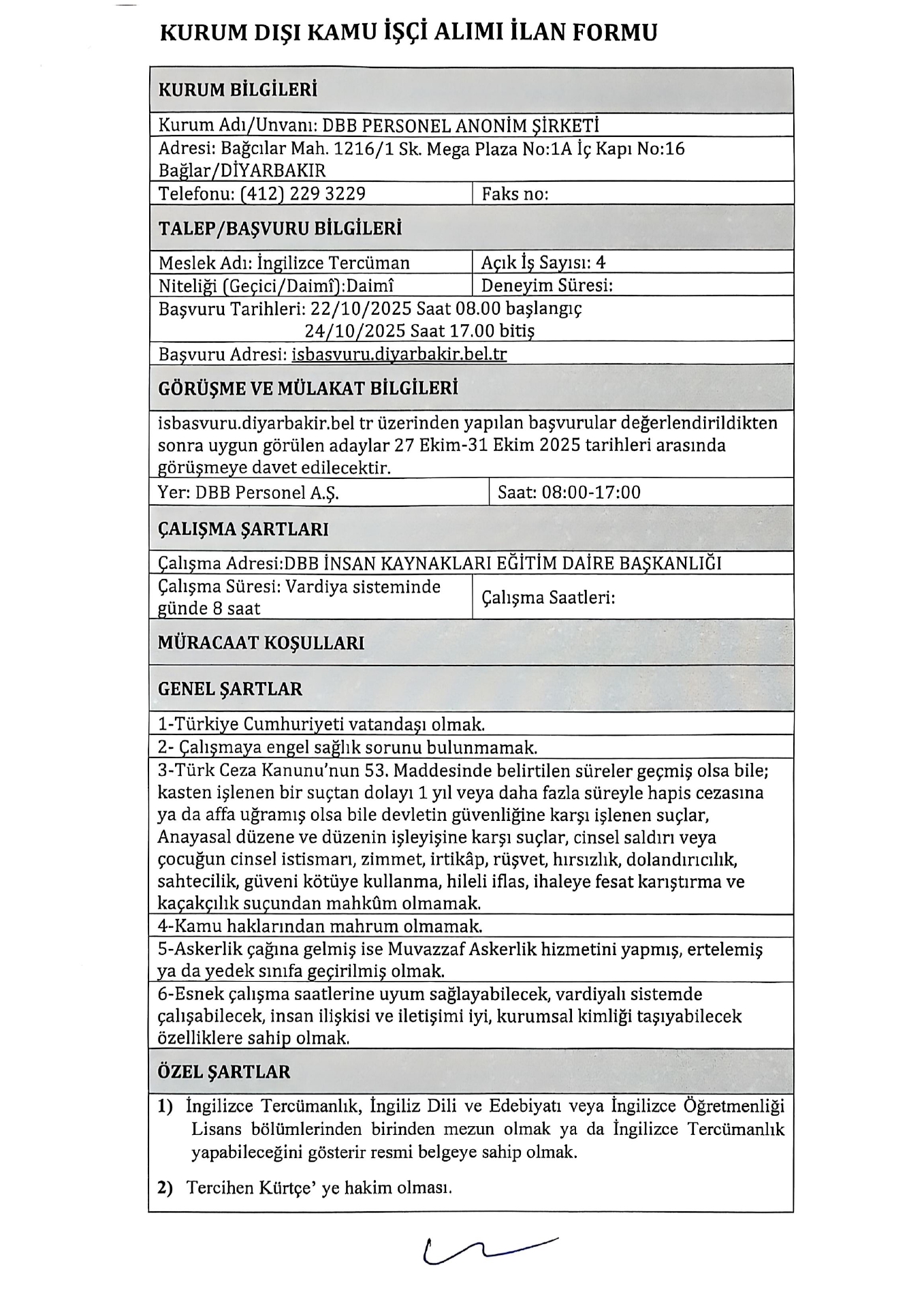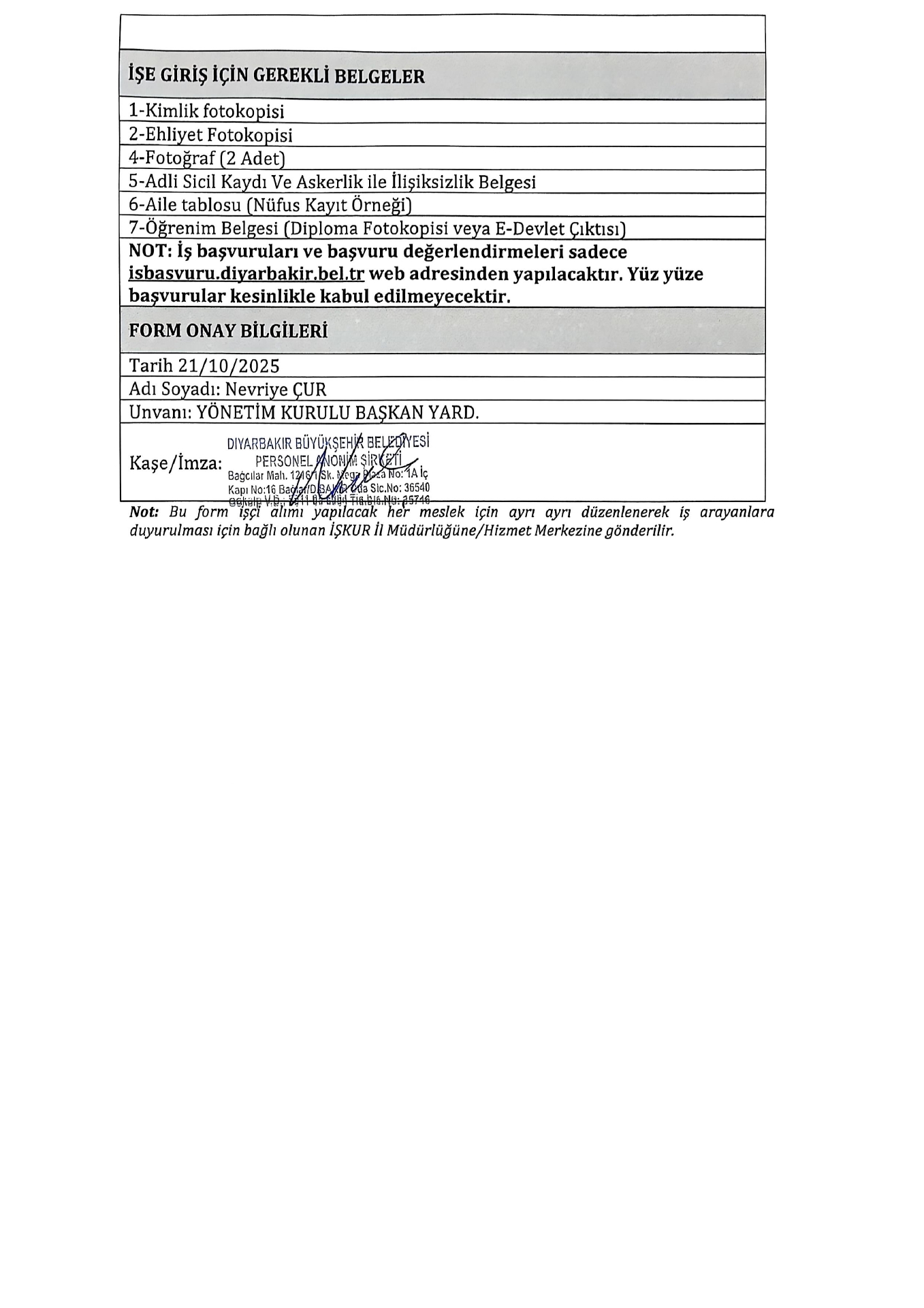 Ana sayfaDaimi İşçi İlanları Diyarbakır Büyükşehir Belediyesi 4 İşçi Alacak Diyarbakır Büyükşehir Belediyesi 4 İşçi Alacak. Son başvuru tarihi 24 Ekim 2025 Kaynak : İşkur İlan Giriş : 22 Ekim 2025 22:08, Son Güncelleme : 23 Ekim 2025 00:44 Yazdır Yorumlar (0) Abone Ol