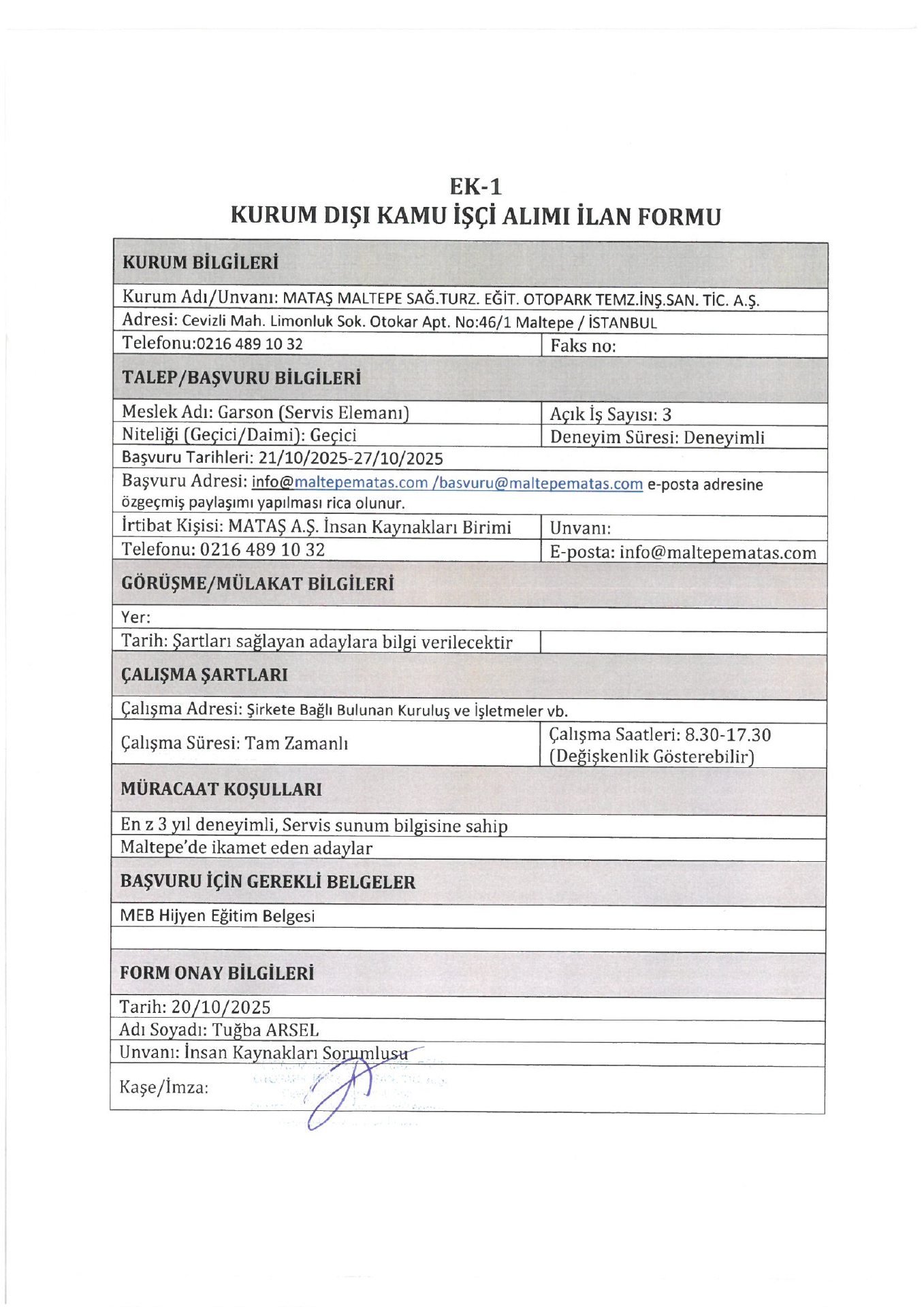 Ana sayfaGeçici İşçi İlanları İstanbul Maltepe Mataş Geçici 3 İşçi Alacak İstanbul Maltepe Mataş Geçici 3 İşçi Alacak. Son başvuru tarihi 27 Ekim 2025 Kaynak : İşkur İlan Giriş : 22 Ekim 2025 22:18, Son Güncelleme : 23 Ekim 2025 00:41 Yazdır Yorumlar (0) Abone Ol
