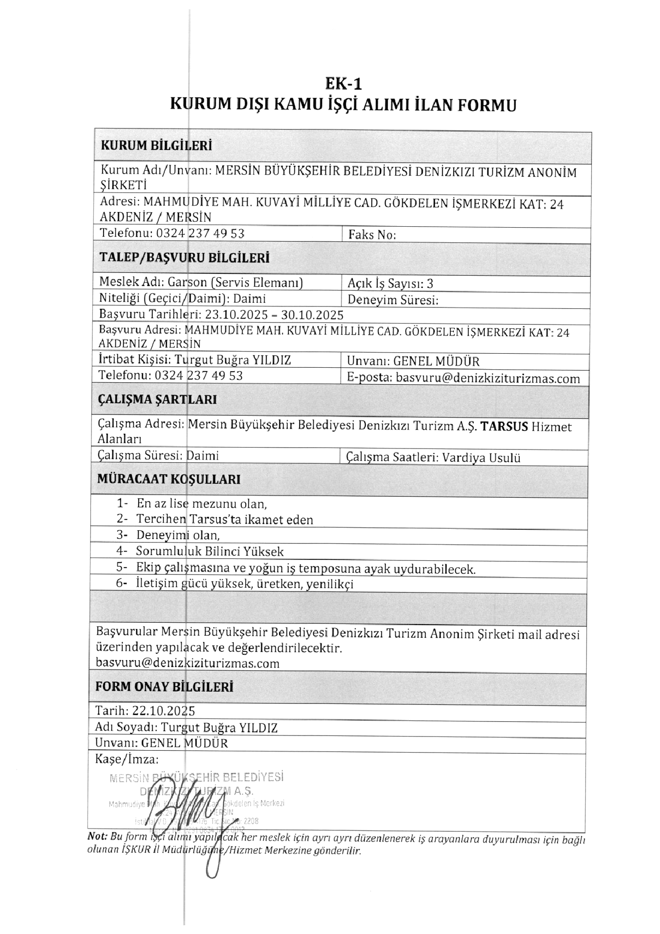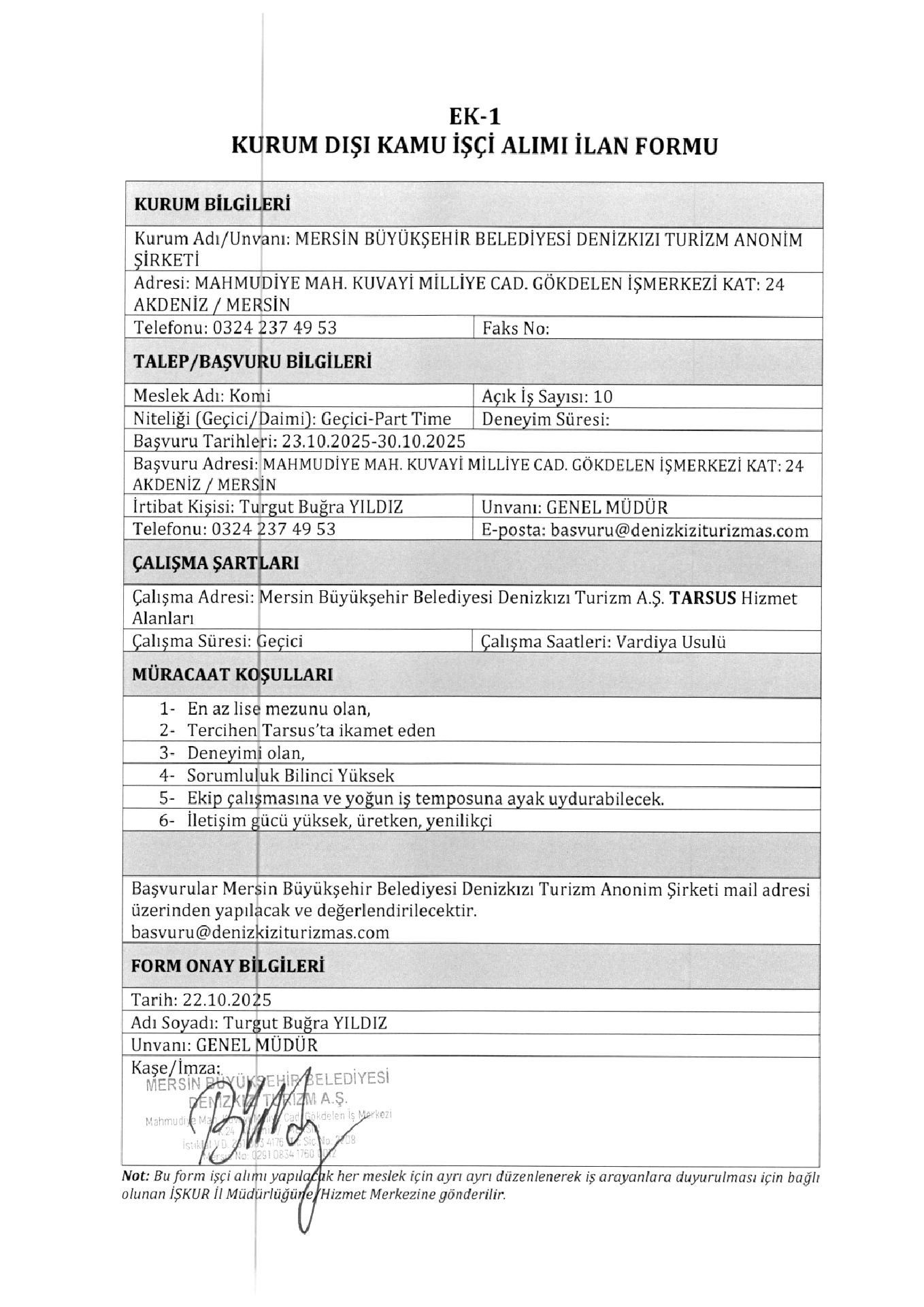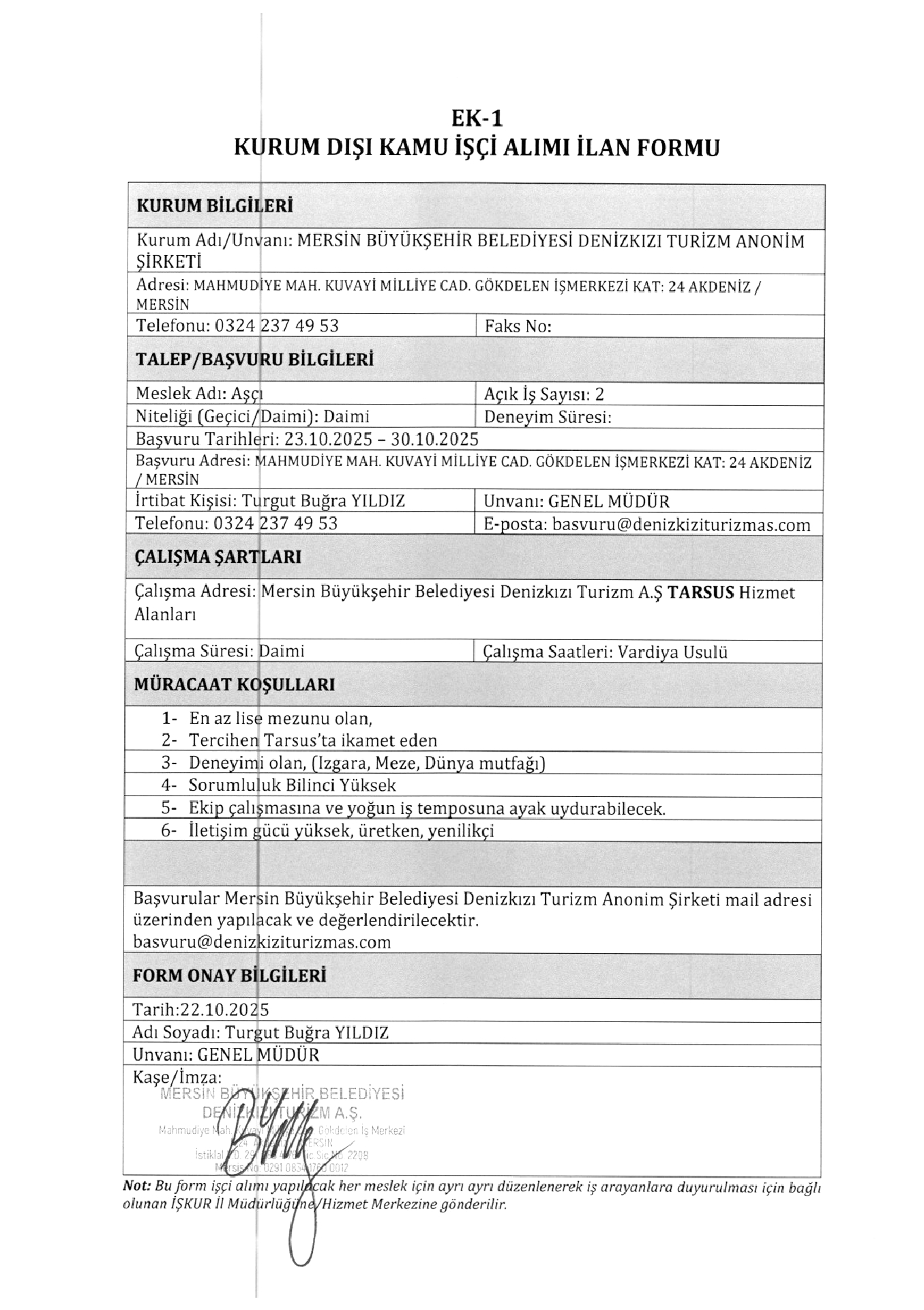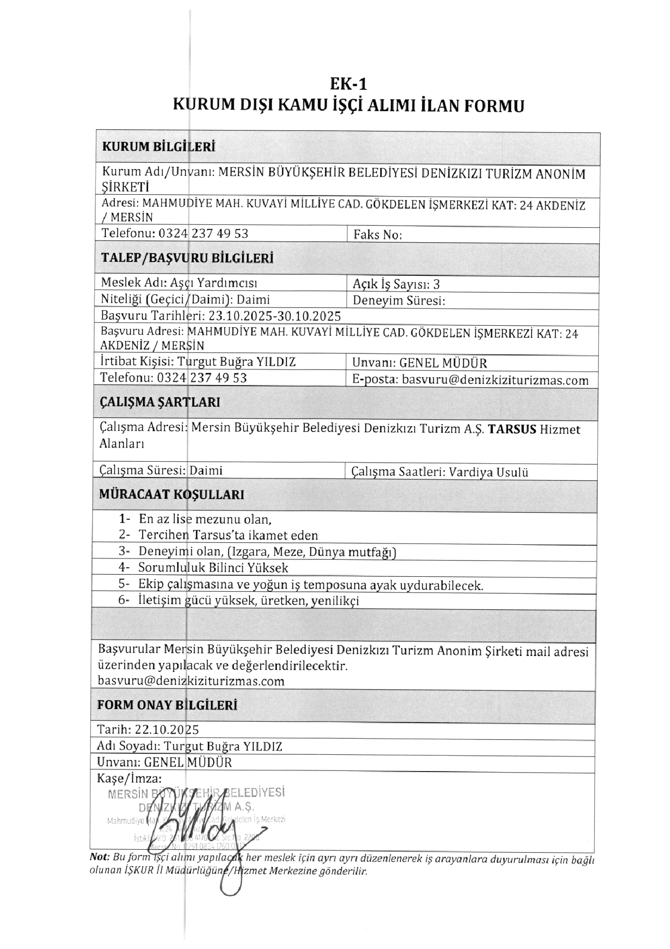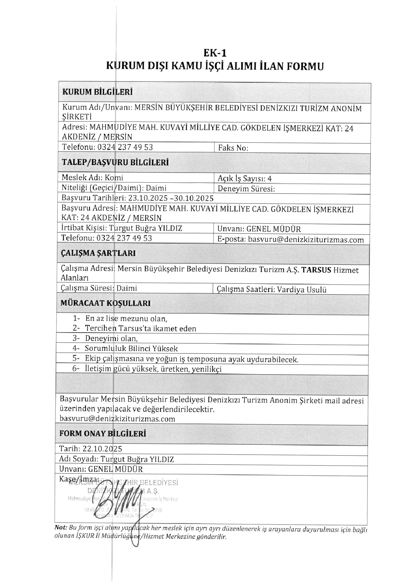 Ana sayfaDaimi İşçi İlanları Mersin Büyükşehir Belediyesi 22 İşçi Alacak Mersin Büyükşehir Belediyesi 22 İşçi Alacak. Son başvuru tarihi 30 Ekim 2025 Kaynak : İşkur İlan Giriş : 22 Ekim 2025 22:20, Son Güncelleme : 23 Ekim 2025 00:40 Yazdır Yorumlar (0) Abone Ol
