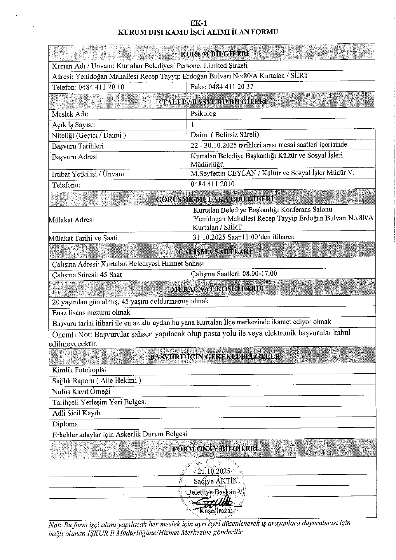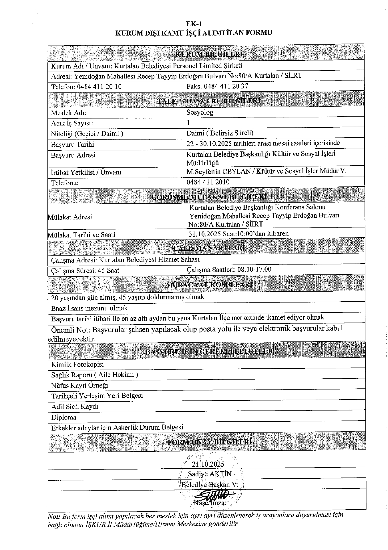 Ana sayfaDaimi İşçi İlanları Siirt Kurtalan Belediyesi 2 İşçi Alacak Siirt Kurtalan Belediyesi 2 İşçi Alacak. Son başvuru tarihi 30 Ekim 2025 Kaynak : İşkur İlan Giriş : 22 Ekim 2025 22:32, Son Güncelleme : 23 Ekim 2025 00:36 Yazdır Yorumlar (0) Abone Ol