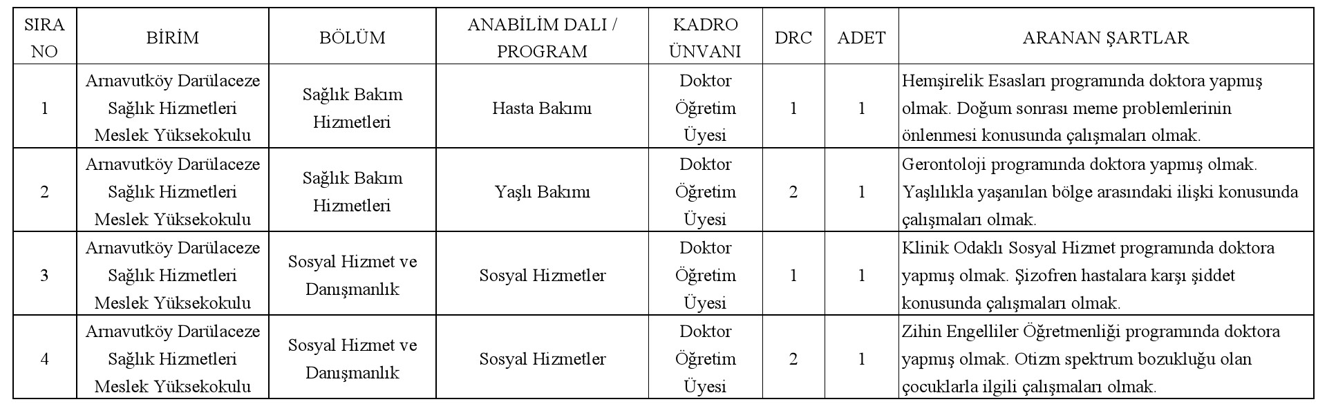 Profesör kadrosu daimi statüde olup başvuracak adayların "Başlıca Araştırma Eseri" ile birlikte başvurusunu aşağıda belirtilen açıklamaya göre ilanın yayım tarihinden itibaren 15 gün içinde online olarak yapmaları gerekmektedir.