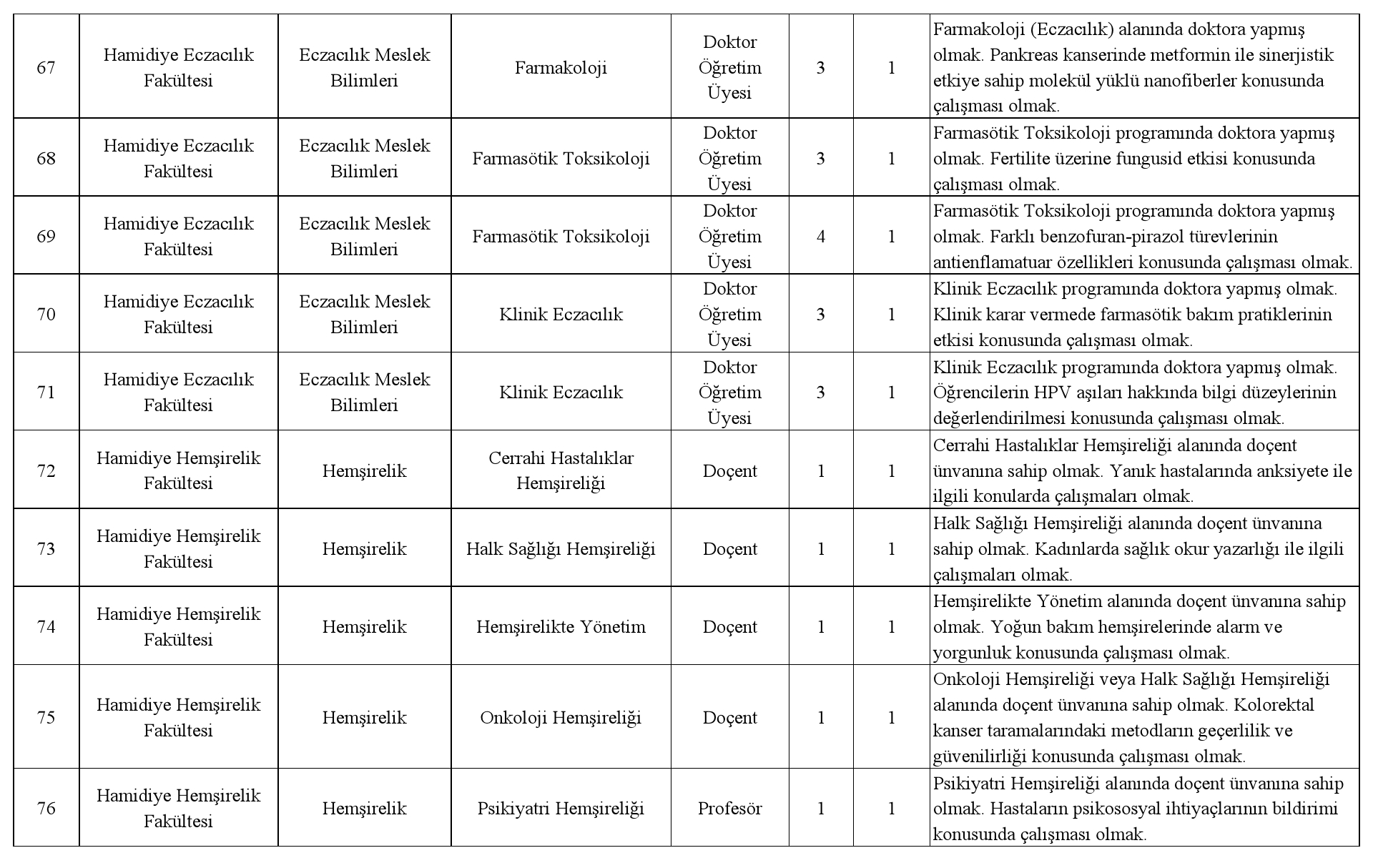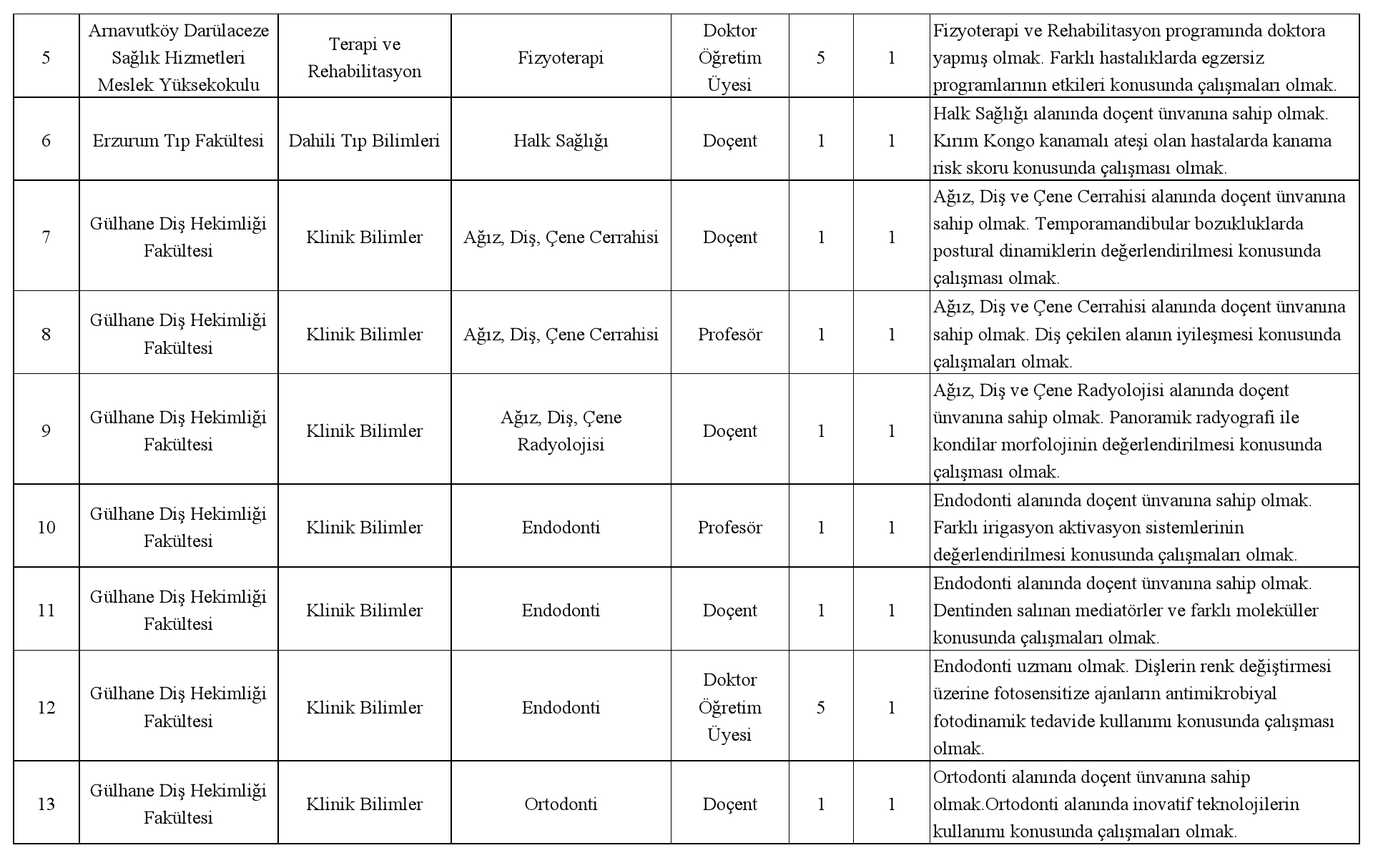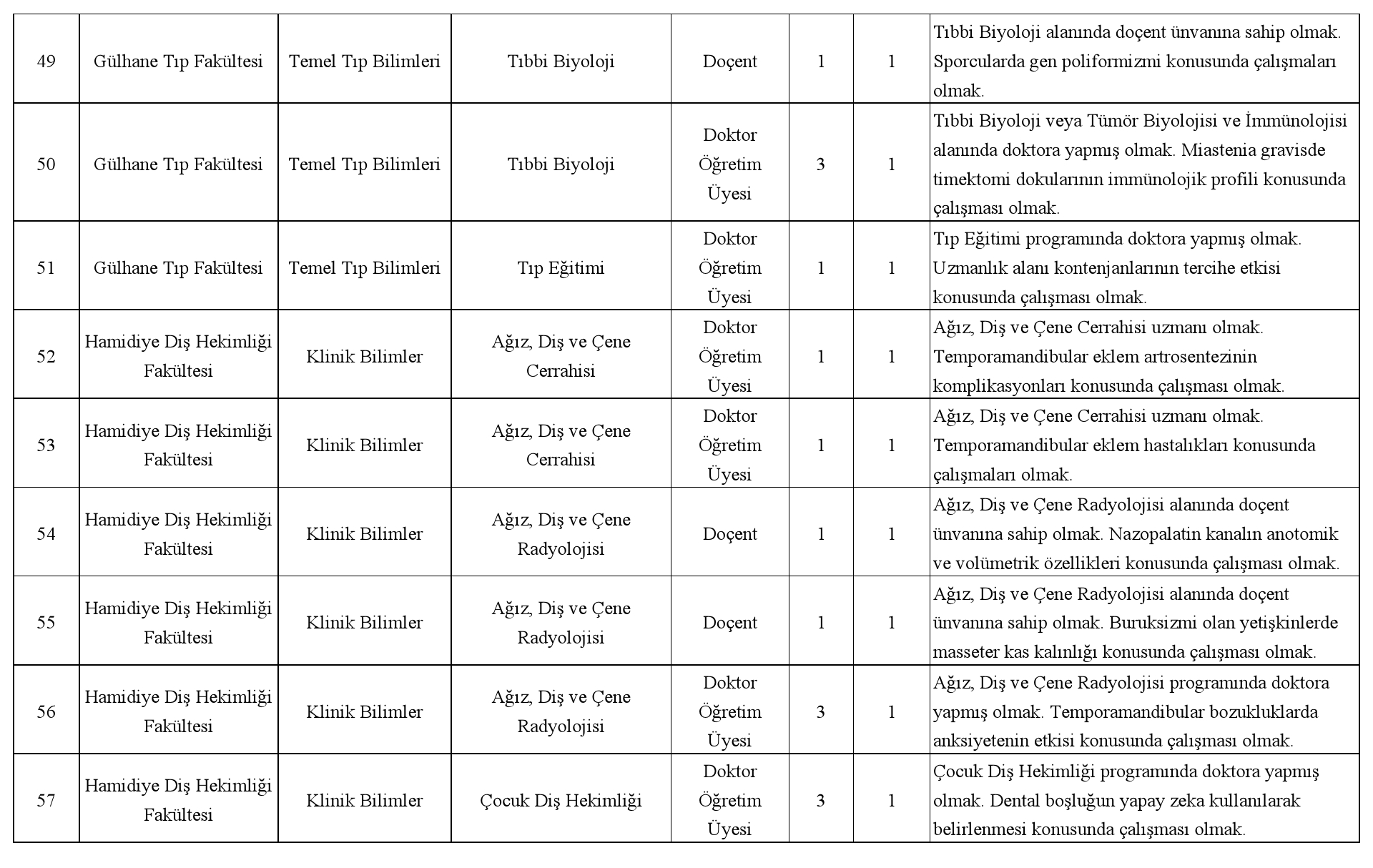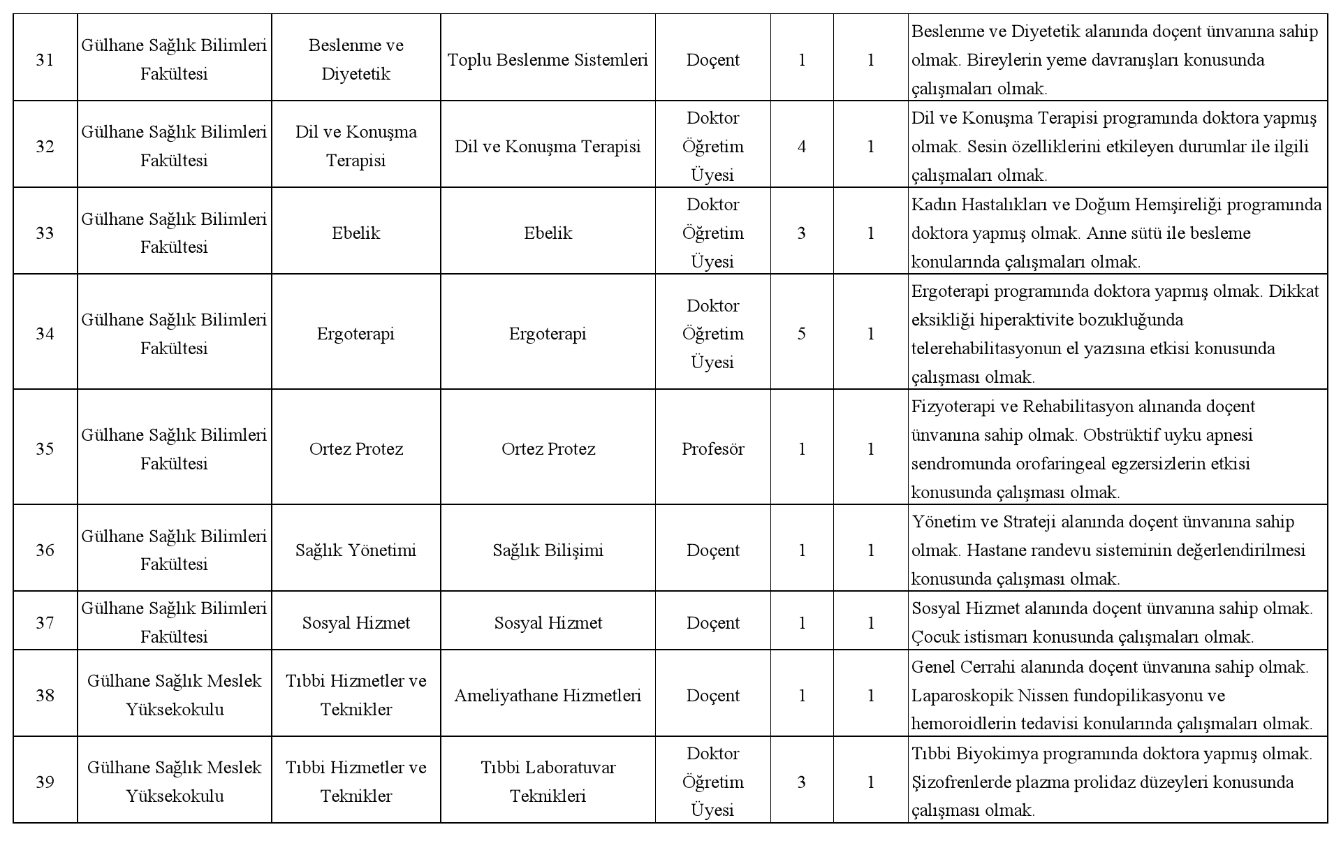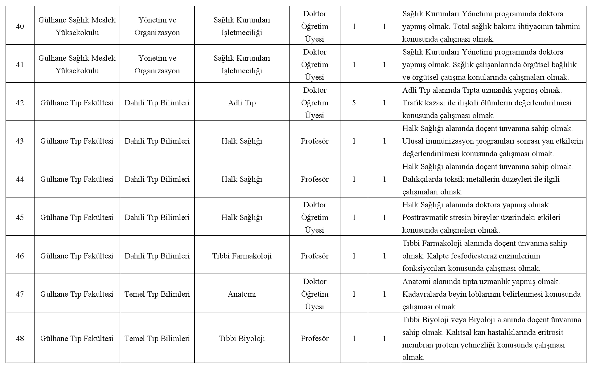Üniversitemizin aşağıda belirtilen birimlerine, 02.11.2018 tarih ve 30583 sayılı Resmi Gazete'de yayımlanan Devlet Yükseköğretim Kurumlarında Öğretim Elemanı Norm Kadrolarının Belirlenmesine ve Kullanılmasına İlişkin Yönetmelik hükümleri, 2547 sayılı Yükseköğretim Kanunu, Öğretim Üyeliğine Yükseltilme ve Atanma Yönetmeliği, 657 sayılı Devlet Memurları Kanunu'nun 48. maddesi hükümleri ve Sağlık Bilimleri Üniversitesi Öğretim Üyeliğine Yükseltilme ve Atanma Yönergesi hükümleri uyarınca Öğretim Üyesi alınacaktır. İlan edilen kadrolara uygun olmadığı anlaşılan başvurular geçersiz sayılacaktır.