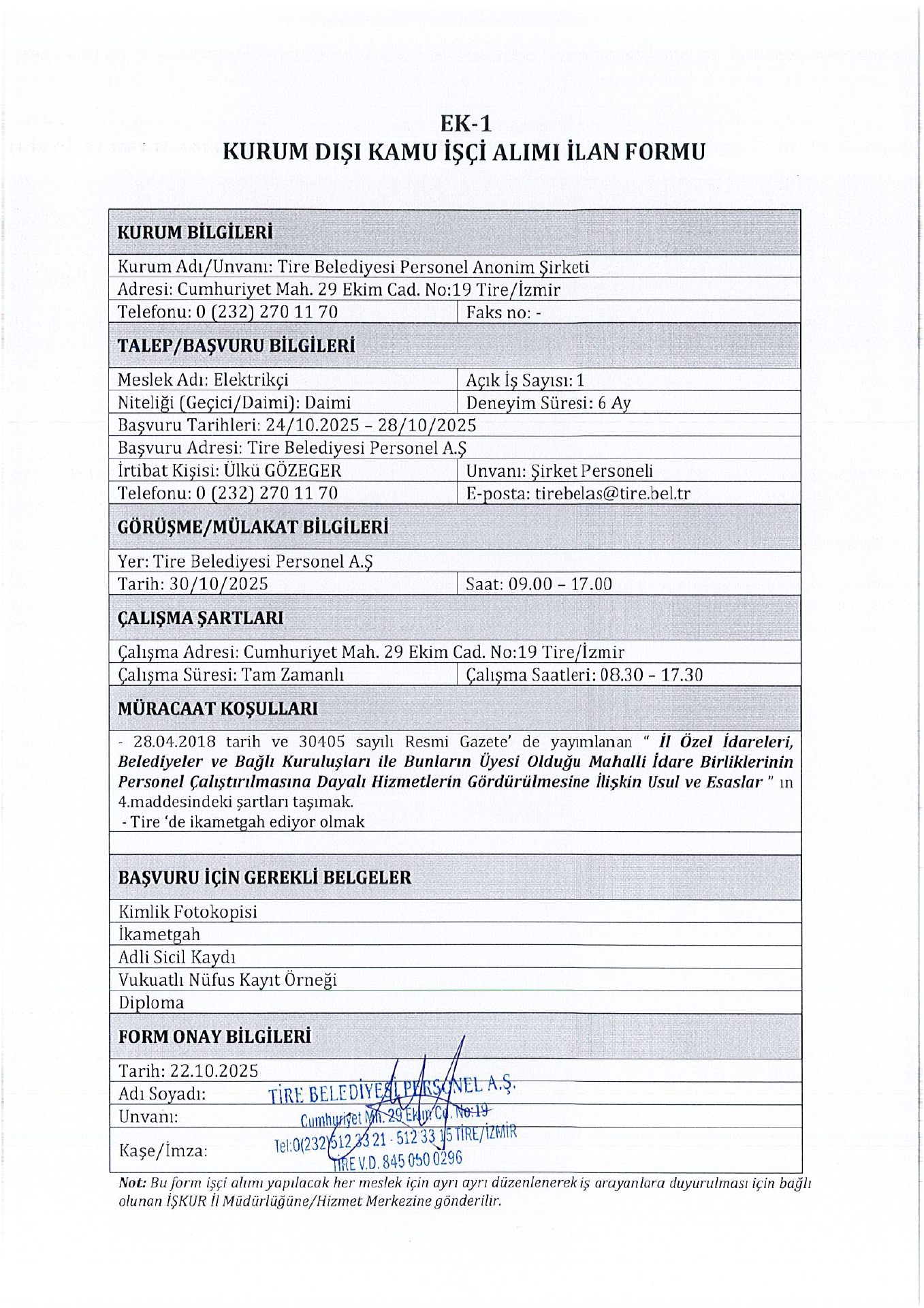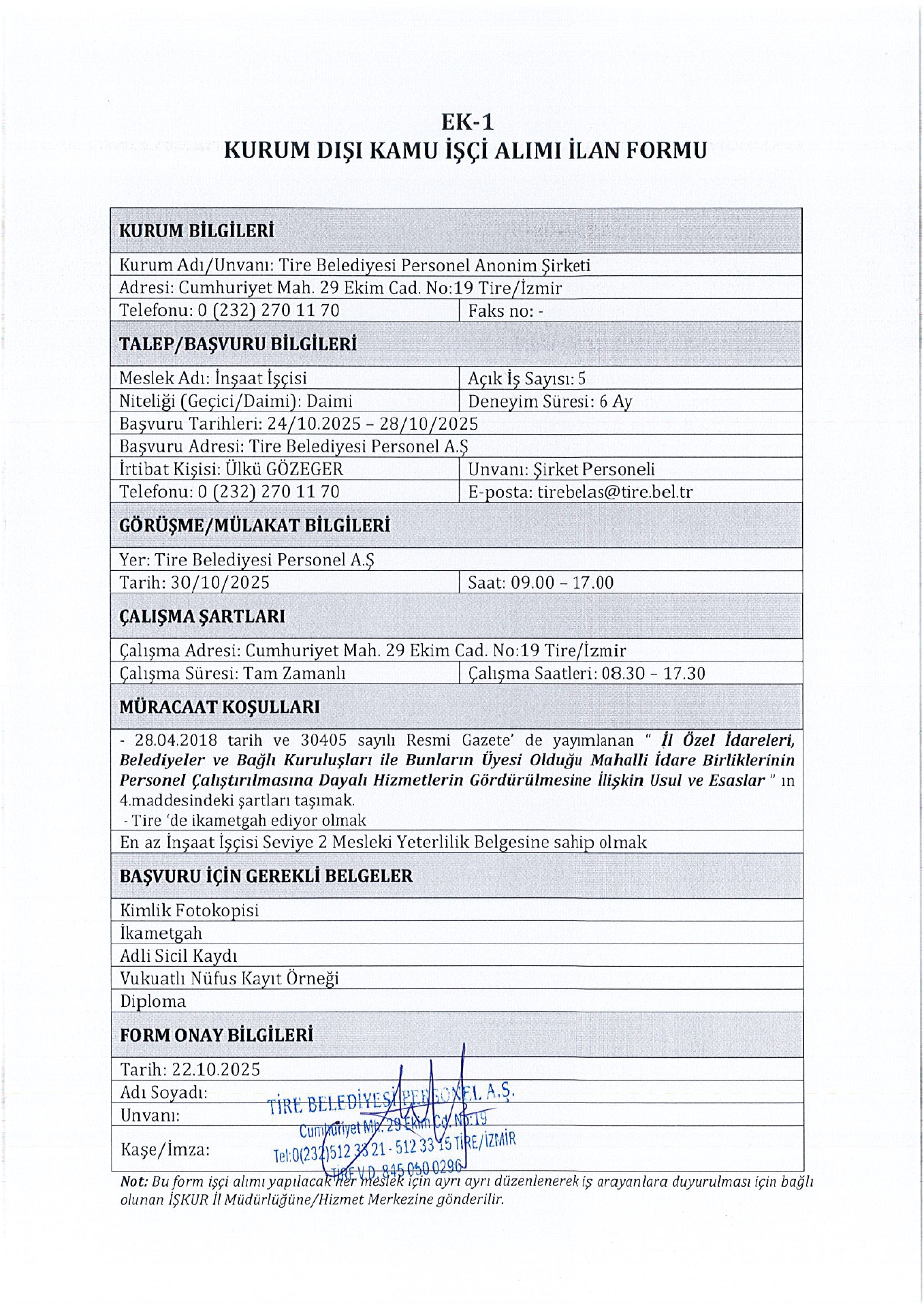 Ana sayfaDaimi İşçi İlanları İzmir Tire Belediyesi 8 İşçi Alacak İzmir Tire Belediyesi 8 İşçi Alacak. Son başvuru tarihi 28 Ekim 2025 Kaynak : İşkur İlan Giriş : 23 Ekim 2025 23:10, Son Güncelleme : 23 Ekim 2025 23:37 Yazdır Yorumlar (0) Abone Ol