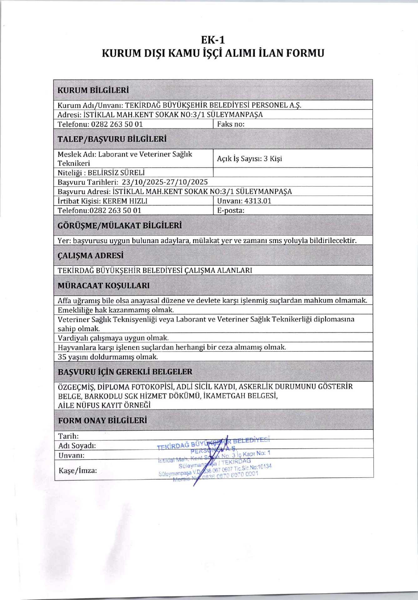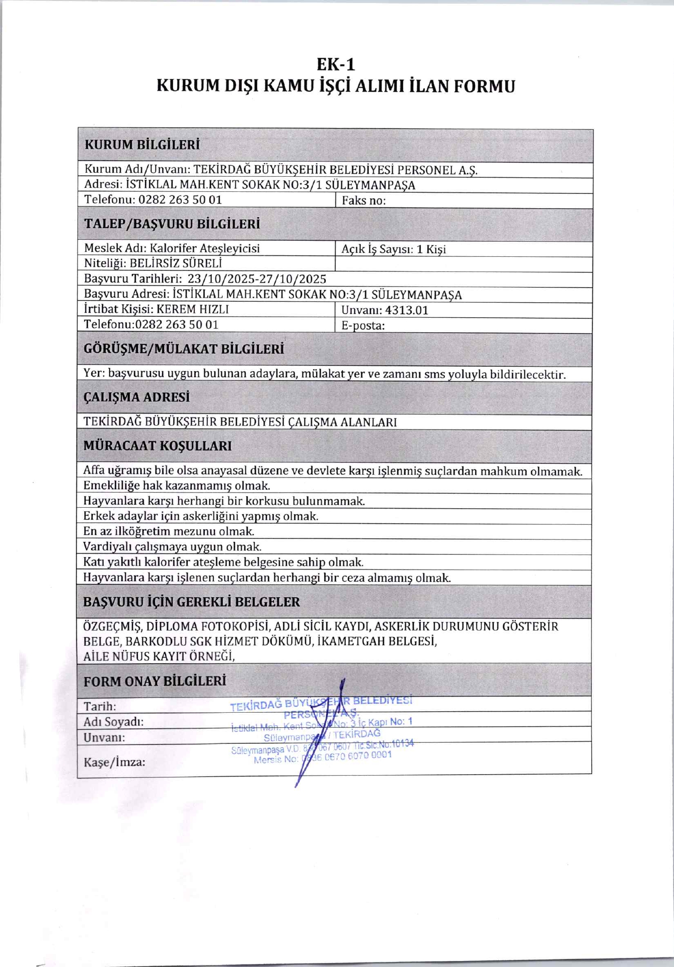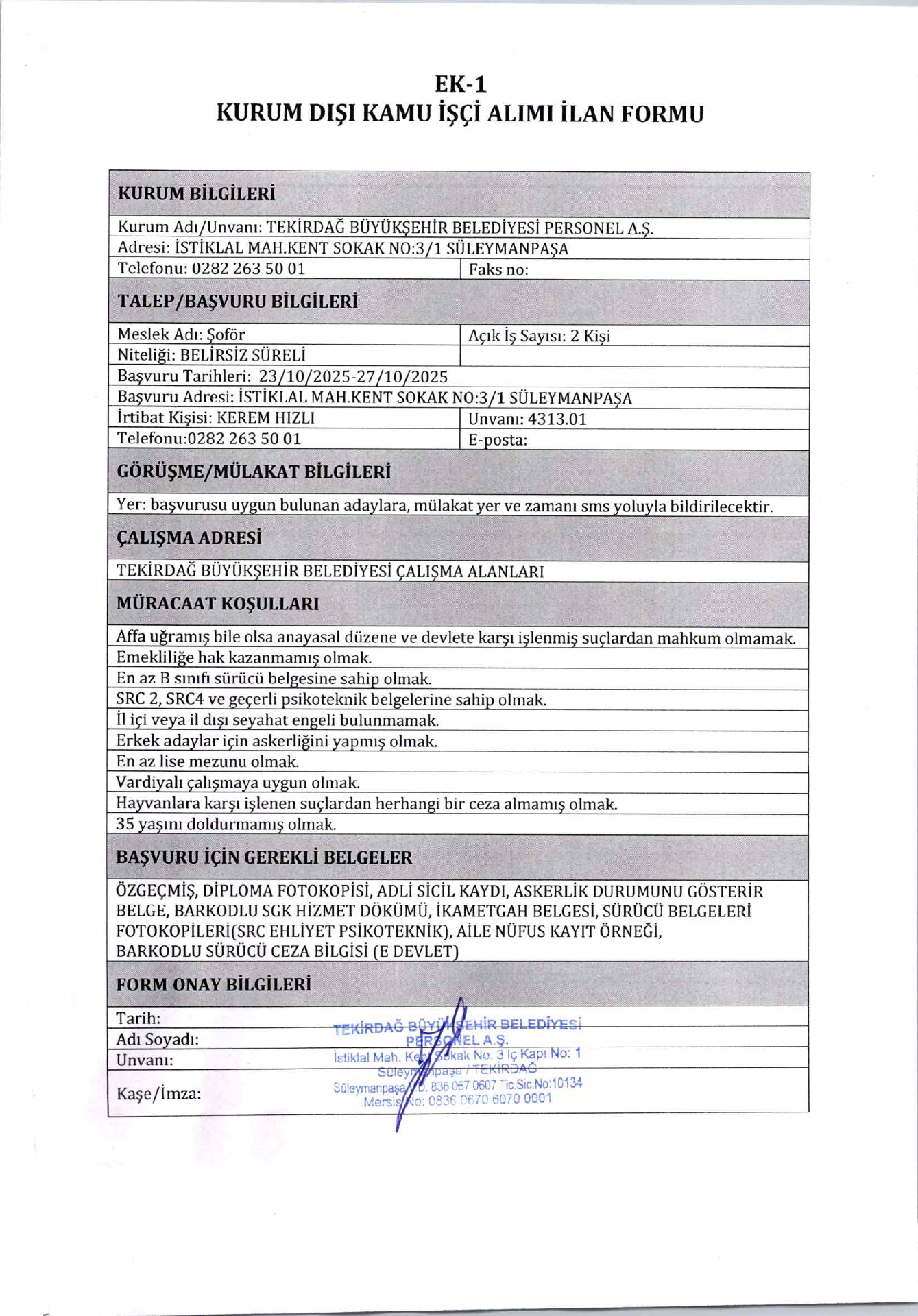 Ana sayfaDaimi İşçi İlanları Tekirdağ Büyükşehir Belediyesi 15 İşçi Alacak Tekirdağ Büyükşehir Belediyesi 15 İşçi Alacak. Son başvuru tarihi 27 Ekim 2025 Kaynak : İşkur İlan Giriş : 23 Ekim 2025 23:25, Son Güncelleme : 23 Ekim 2025 23:32 Yazdır Yorumlar (0) Abone Ol