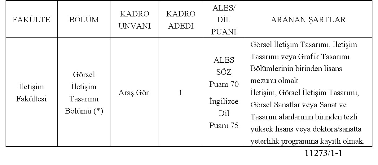 *Araştırma görevlisi kadrolarına başvurularda tezli yüksek lisans, doktora veya sanatta yeterlik eğitimi öğrencisi olmak şartı aranır.