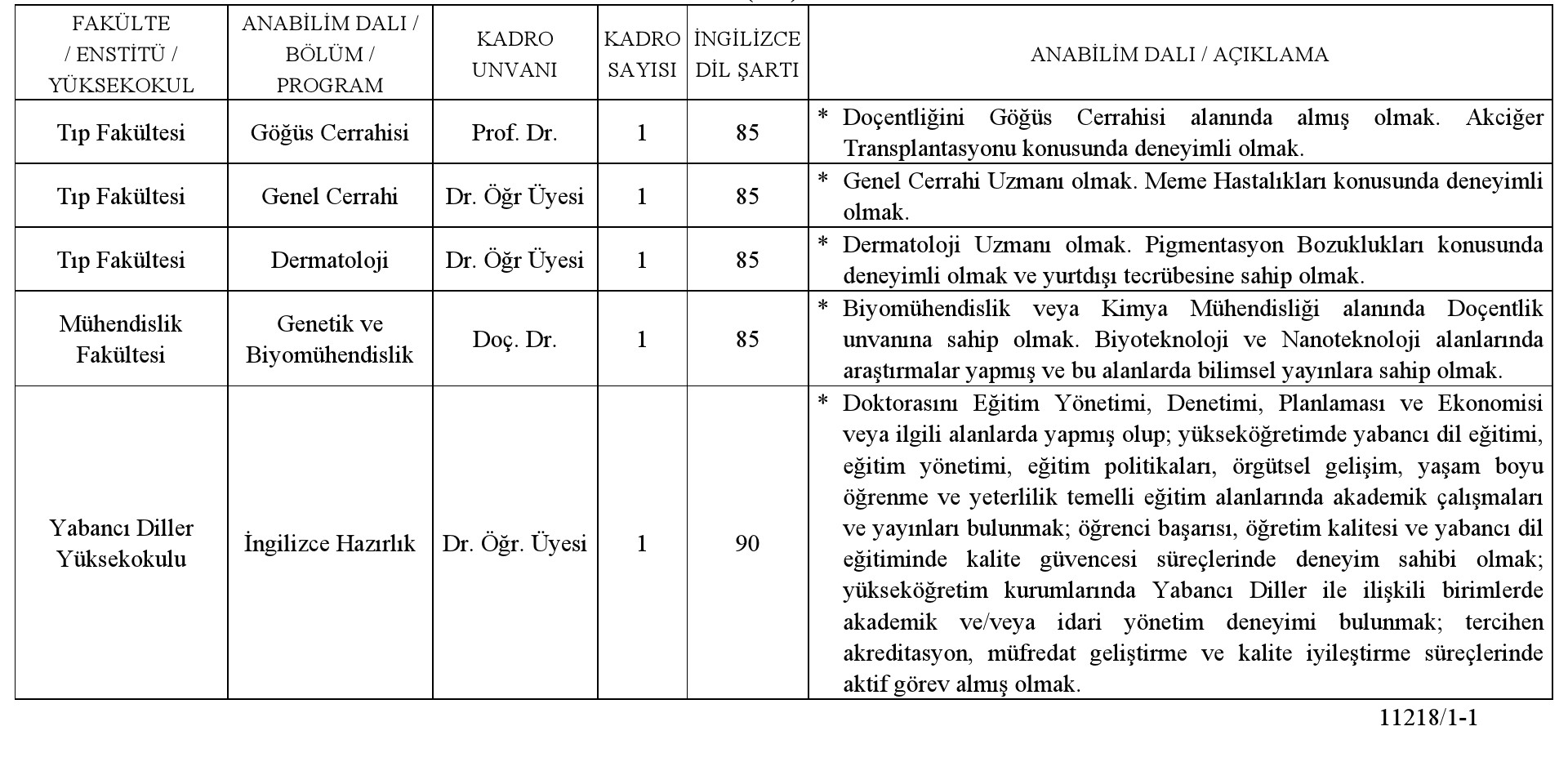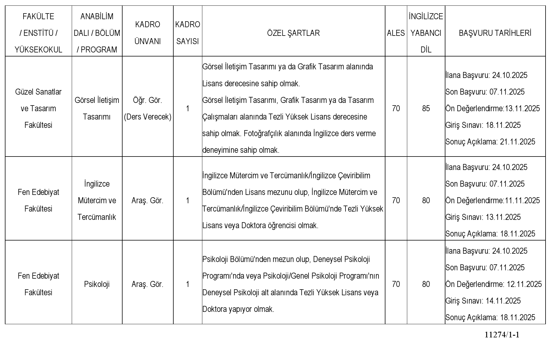 1. Üniversitemize 2547 sayılı Yükseköğretim Kanunu ve 09.11.2018 tarih ve 30590 sayılı Resmi Gazete'de yayımlanarak yürürlüğe giren "Öğretim Üyesi Dışındaki Öğretim Elemanı Kadrolarına Yapılacak Atamalarda Uygulanacak Merkezi Sınav ile Giriş Sınavlarına İlişkin Usul ve Esaslar Hakkında Yönetmelik"in ilgili maddeleri uyarınca Üniversitemize aşağıda nitelikleri belirtilen kadrolara Öğretim Görevlisi / Araştırma Görevlisi alınacaktır.