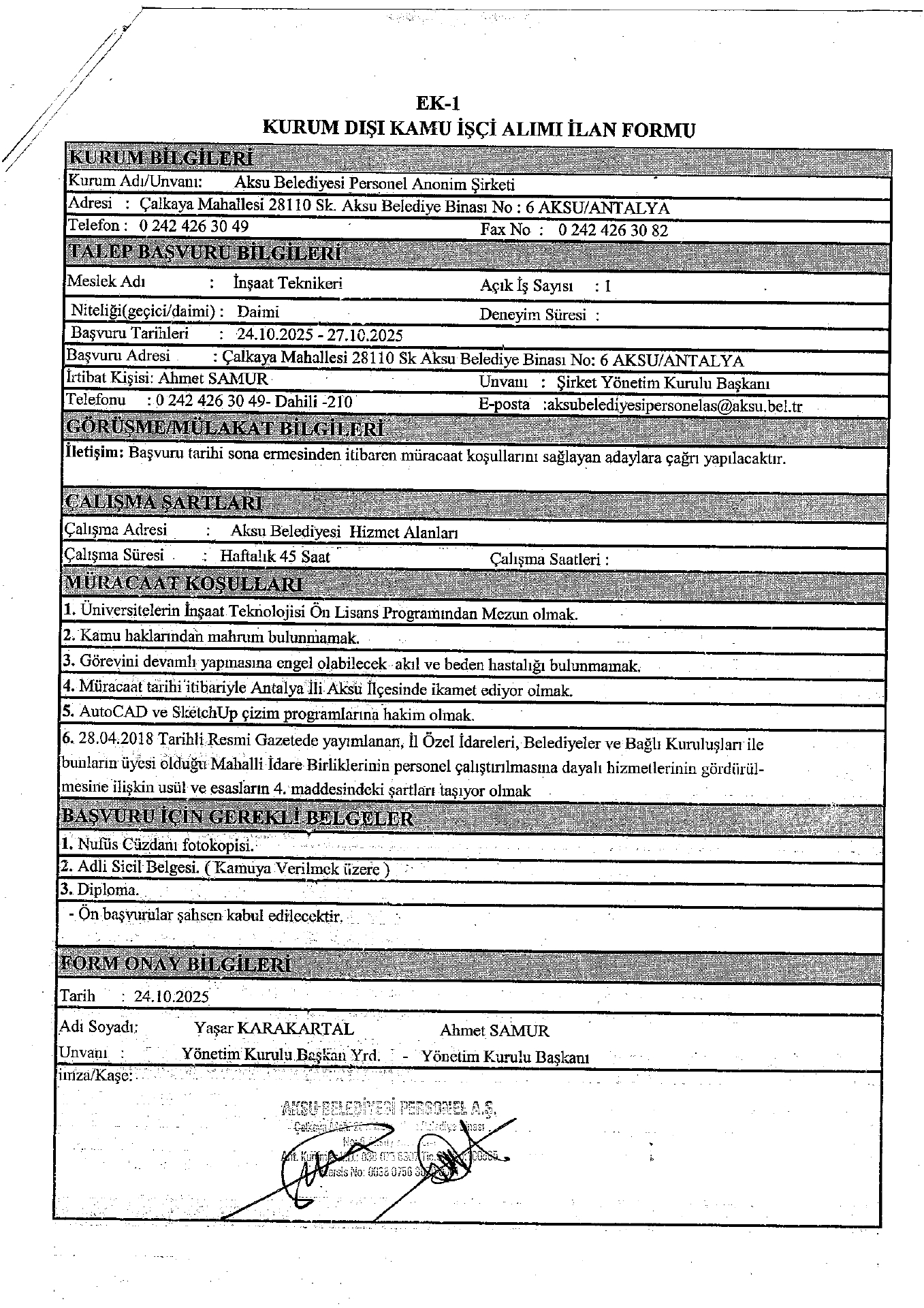 Ana sayfaDaimi İşçi İlanları Antalya Aksu Belediyesi 1 İşçi Alacak Antalya Aksu Belediyesi 1 İşçi Alacak. Son başvuru tarihi 27 Ekim 2025 Kaynak : İşkur İlan Giriş : 24 Ekim 2025 22:55, Son Güncelleme : 25 Ekim 2025 02:25 Yazdır Yorumlar (0) Abone Ol