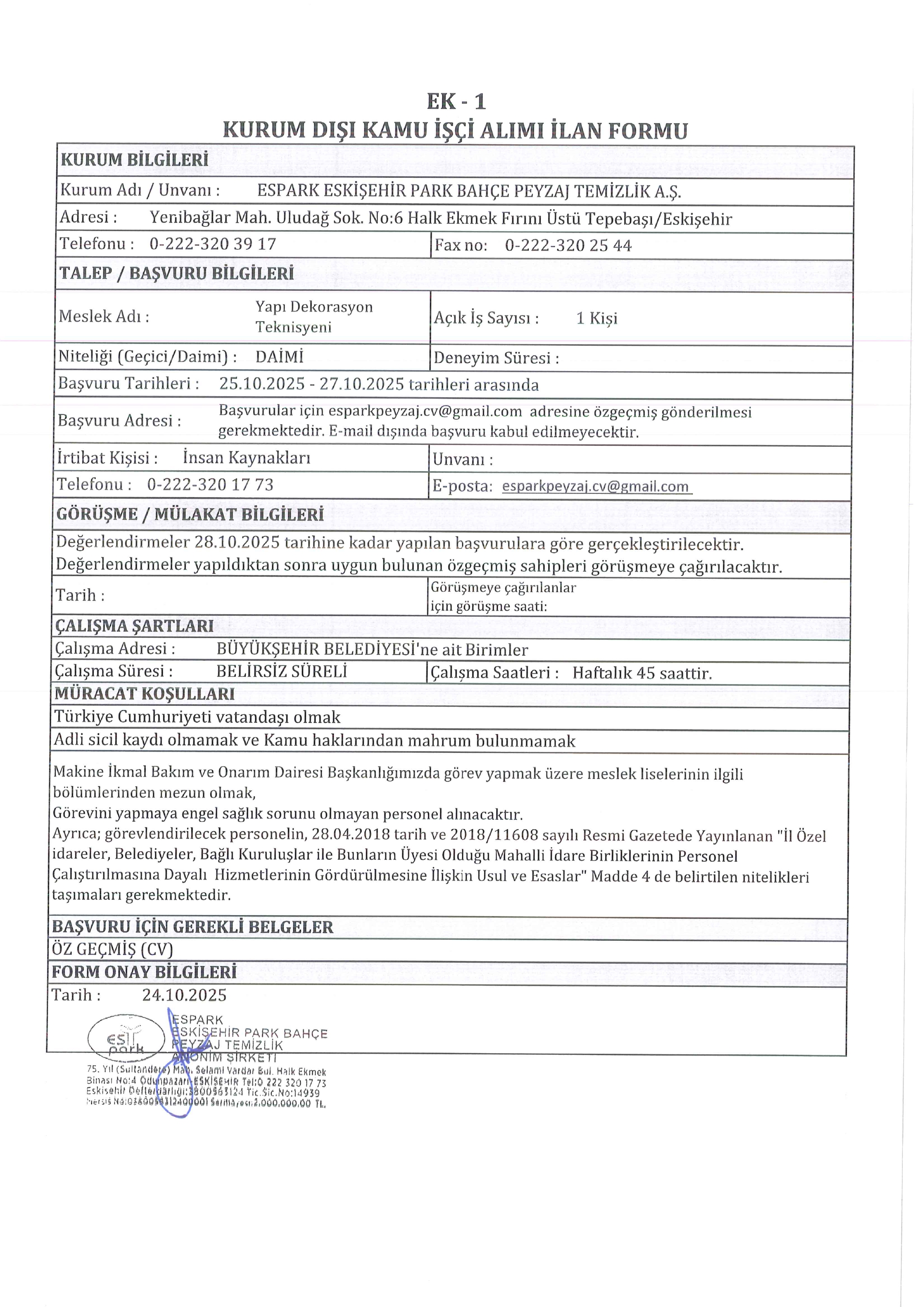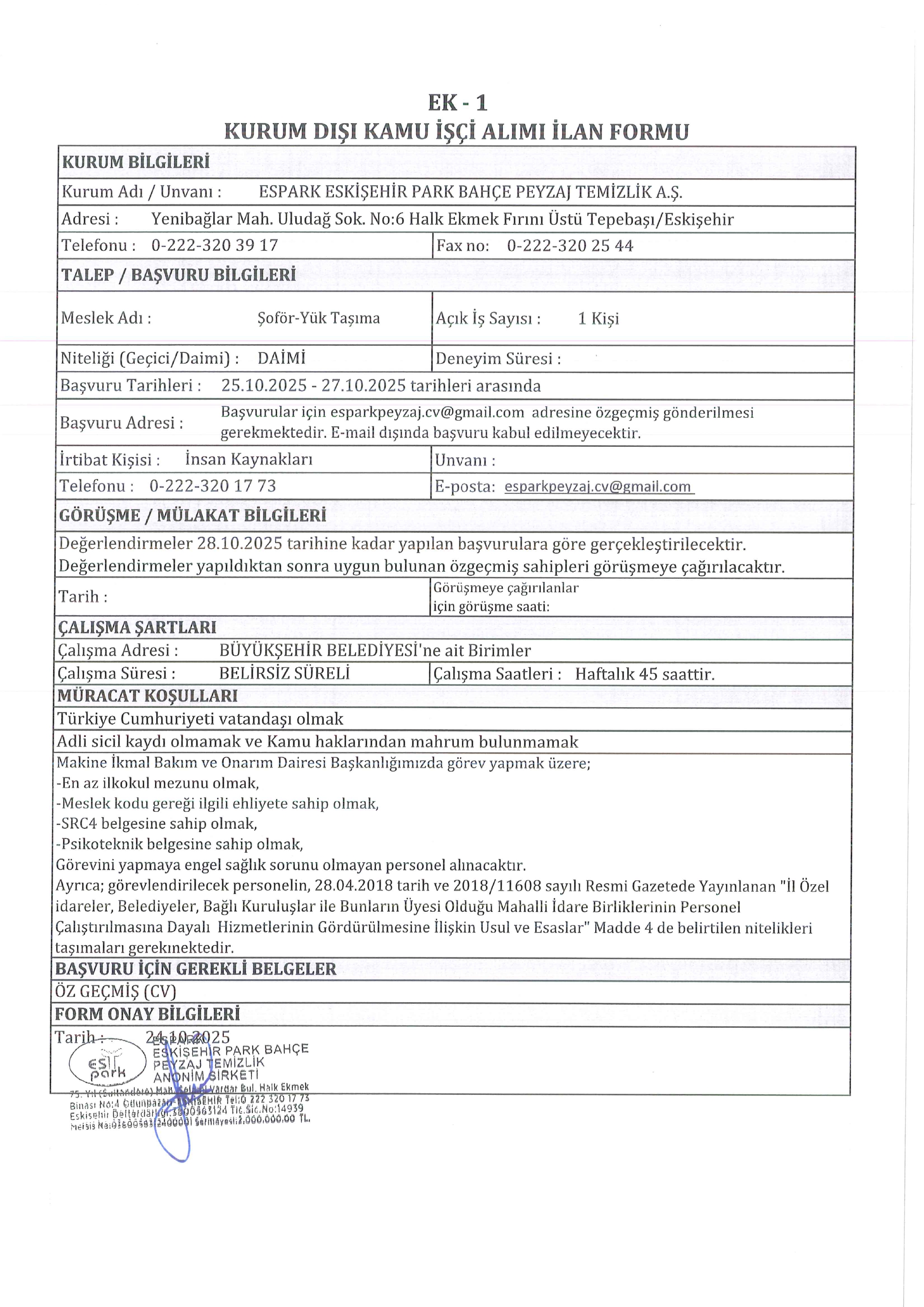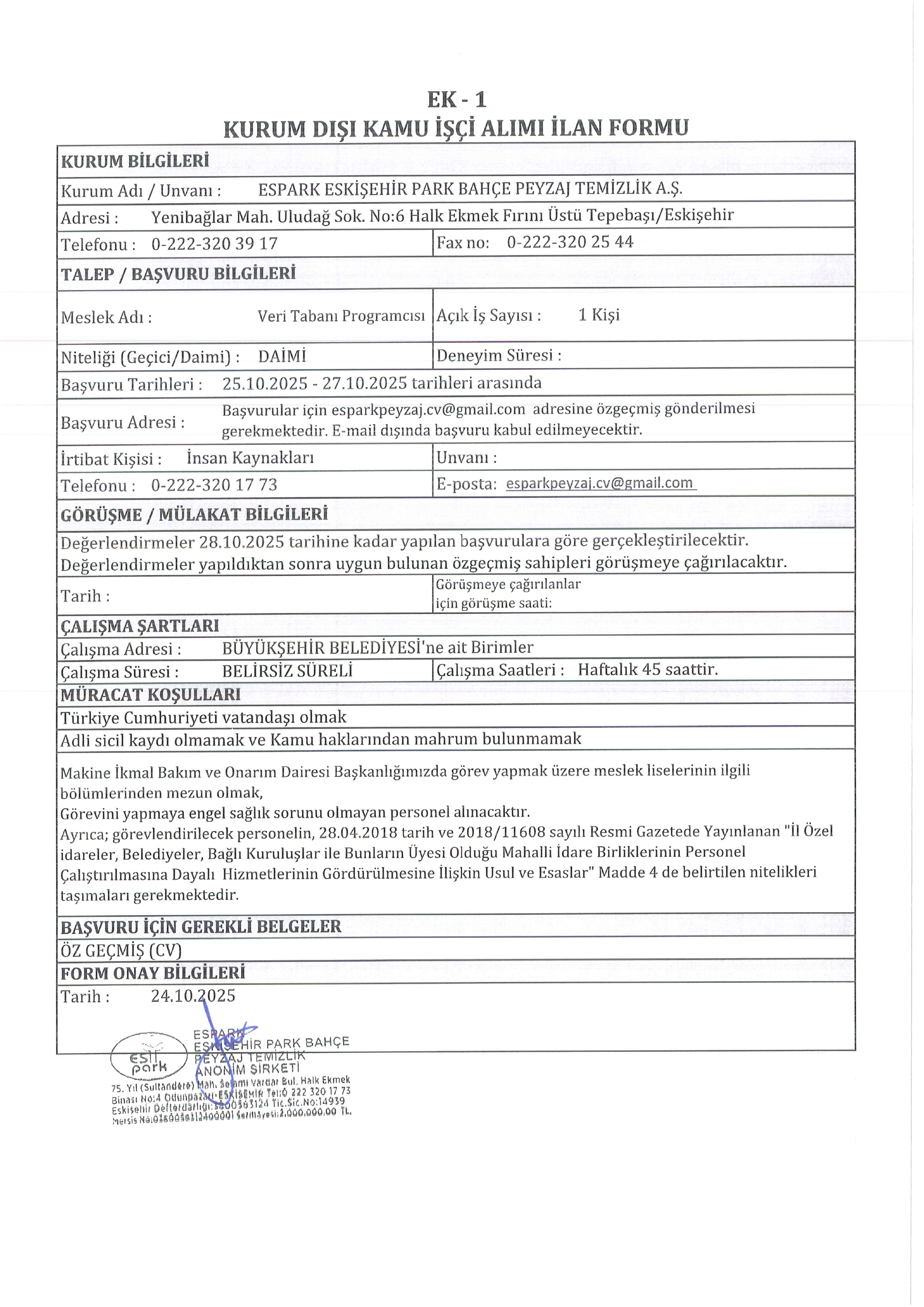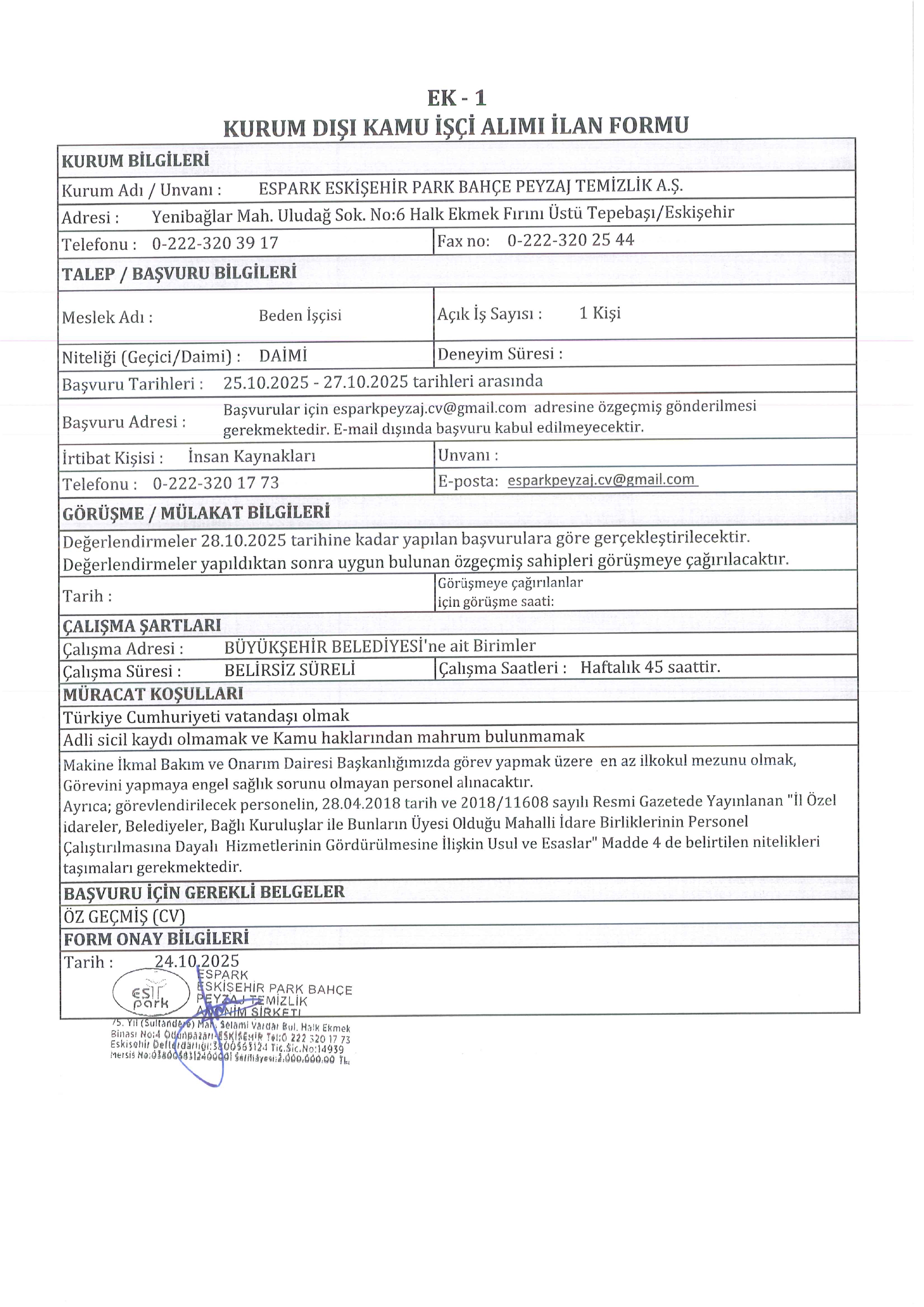 Ana sayfaDaimi İşçi İlanları Eskişehir Espark 5 İşçi Alacak Eskişehir Espark 5 İşçi Alacak. Son başvuru tarihi 27 Ekim 2025 Kaynak : İşkur İlan Giriş : 24 Ekim 2025 23:08, Son Güncelleme : 25 Ekim 2025 02:22 Yazdır Yorumlar (0) Abone Ol