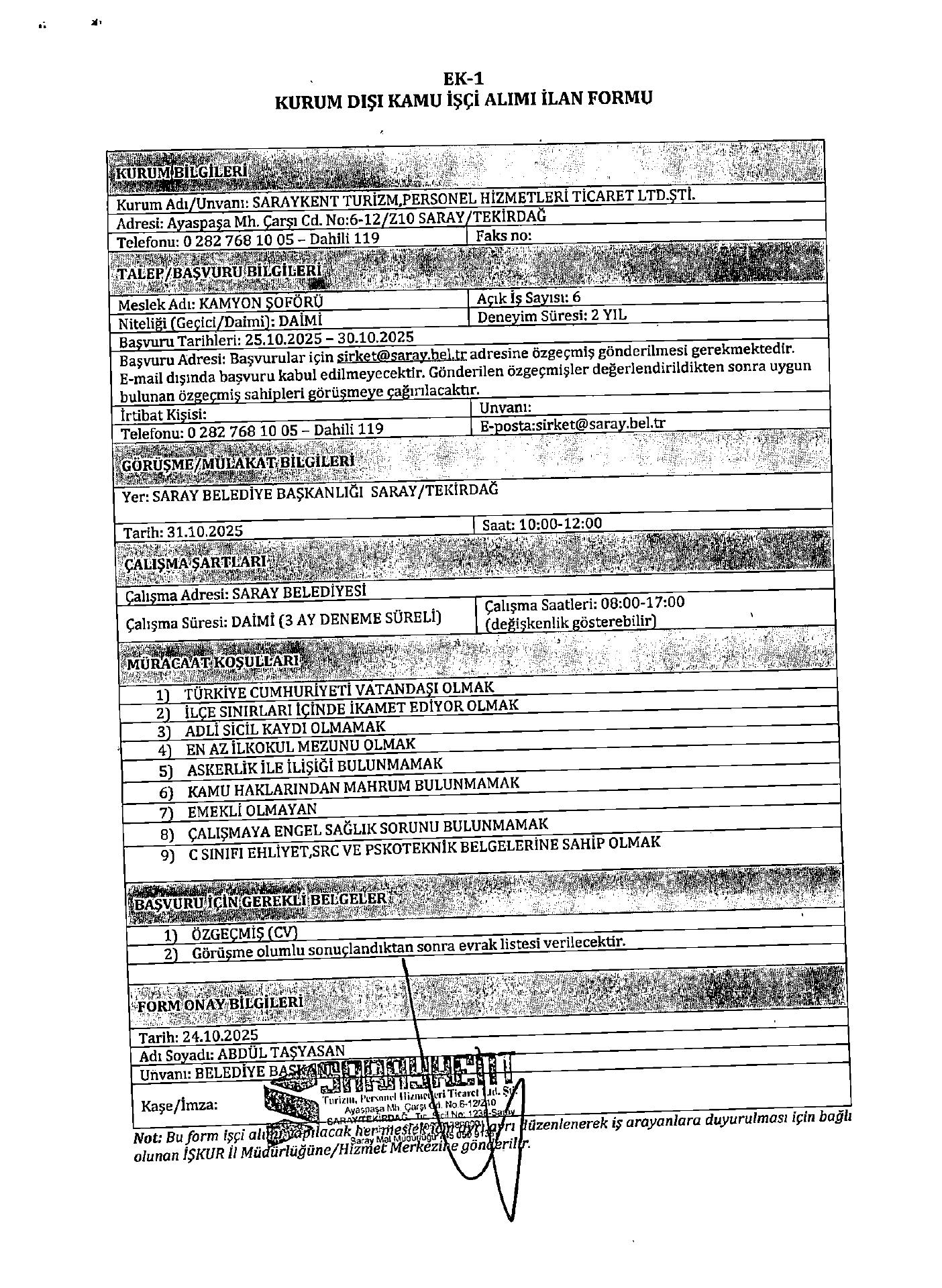 Tekirdağ Saraykent Turizm 6 İşçi Alacak