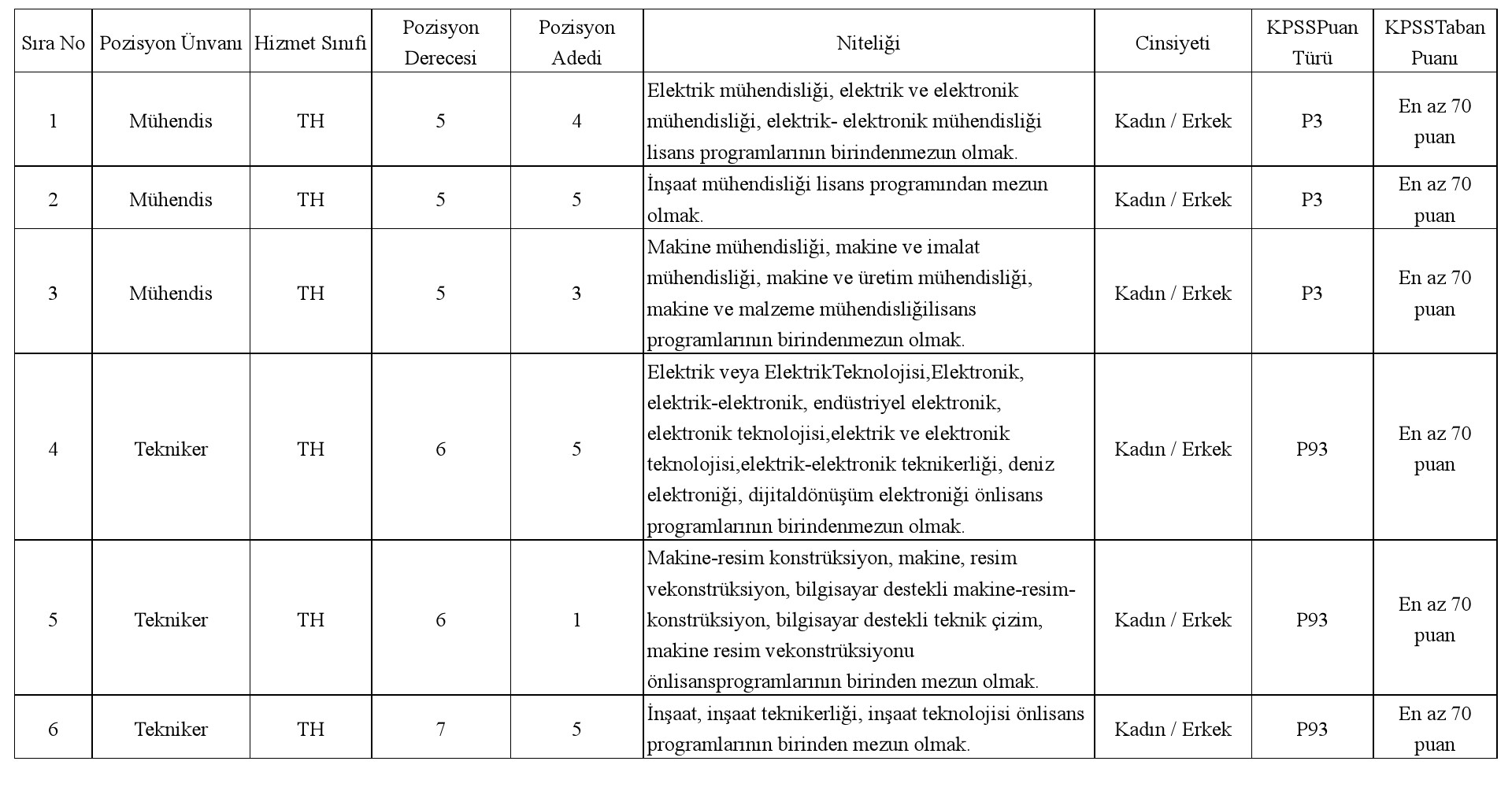 a) İlan edilen unvanlar için, mezun olunan okul itibarıyla öğrenim şartını taşımak ve bu öğrenimle ilgili olarak 2024 yılı Kamu Personel Seçme Sınavından (KPSS (B) grubu) alım yapılacak unvanların karşısındaki puan türünden, yukarıdaki tabloda belirtilen asgari KPSS puanını almış olmak,