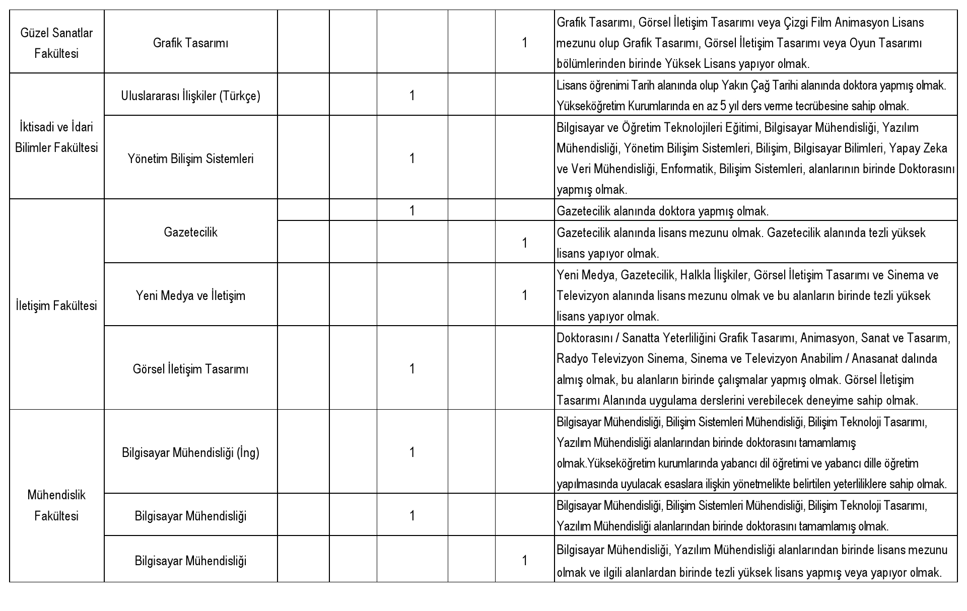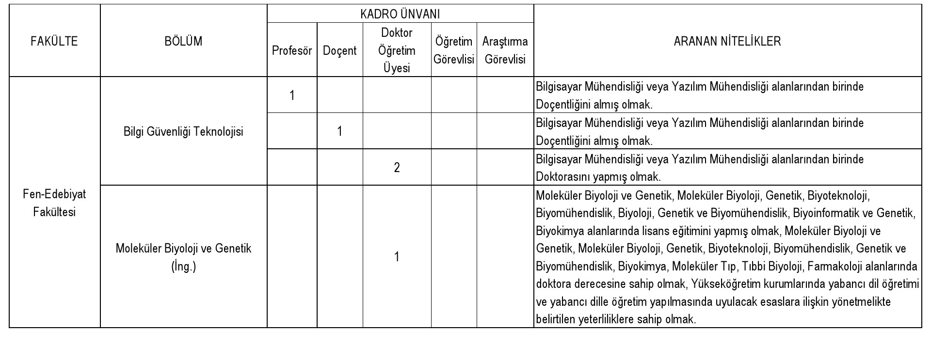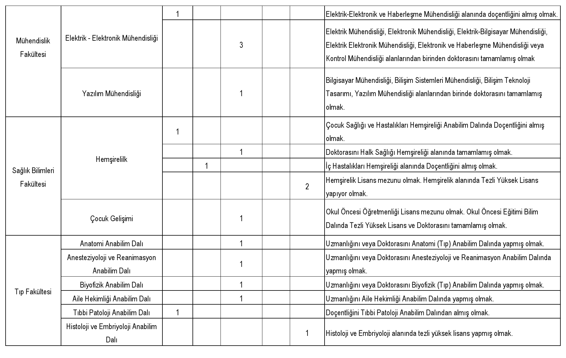 Üniversitemizin aşağıda belirtilen Fakülte/Yüksekokul bölümlerine 2547 sayılı Kanun'un ilgili maddelerine göre öğretim elemanları alınacaktır. 2547 sayılı Kanunun ilgili maddeleri, ""Öğretim Üyeliğine Yükseltilme ve Atanma Yönetmeliği"" ve 09/11/2018 tarih ve 30590 sayılı Resmi Gazete'de yayımlanan "Öğretim Üyesi Dışındaki Öğretim Elemanı Kadrolarına Yapılacak Atamalarda Uygulanacak Merkezi Sınav ile Giriş Sınavlarına İlişkin Usul ve Esaslar Hakkında Yönetmelik" hükümleri uyarınca ve ilandaki ""Aranan Nitelikler"" başlığı altında yer alan koşulları sağlayan öğretim elemanlarından;