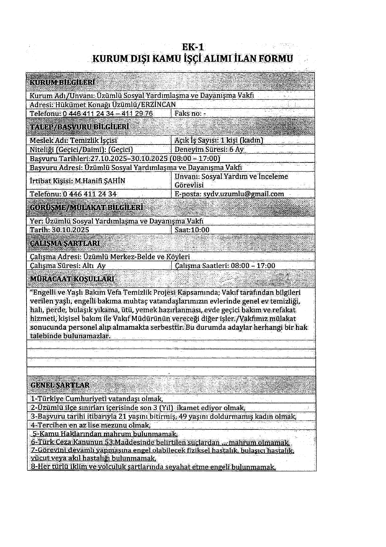 Erzincan Üzümlü SYDV Geçici 1 İşçi Alacak. Son başvuru tarihi 30 Ekim 2025