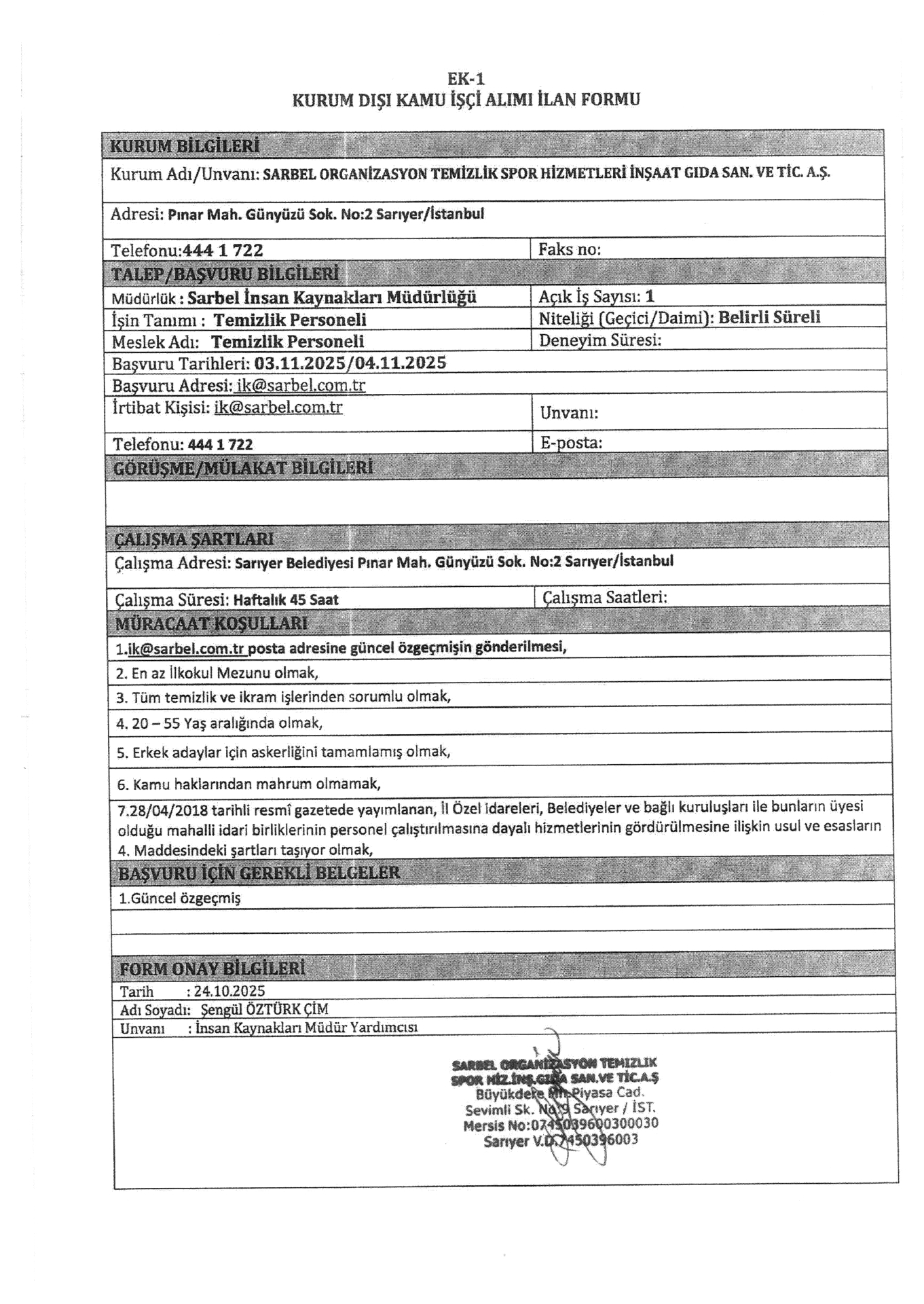 İstanbul Sarbel 1 İşçi Alacak. Son başvuru tarihi 4 Kasım 2025