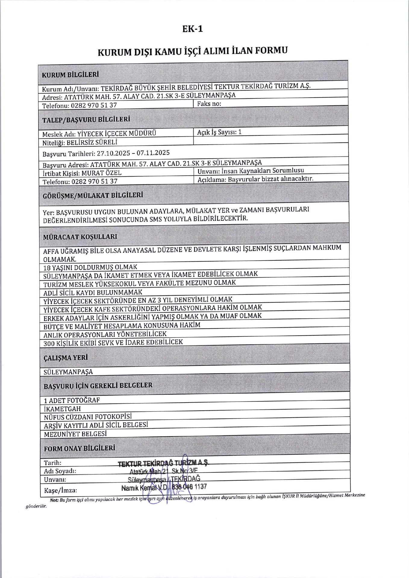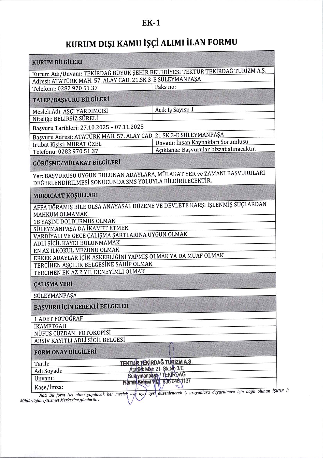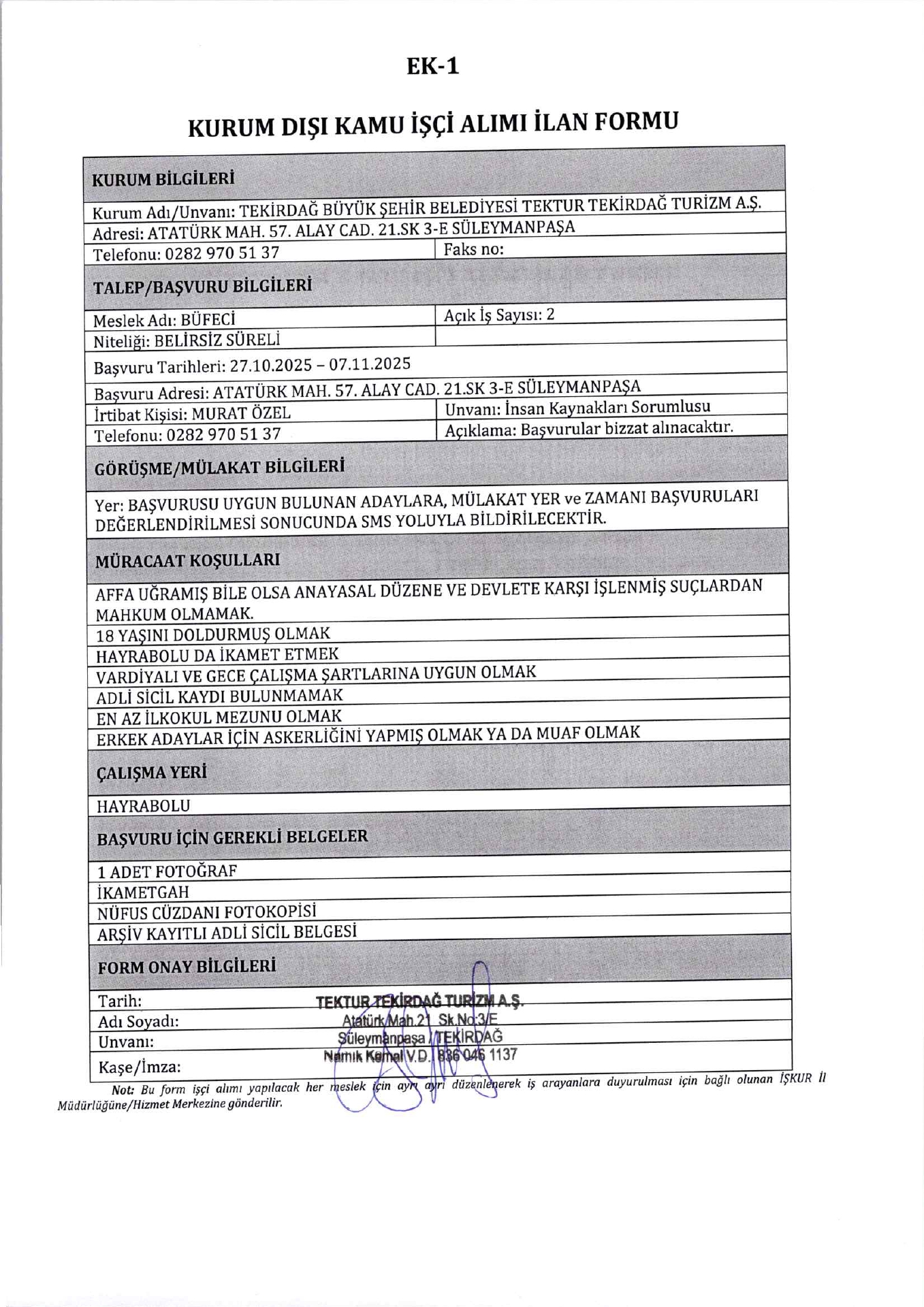 Ana sayfaDaimi İşçi İlanları Tekirdağ Tektur 4 İşçi Alacak Tekirdağ Tektur 4 İşçi Alacak. Son başvuru tarihi 7 Kasım 2025 Kaynak : İşkur İlan Giriş : 27 Ekim 2025 23:37, Son Güncelleme : 27 Ekim 2025 23:38 Yazdır Yorumlar (0) Abone Ol