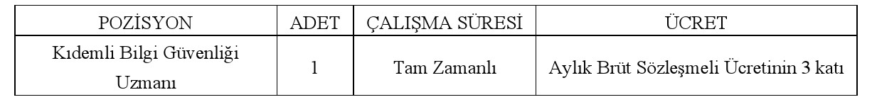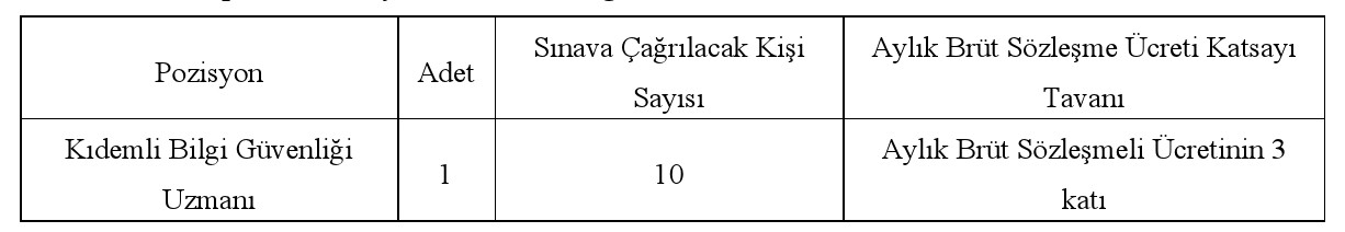 Başvuruların incelenmesinden sonra genel ve özel şartları sağlayan adaylardan KPSSP3 (B) puanının yüzde yetmişi (KPSS puanı olmayan veya belge ibraz etmeyen adayın KPSS puanı 70 (yetmiş) olarak dikkate alınır.) ile yabancı dil puanının yüzde otuzunun [belge ibraz etmeyenlerin yabancı dil puanı 0 (sıfır) olarak değerlendirilir] toplamı esas alınarak, sınava katılma şartlarını taşıyan ve usulüne uygun olarak başvuranlar arasından yapılacak sıralamaya göre en yüksek puanlıdan başlamak üzere sözleşmeli bilişim personeli pozisyon adedinin(Kıdemli Bilgi Güvenliği Uzmanı) 10 (on) katı aday sınava alınacaktır. Bu sıralamaya göre son sırada aynı puana sahip birden fazla adayın bulunması halinde, bu kişilerin tamamı sınava kabul edilir.