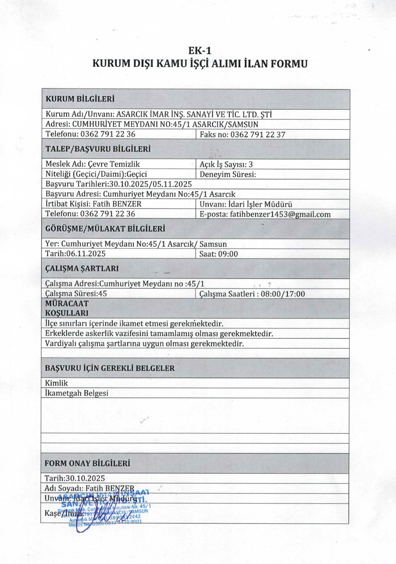 Ana sayfaGeçici İşçi İlanları Samsun Asarcık İmar Geçici 3 İşçi Alacak Samsun Asarcık İmar Geçici 3 İşçi Alacak. Son başvuru tarihi 5 Kasım 2025 Kaynak : İşkur İlan Giriş : 31 Ekim 2025 00:30, Son Güncelleme : 31 Ekim 2025 01:51 Yazdır Yorumlar (0) Abone Ol