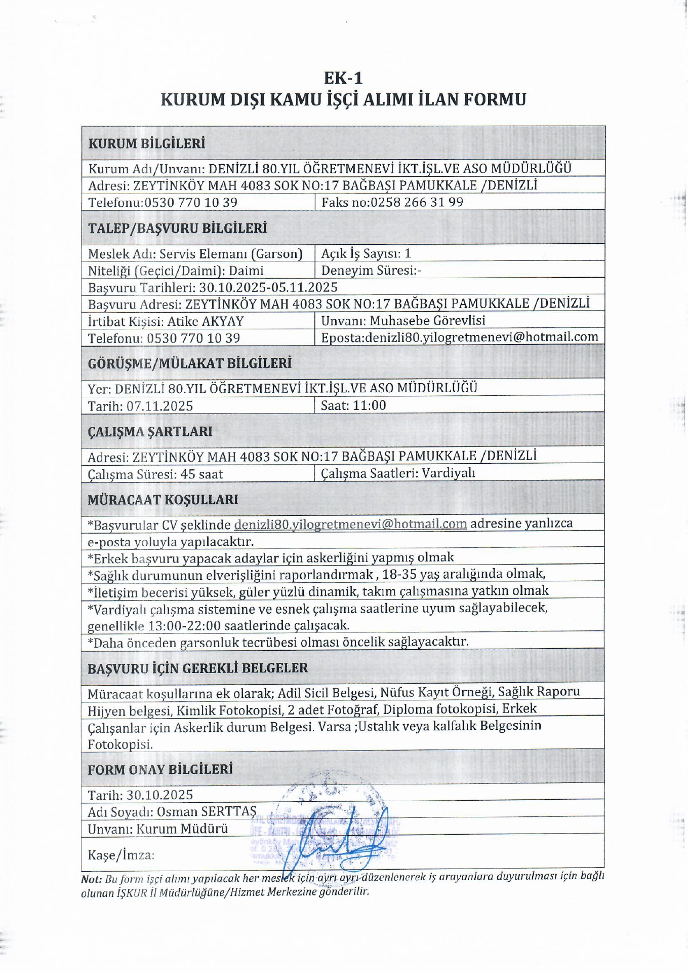 Ana sayfaDaimi İşçi İlanları Denizli 80 Yıl Öğretmenevi 1 İşçi Alacak Denizli 80 Yıl Öğretmenevi 1 İşçi Alacak. Son başvuru tarihi 5 Kasım 2025 Kaynak : İşkur İlan Giriş : 31 Ekim 2025 00:36, Son Güncelleme : 31 Ekim 2025 01:50 Yazdır Yorumlar (0) Abone Ol