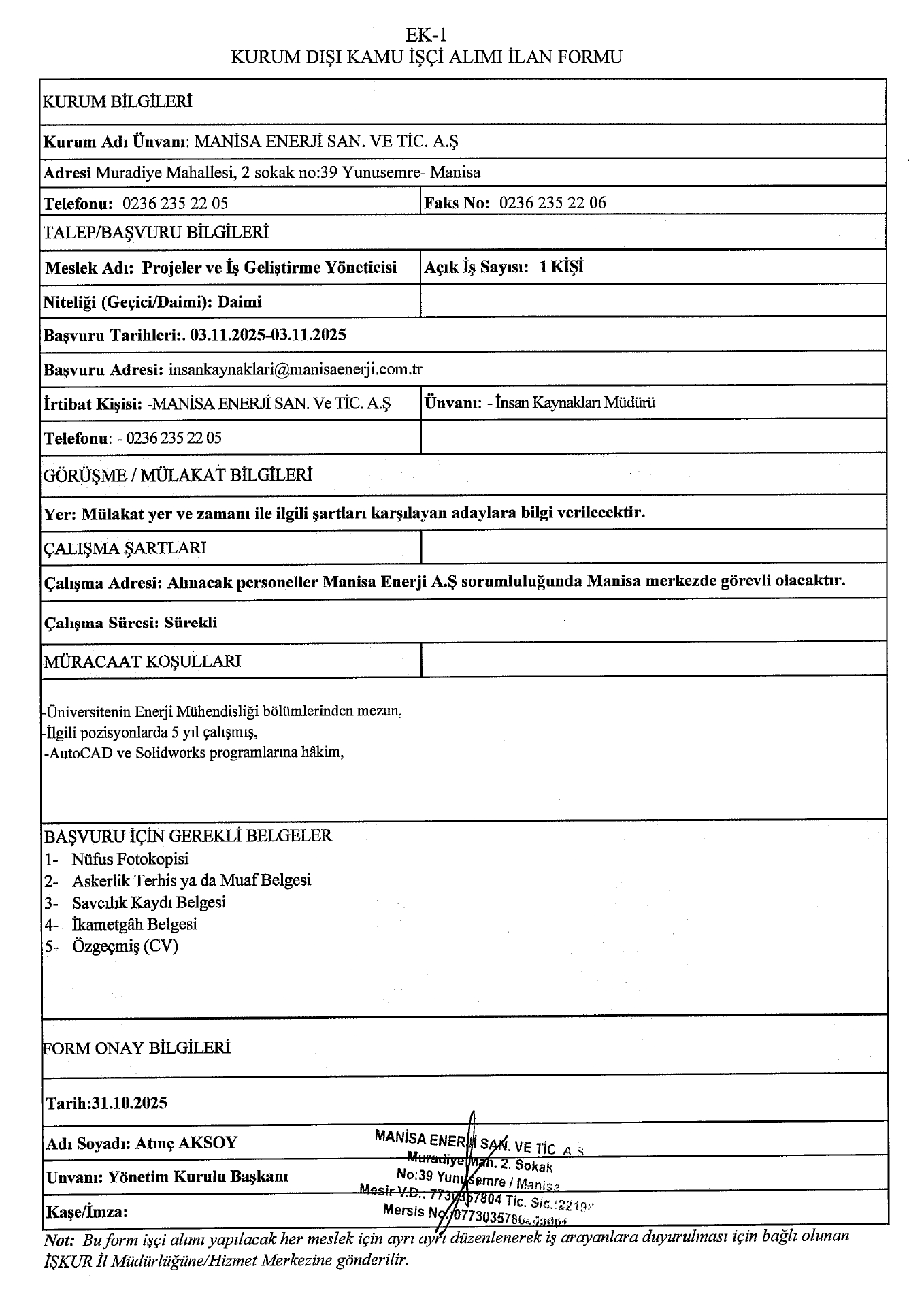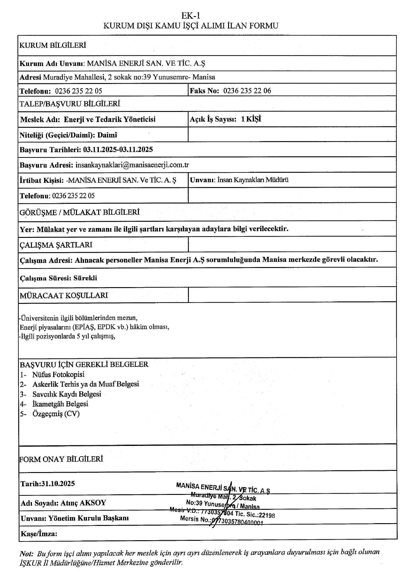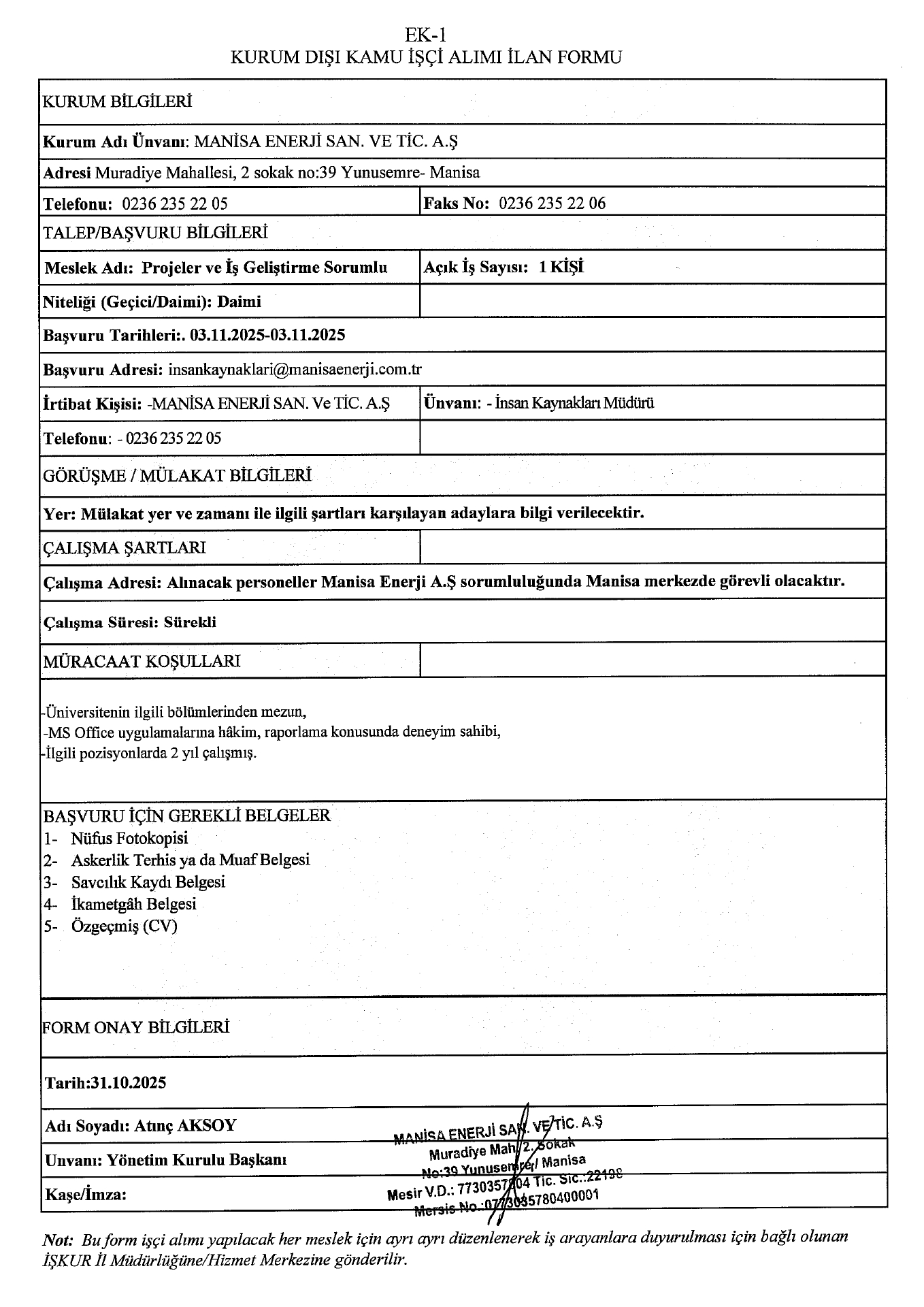 Ana sayfaDaimi İşçi İlanları Manisa Enerji 4 İşçi Alacak Manisa Enerji 4 İşçi Alacak. Son başvuru tarihi 3 Kasım 2025 Kaynak : İşkur İlan Giriş : 31 Ekim 2025 00:52, Son Güncelleme : 31 Ekim 2025 01:45 Yazdır Yorumlar (0) Abone Ol