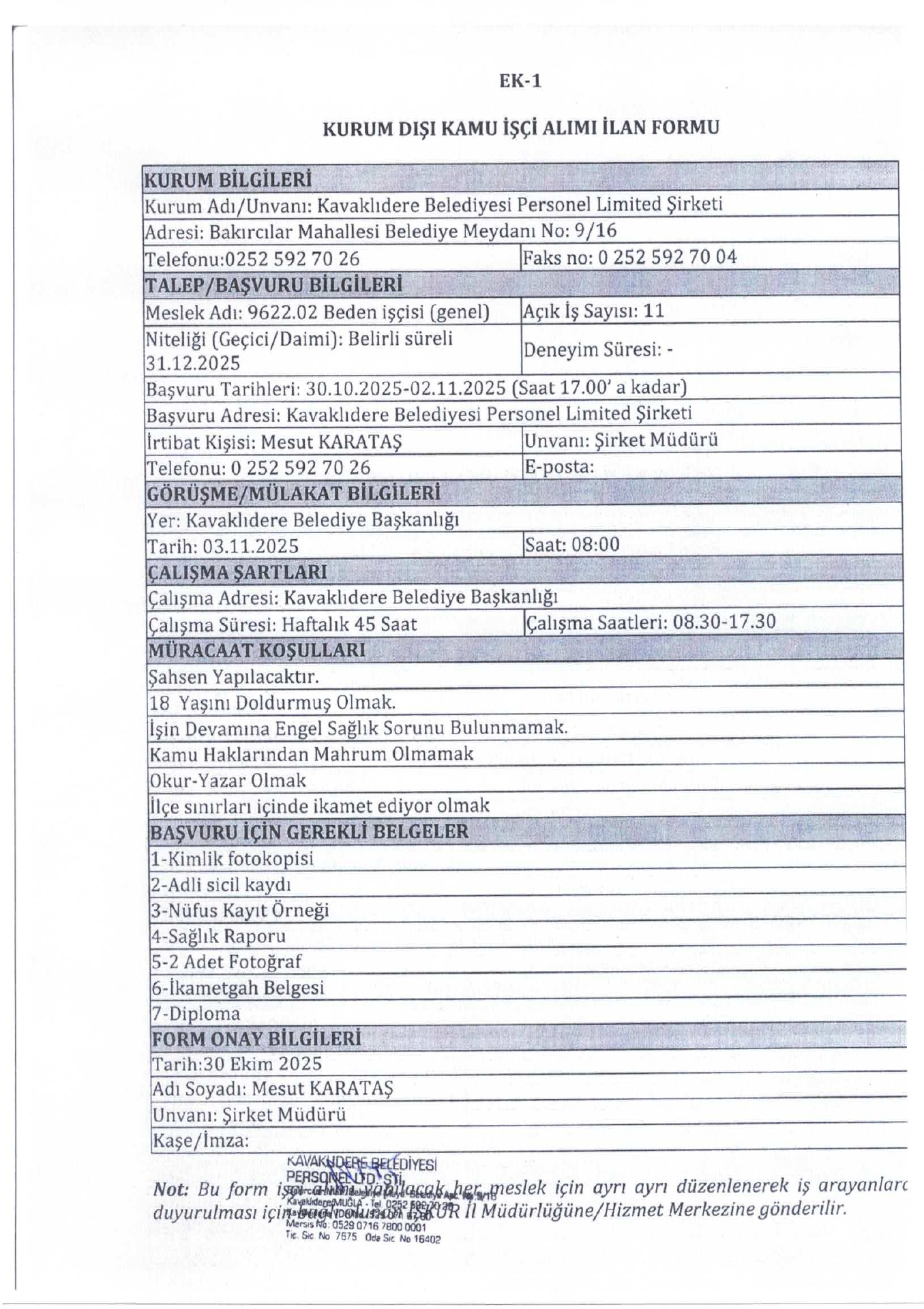 Ana sayfaDaimi İşçi İlanları Muğla Kavaklıdere Belediyesi 11 İşçi Alacak Muğla Kavaklıdere Belediyesi 11 İşçi Alacak. Son başvuru tarihi 2 Kasım 2025 Kaynak : İşkur İlan Giriş : 31 Ekim 2025 00:55, Son Güncelleme : 31 Ekim 2025 01:45 Yazdır Yorumlar (0) Abone Ol