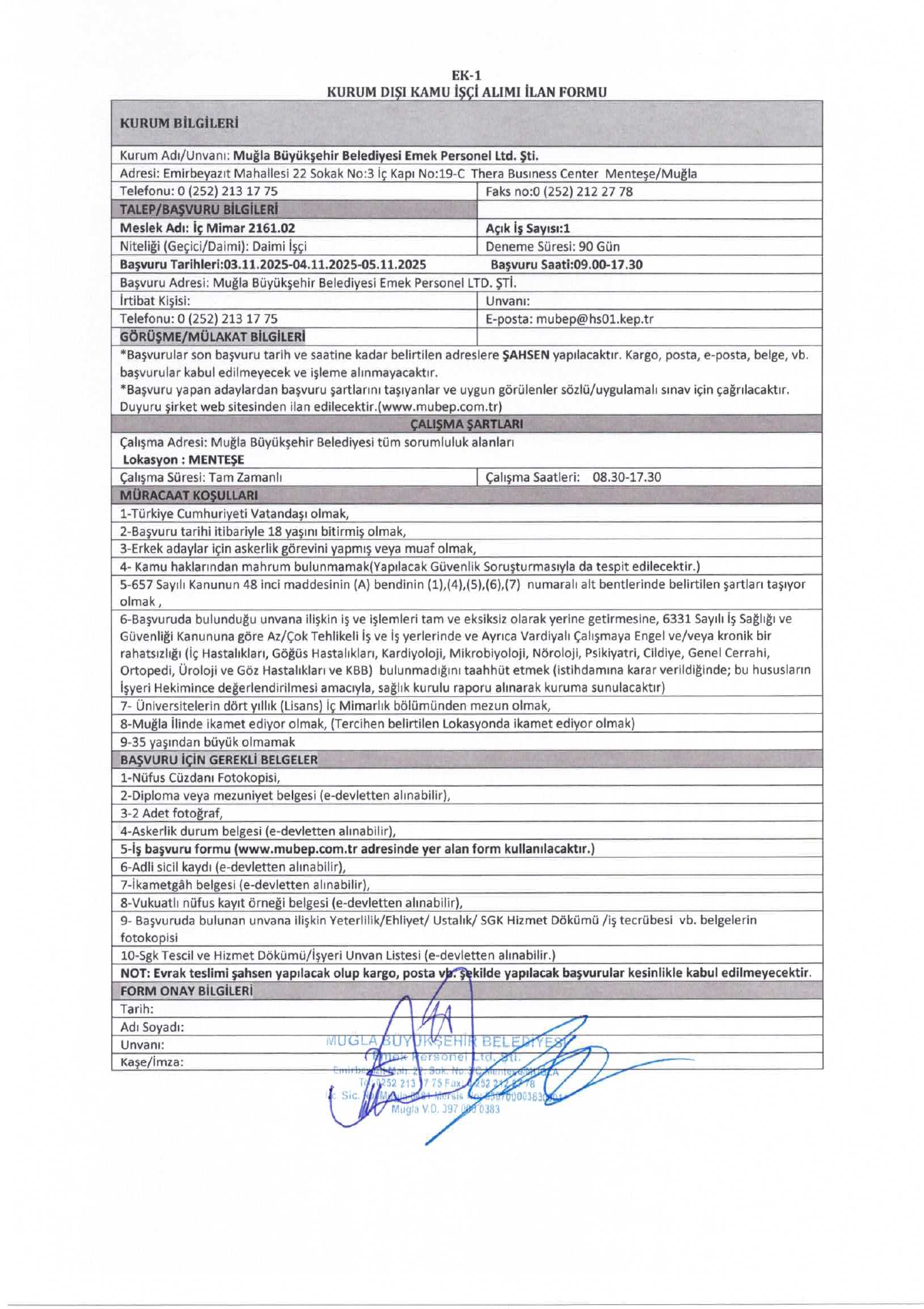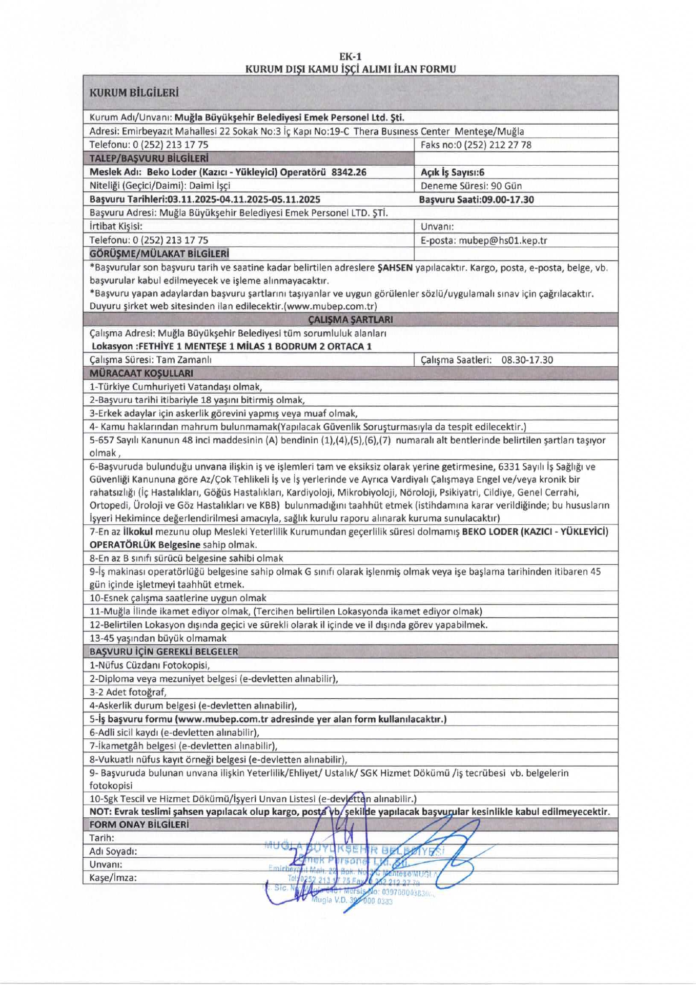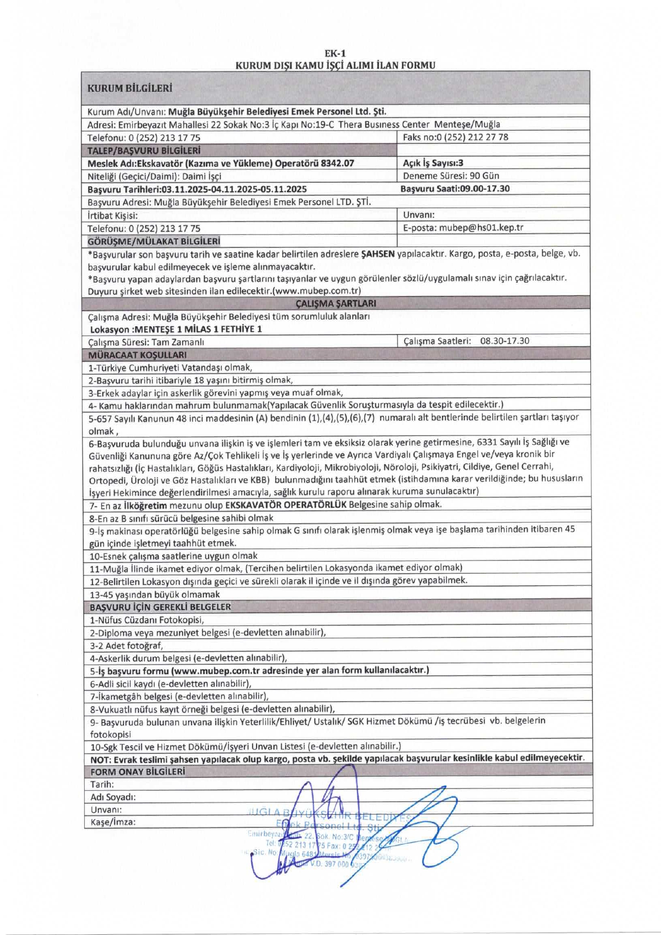 Muğla Büyükşehir Belediyesi 15 İşçi Alacak. Son başvuru tarihi 5 Kasım 2025