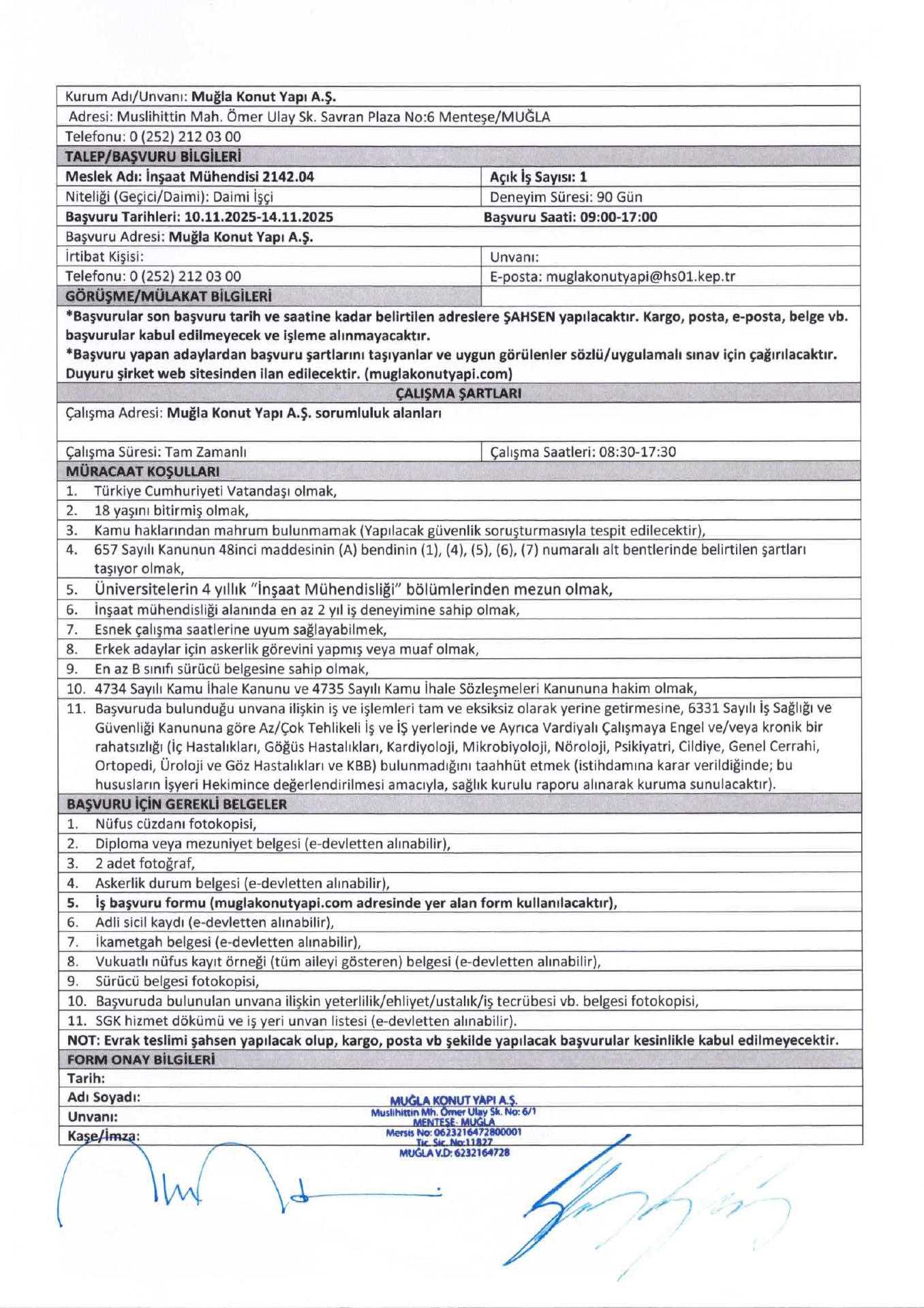 Ana sayfaDaimi İşçi İlanları Muğla Konut Yapı 1 İşçi Alacak Muğla Konut Yapı 1 İşçi Alacak. Son başvuru tarihi 14 Kasım 2025 Kaynak : İşkur İlan Giriş : 31 Ekim 2025 23:51, Son Güncelleme : 31 Ekim 2025 23:42 Yazdır Yorumlar (0) Abone Ol