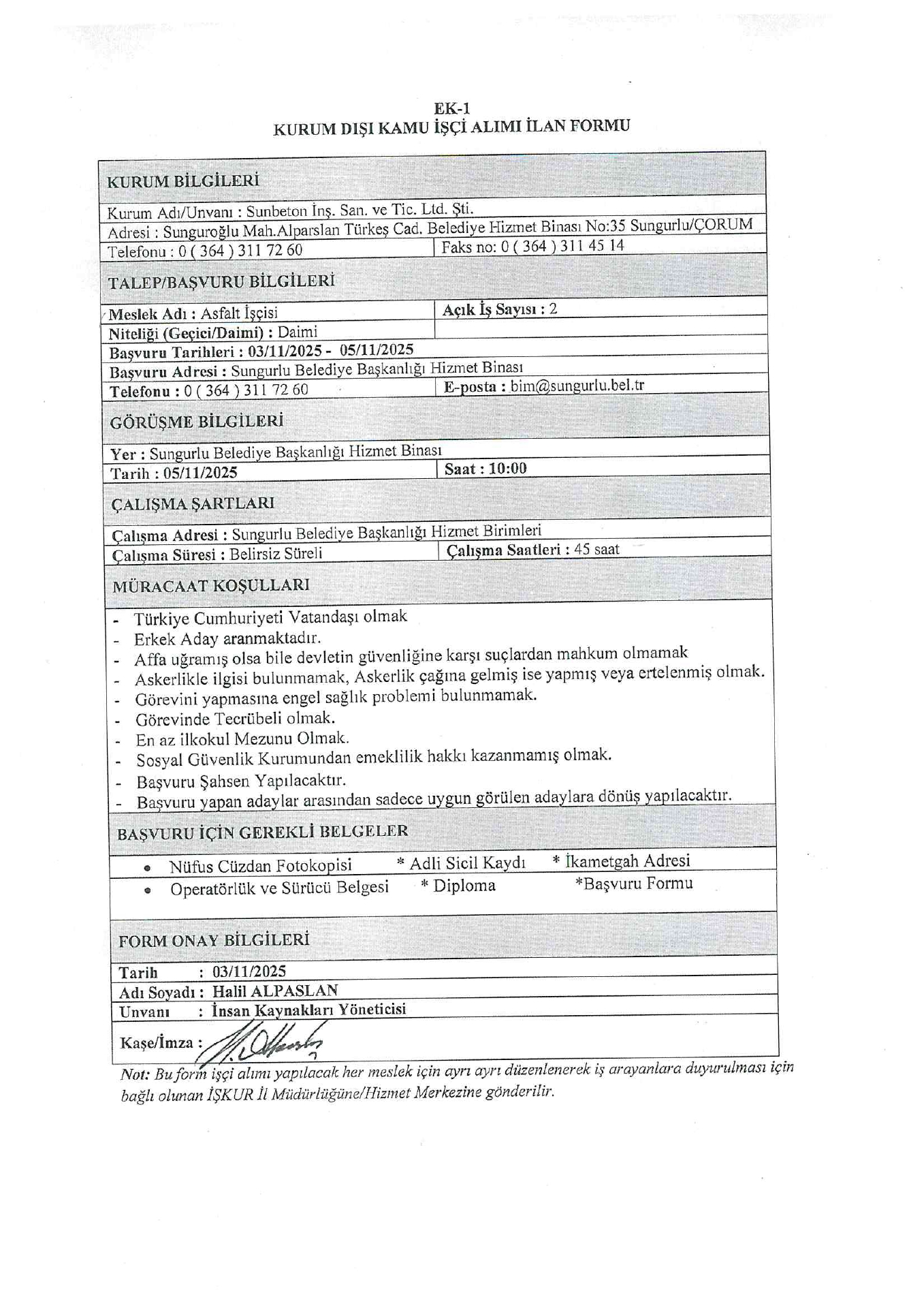 Ana sayfaDaimi İşçi İlanları Çorum Sunbeton 2 İşçi Alacak Çorum Sunbeton 2 İşçi Alacak. Son başvuru tarihi 5 Kasım 2025 Kaynak : İşkur İlan Giriş : 31 Ekim 2025 23:57, Son Güncelleme : 31 Ekim 2025 23:41 Yazdır Yorumlar (0) Abone Ol