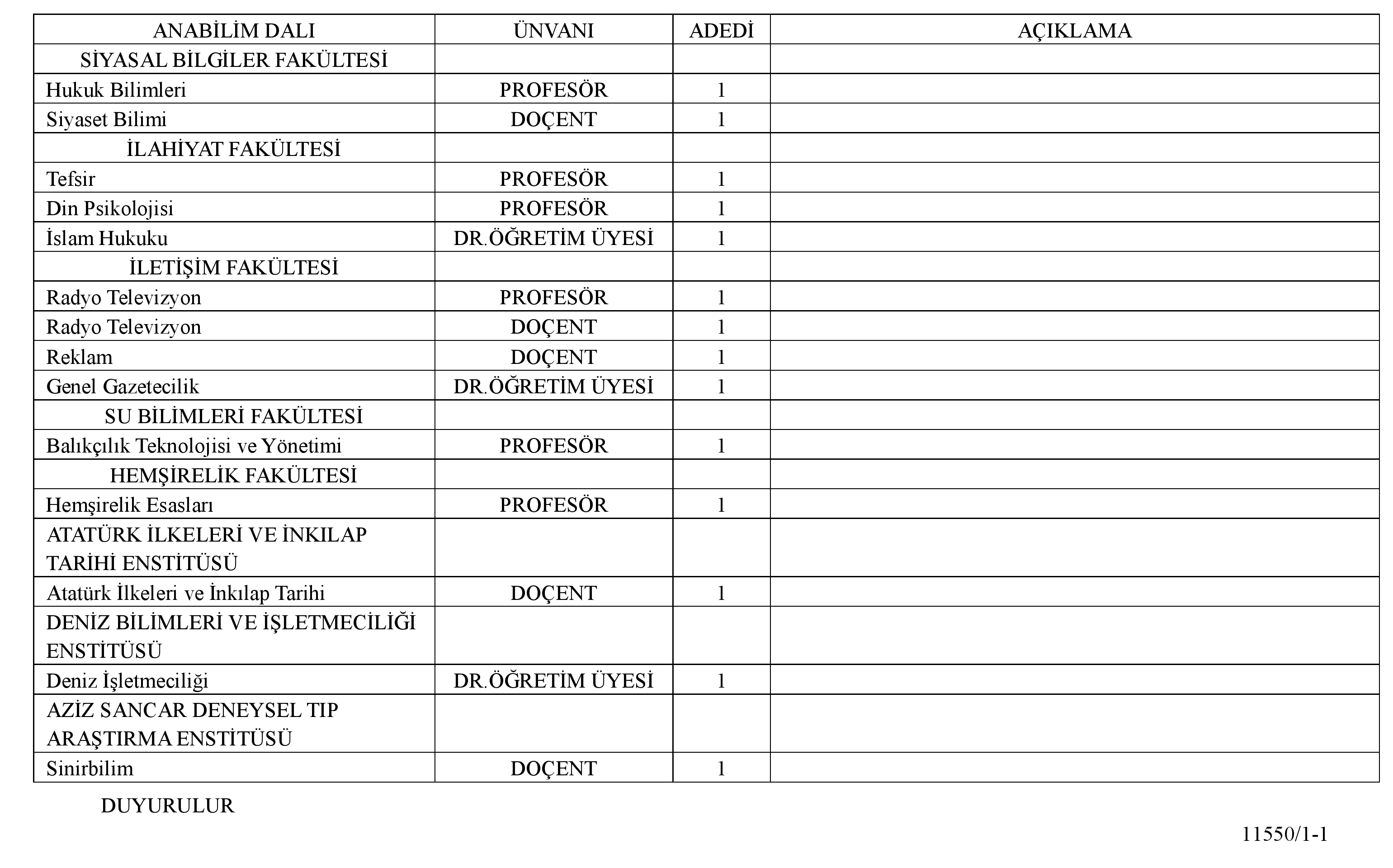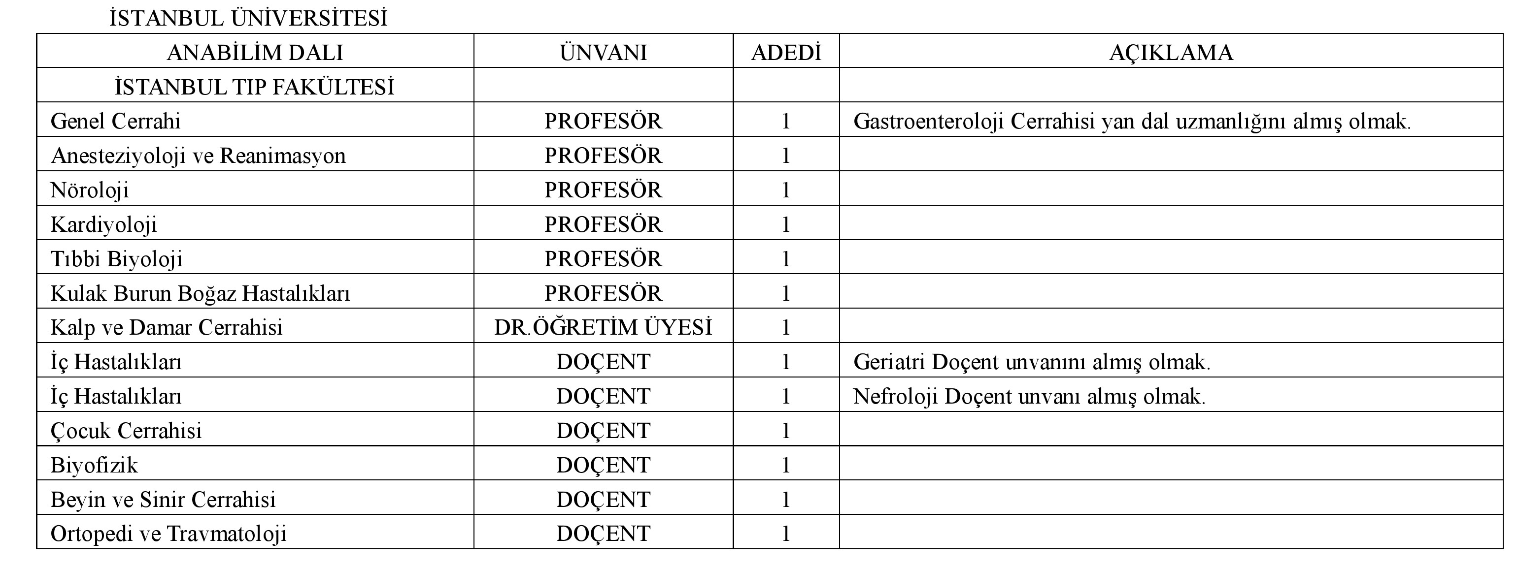 Üniversitemizin aşağıda isimleri yazılı birimlerine, 2547 sayılı Kanunun ilgili maddeleri, 657 sayılı Devlet Memurları Kanunu'nun 48. maddesi, 12.06.2018 tarihli Resmi Gazete'de yayımlanarak yürürlüğe giren "Öğretim Üyeliğine Yükseltilme ve Atanma Yönetmeliği"nin ilgili maddeleri ve Yükseköğretim Kurulu Başkanlığınca onaylanan "İstanbul Üniversitesi Akademik Yükseltilme ve Atama Kriterleri" uyarınca Profesör, Doçent ve Doktor Öğretim Üyesi kadrolarına şahsen veya posta yoluyla eleman alınacaktır.