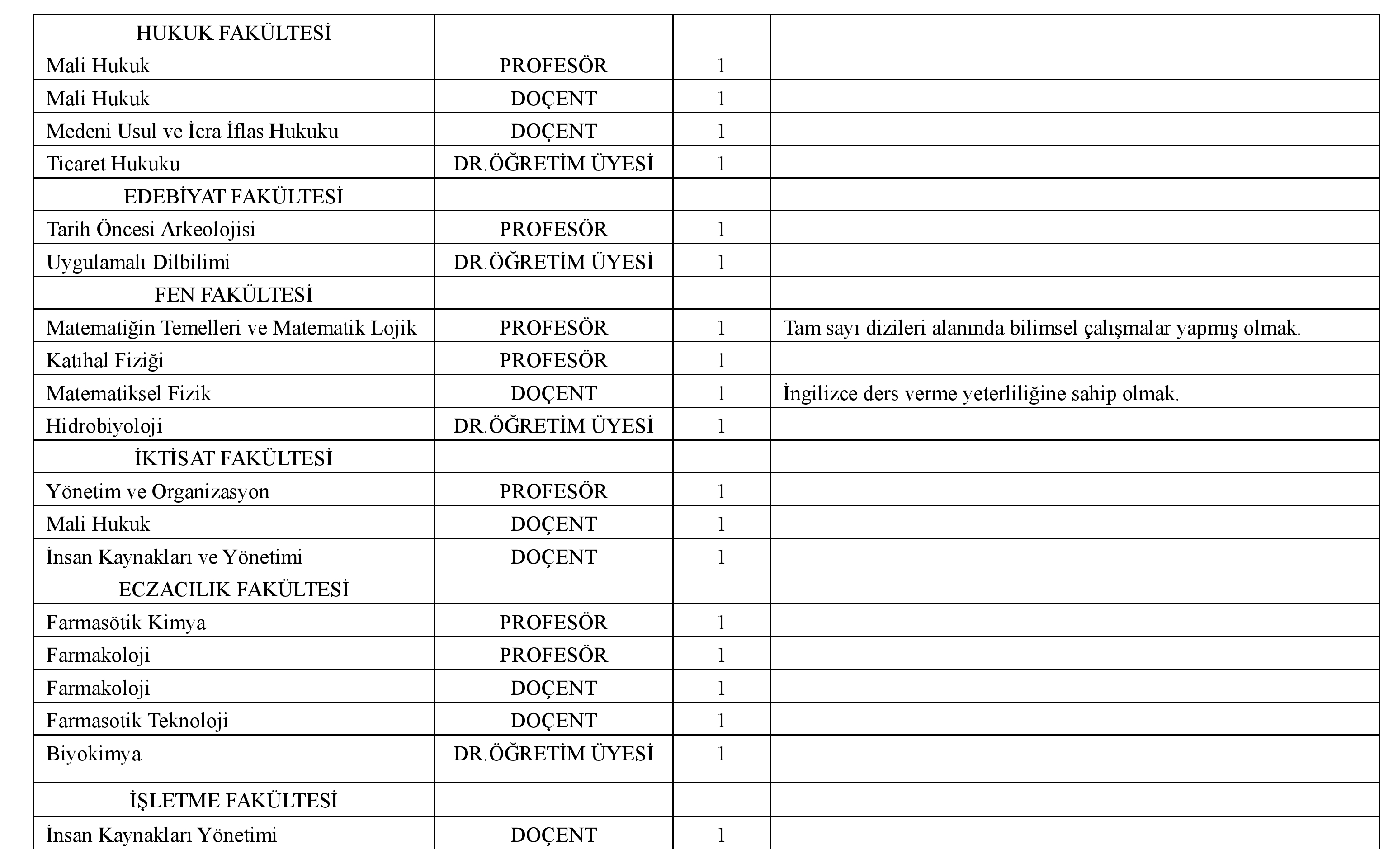 7. 2547 sayılı Kanunun Ek 38. maddesi uyarınca (2547 Sayılı Kanunun 50. maddesinin birinci fıkrasının (d) bendi kapsamında istihdam edilerek doktora veya sanatta yeterlik eğitimlerini üniversitemizde tamamlayanların başvuru hakkı bulunmamaktadır.) belirlenen %30'lik kota kapsamında başvuru yapılabilecek Doktor Öğretim Üyesi kadrosu bulunmamaktadır.