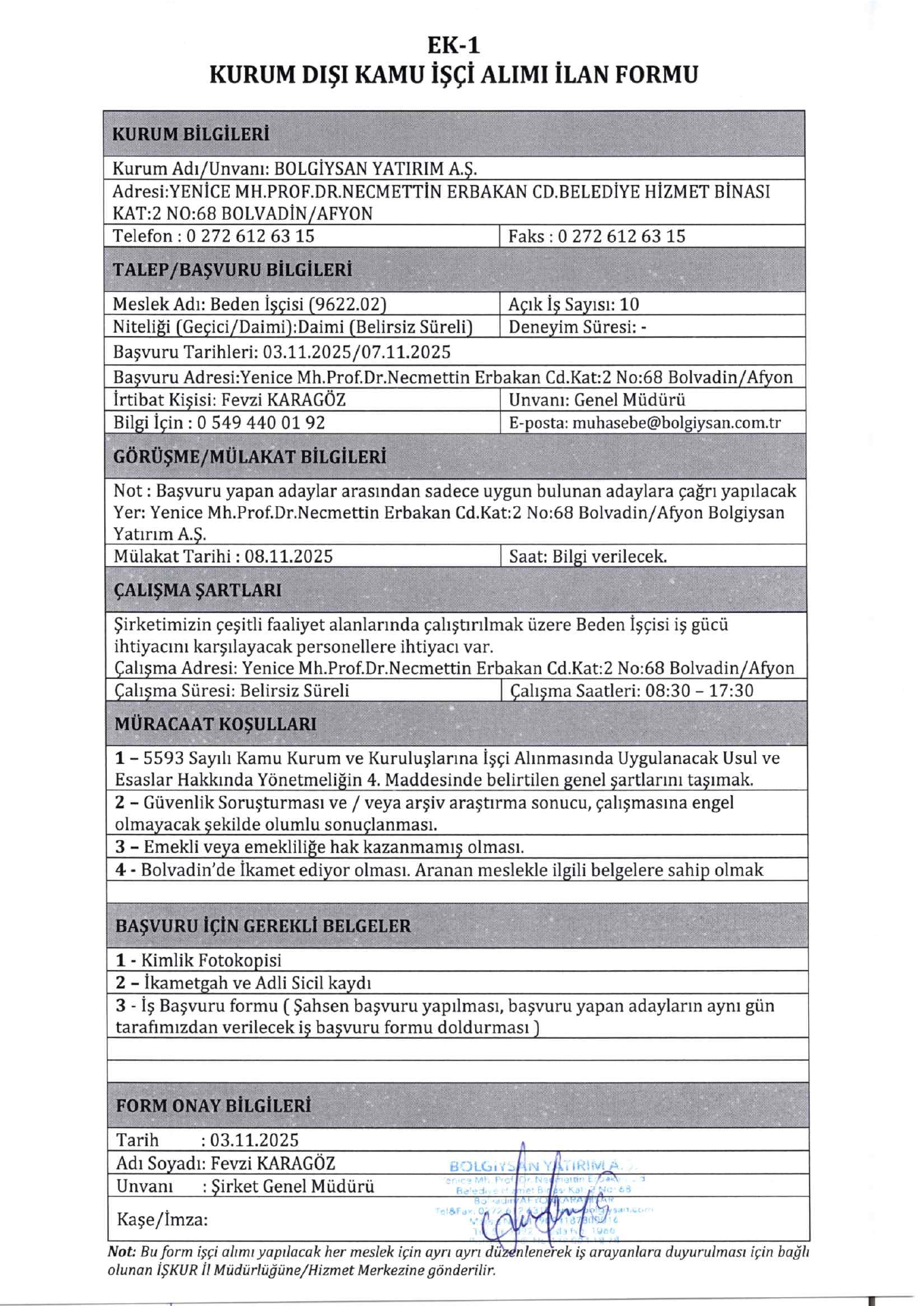 Ana sayfaDaimi İşçi İlanları Afyonkarahisar Bolgiysan 10 İşçi Alacak Afyonkarahisar Bolgiysan 10 İşçi Alacak. Son başvuru tarihi 7 Kasım 2025 Kaynak : İşkur İlan Giriş : 04 Kasım 2025 01:01, Son Güncelleme : 04 Kasım 2025 02:56 Yazdır Yorumlar (0) Abone Ol