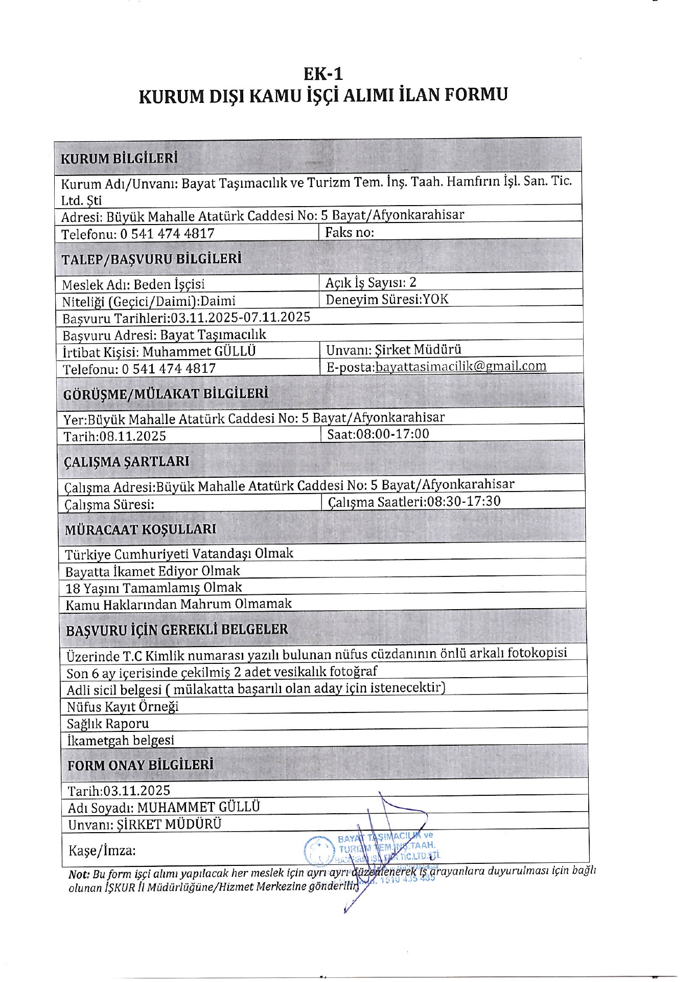 Afyonkarahisar Bayat Taşımacılık 2 İşçi Alacak. Son başvuru tarihi 7 Kasım 2025
